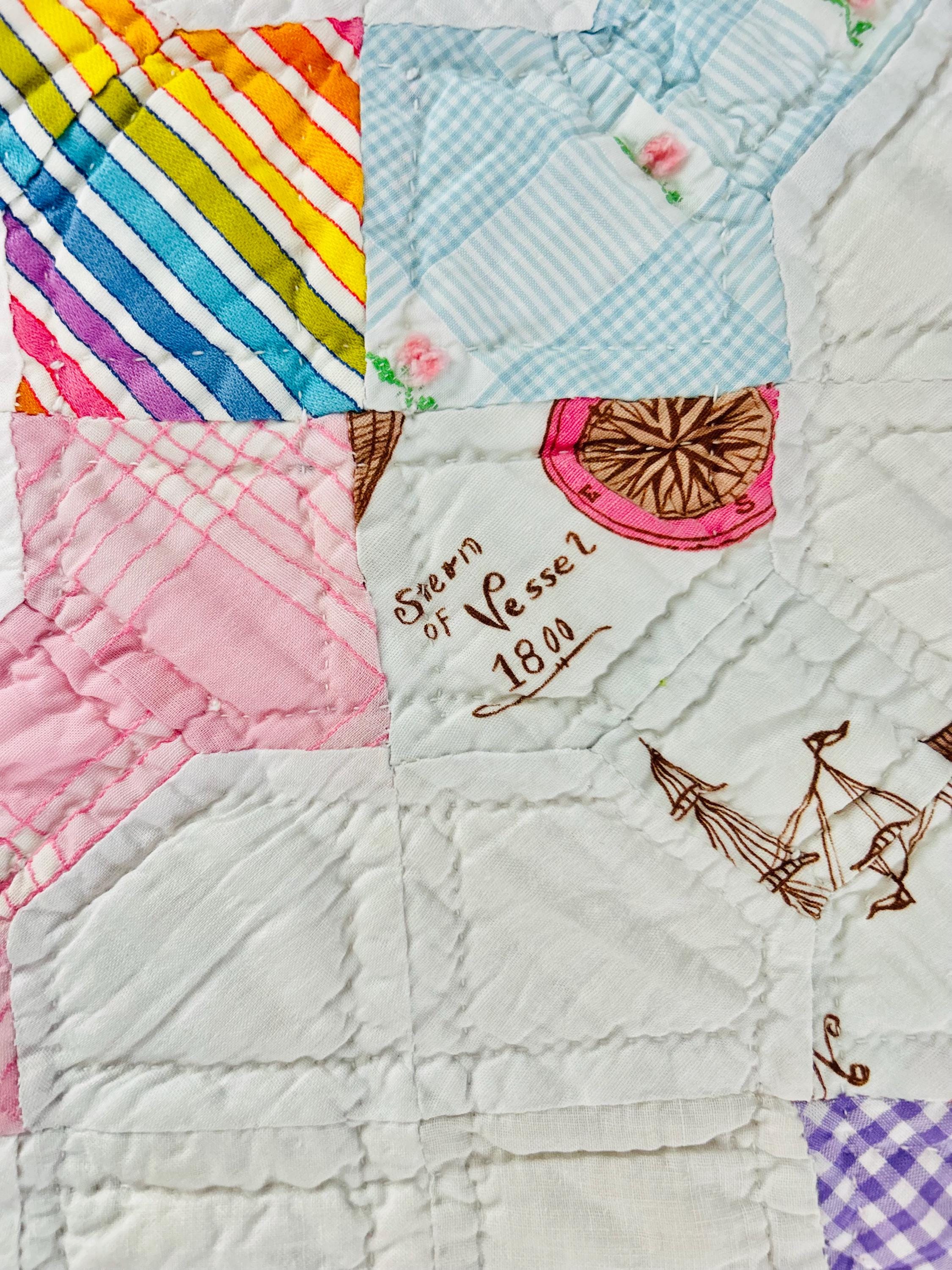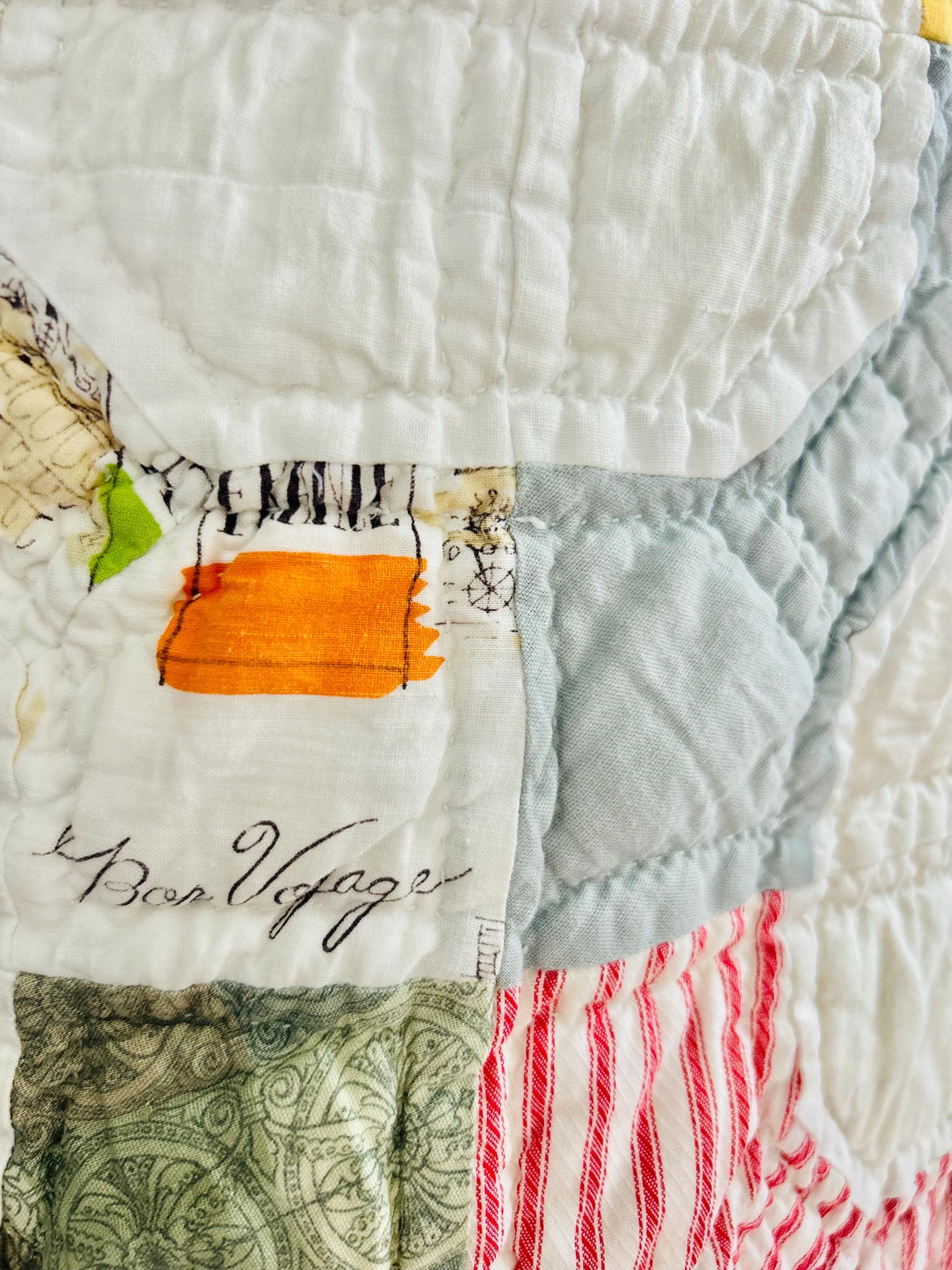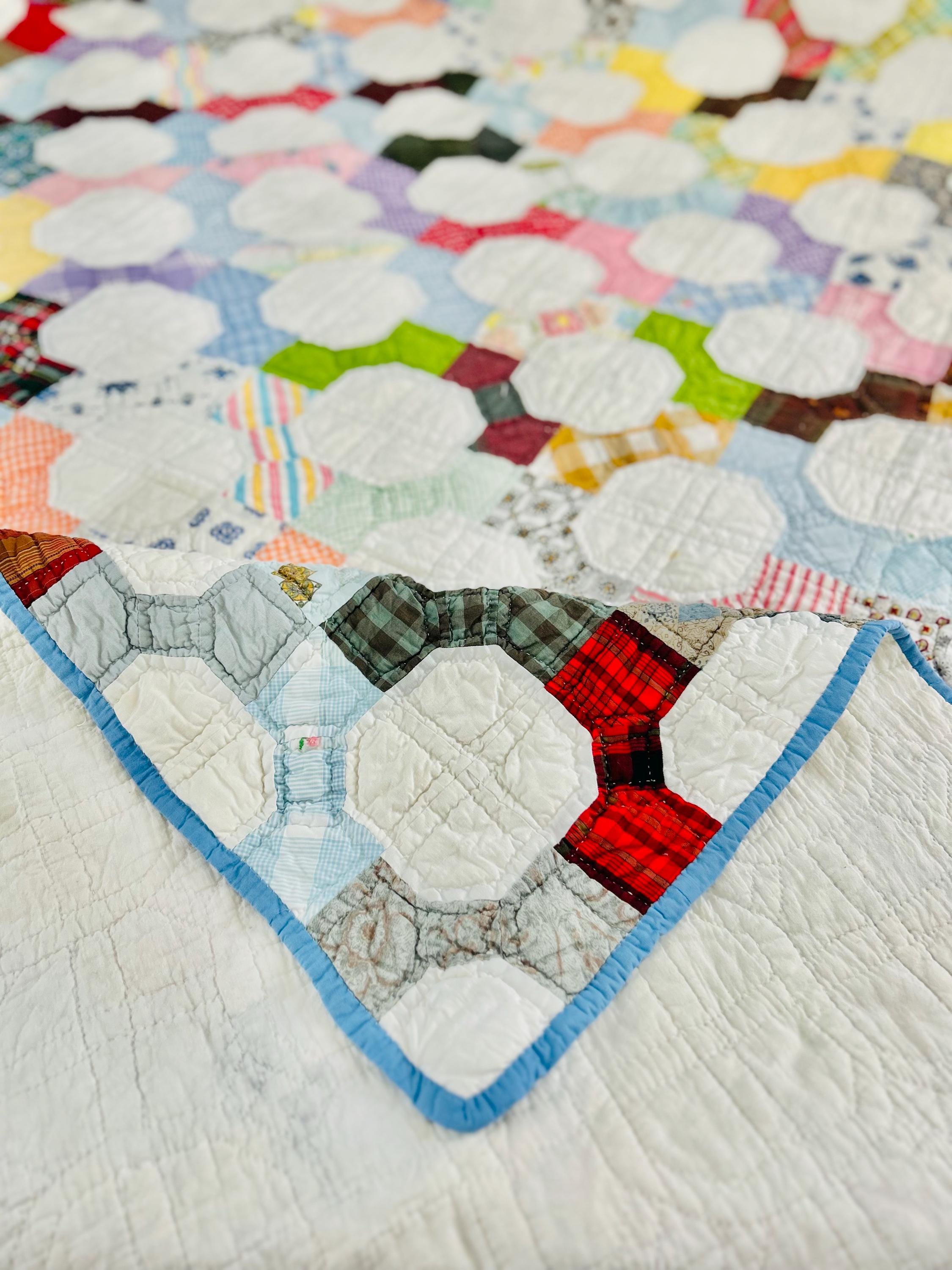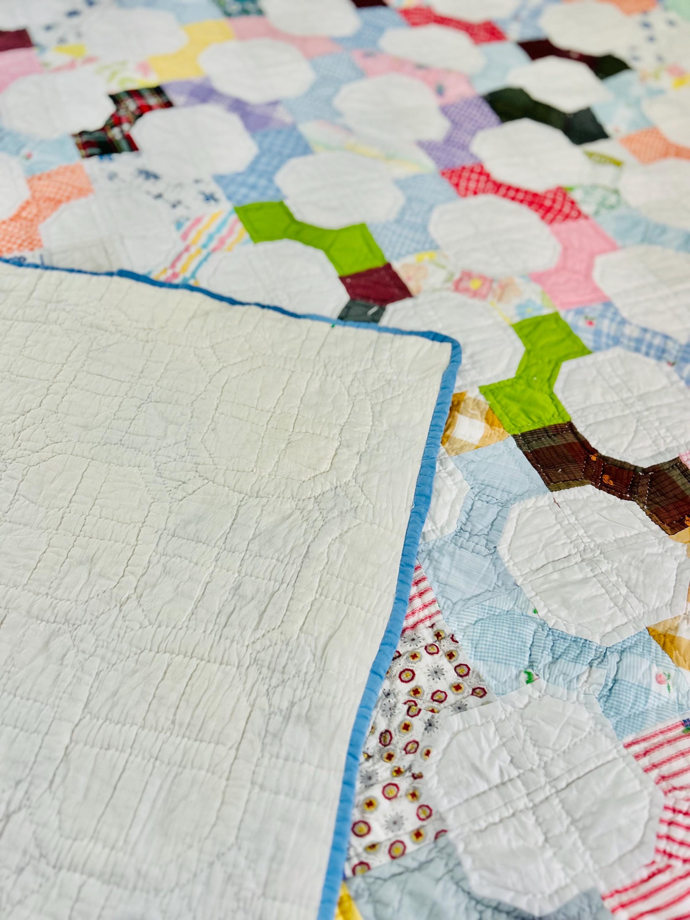 The back is white cotton, while the binding is blue cotton that has been machine stitched to the back and hand-stitched to the front. The cotton batting is lightweight.