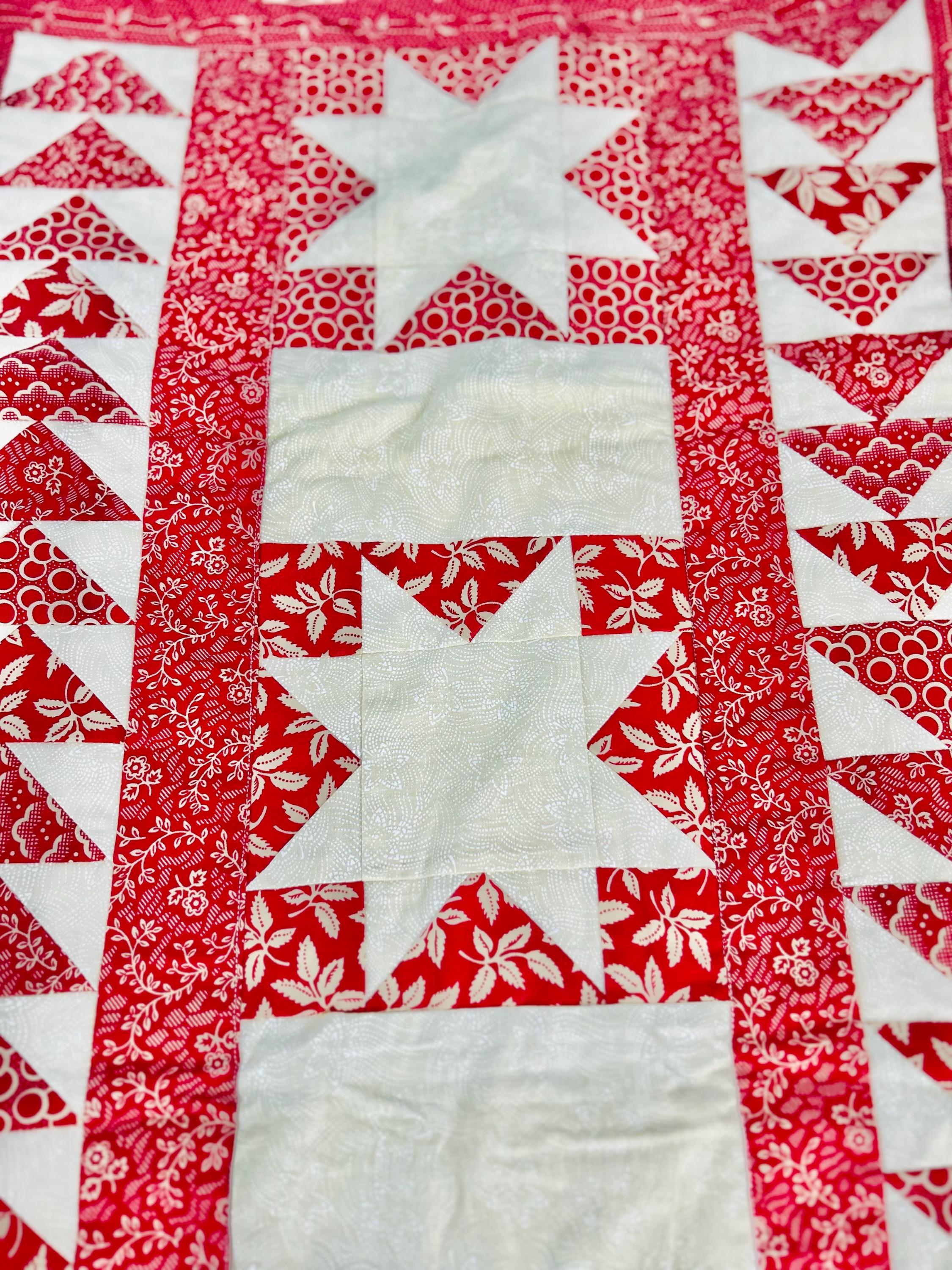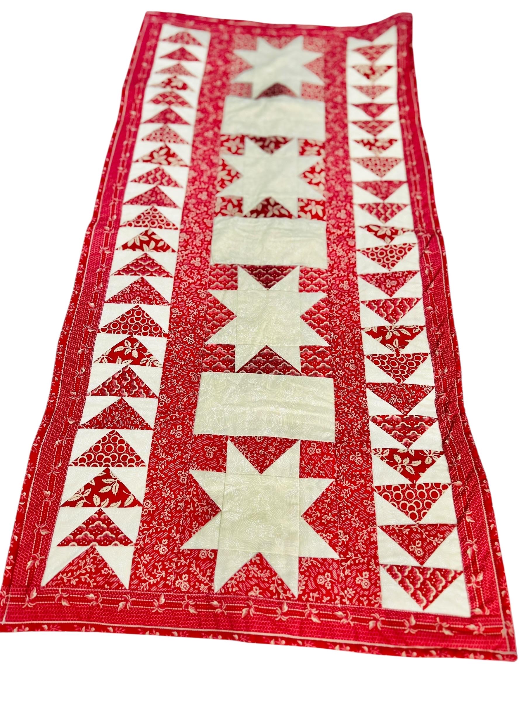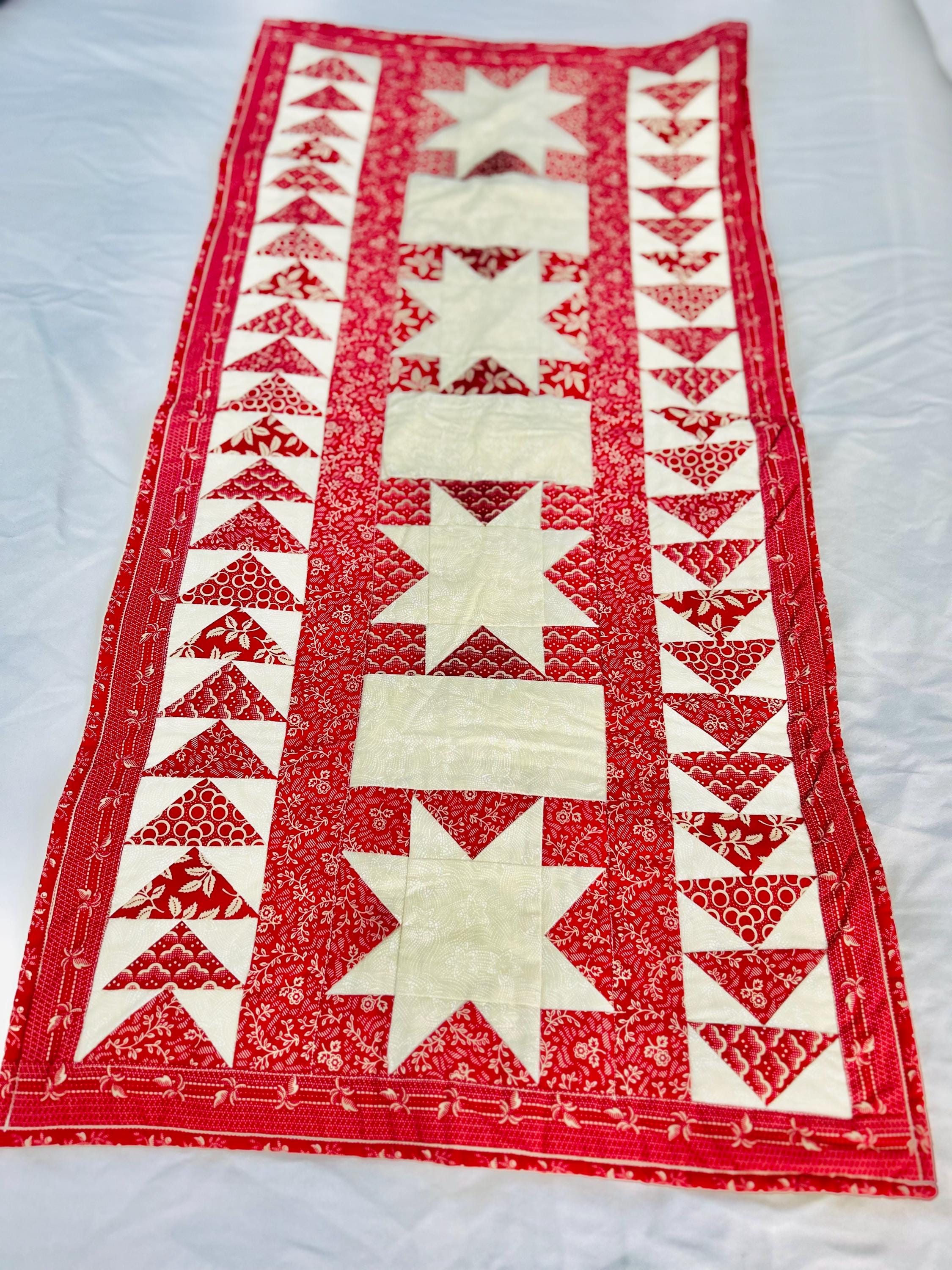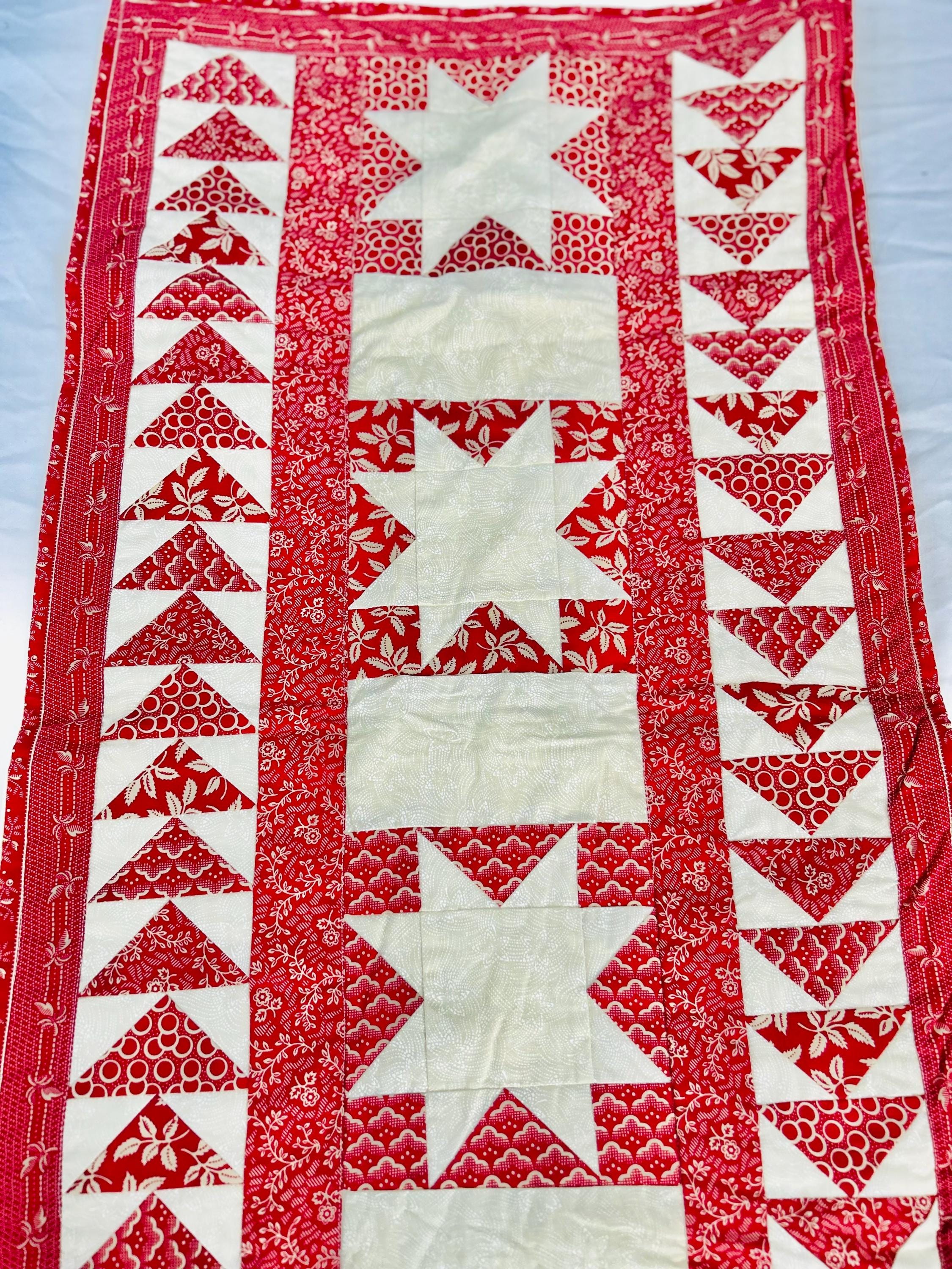 This is a Vintage Star Table Runner or Table Mat that has been machine quilted and pieced from very high-quality cottons. It is signed and dated 2003. The back is the same off-white star pattern used on the front and the batting is lightweight.