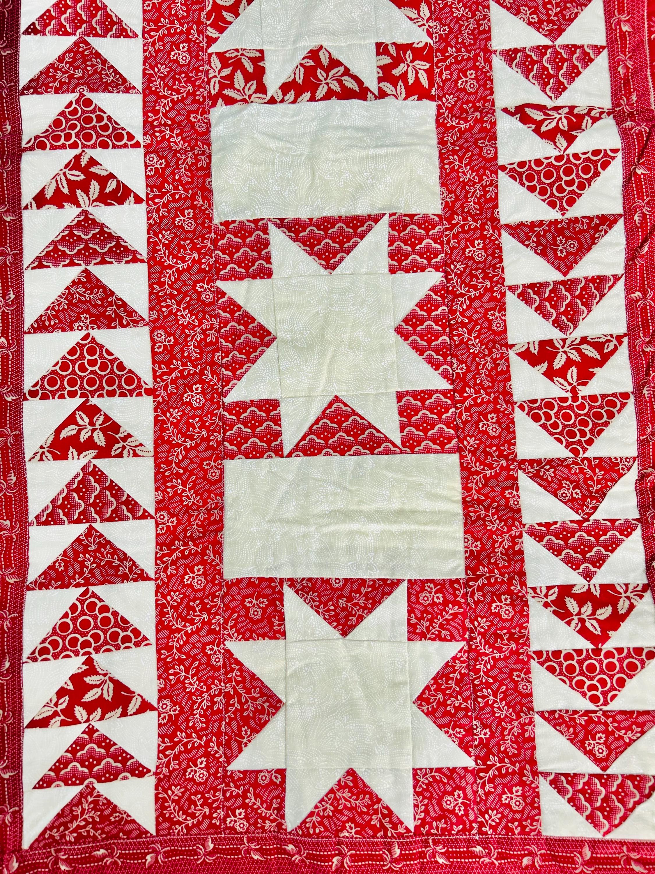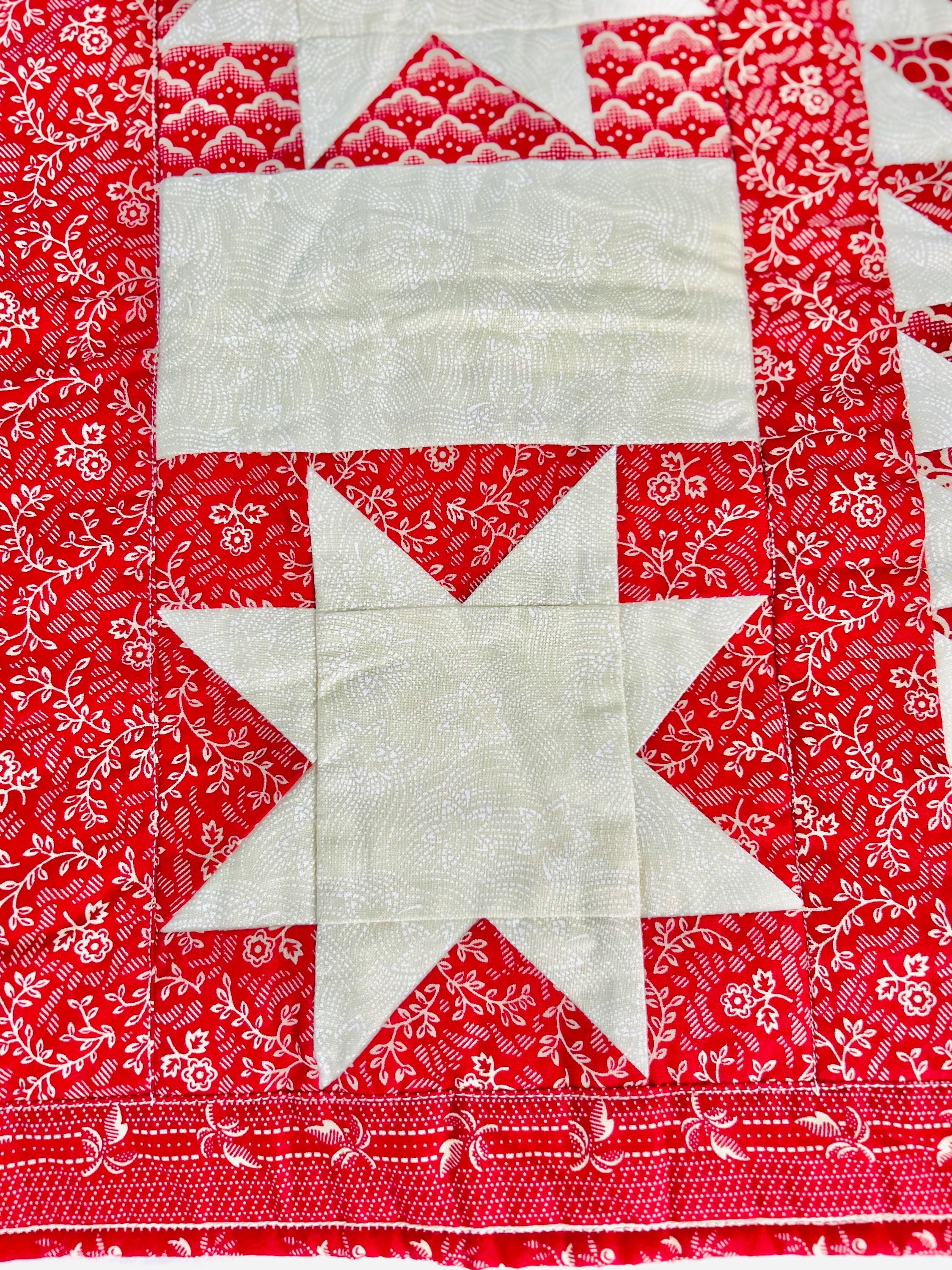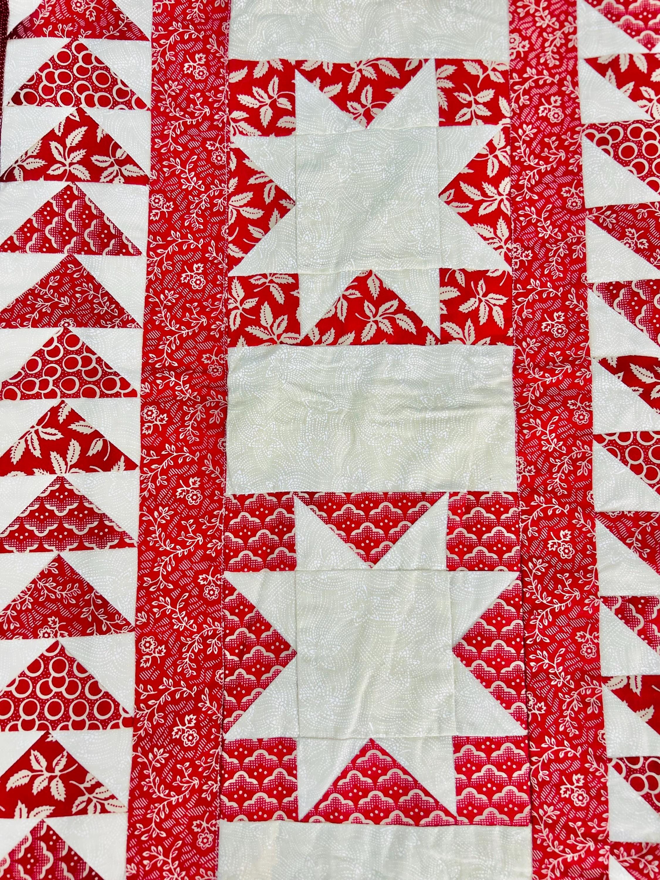 This is a Vintage Star Table Runner or Table Mat that has been machine quilted and pieced from very high-quality cottons. It is signed and dated 2003. The back is the same off-white star pattern used on the front and the batting is lightweight.