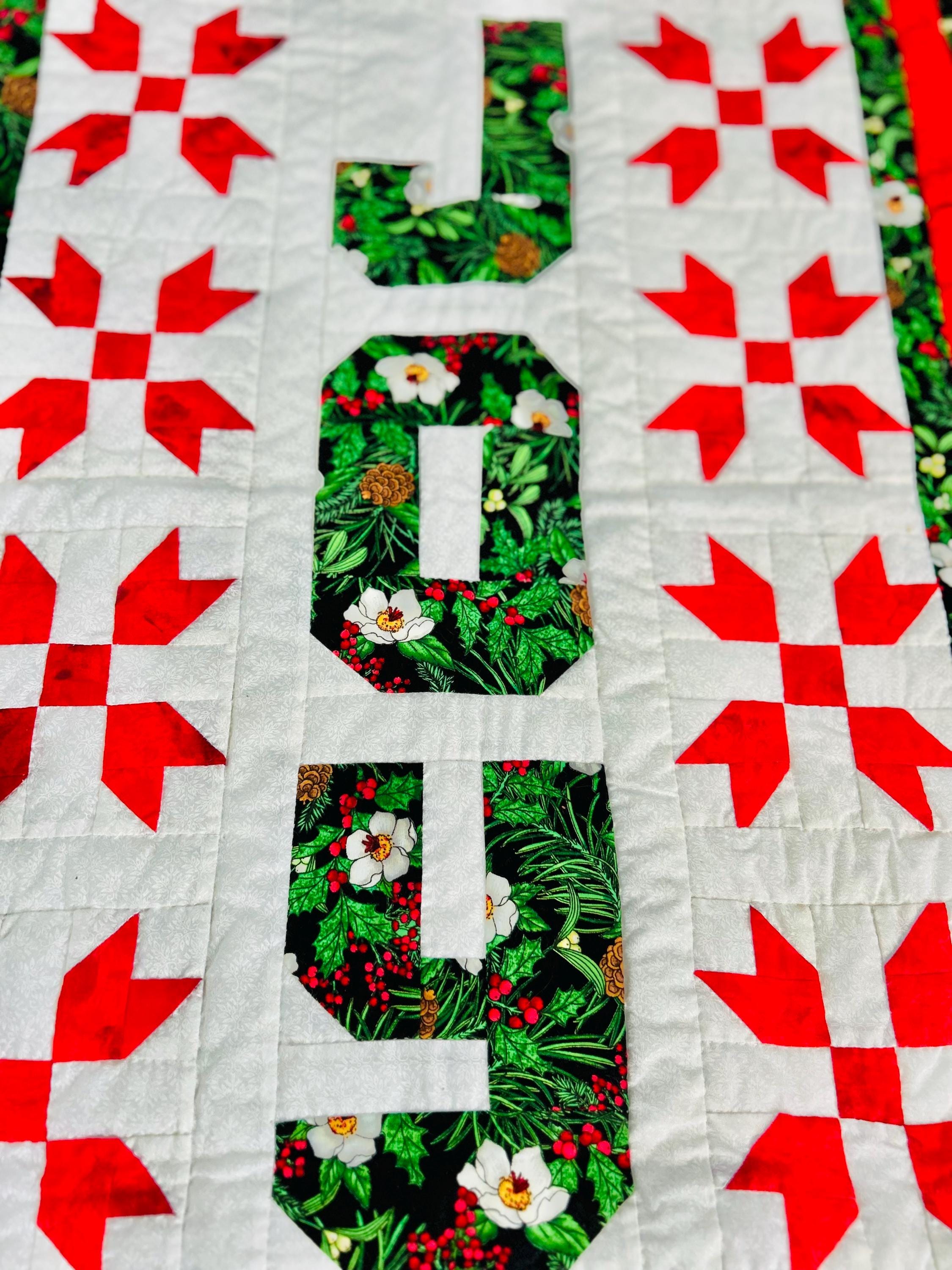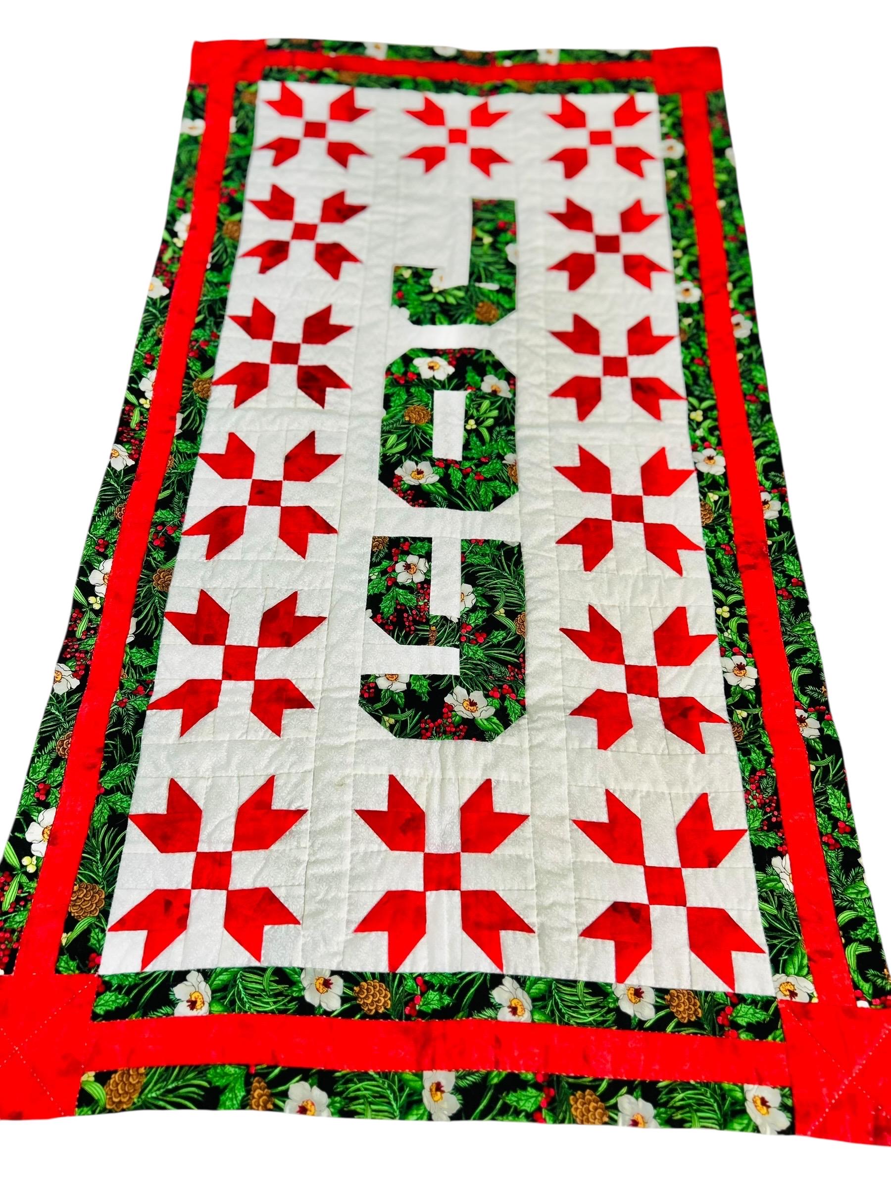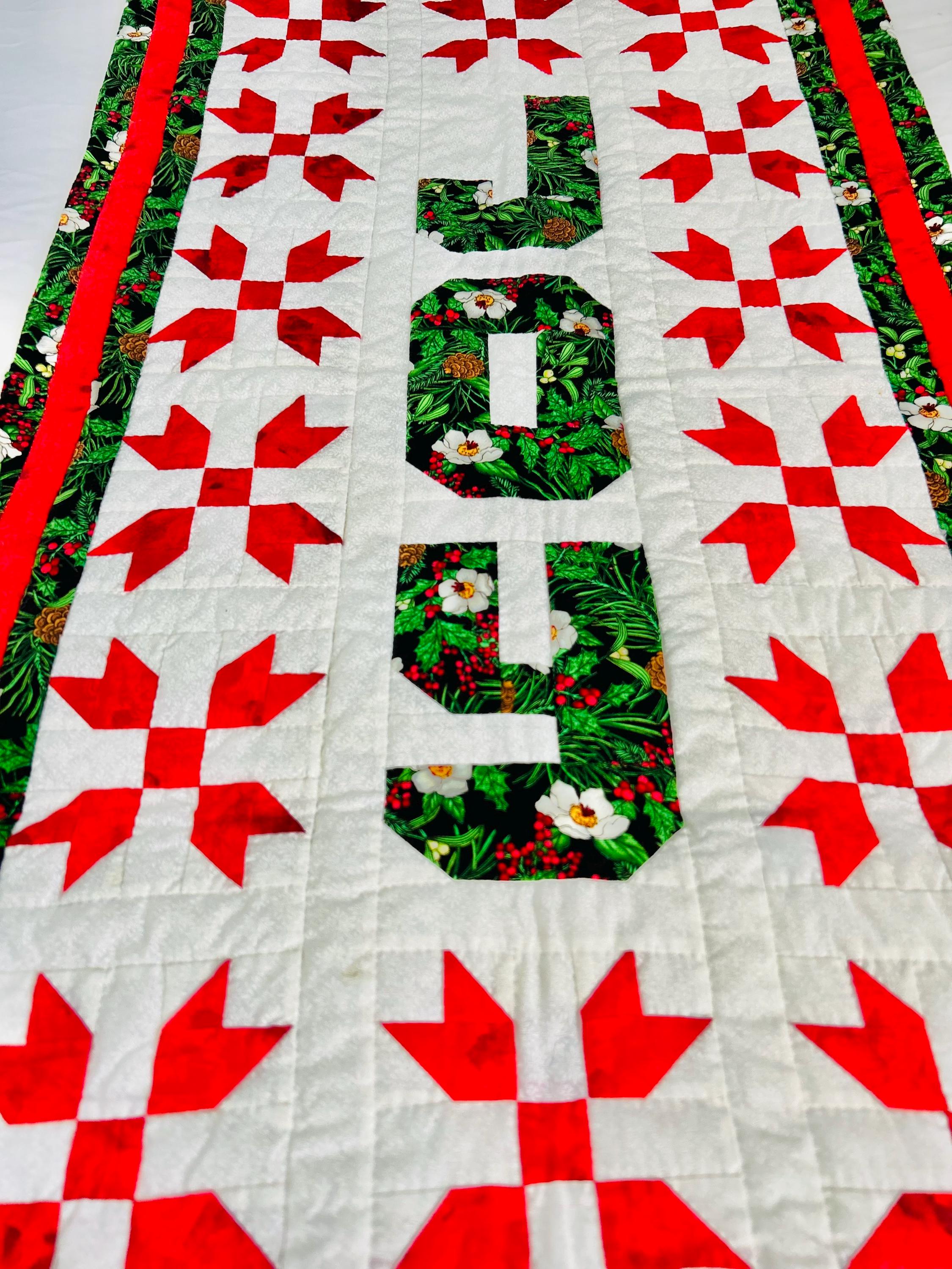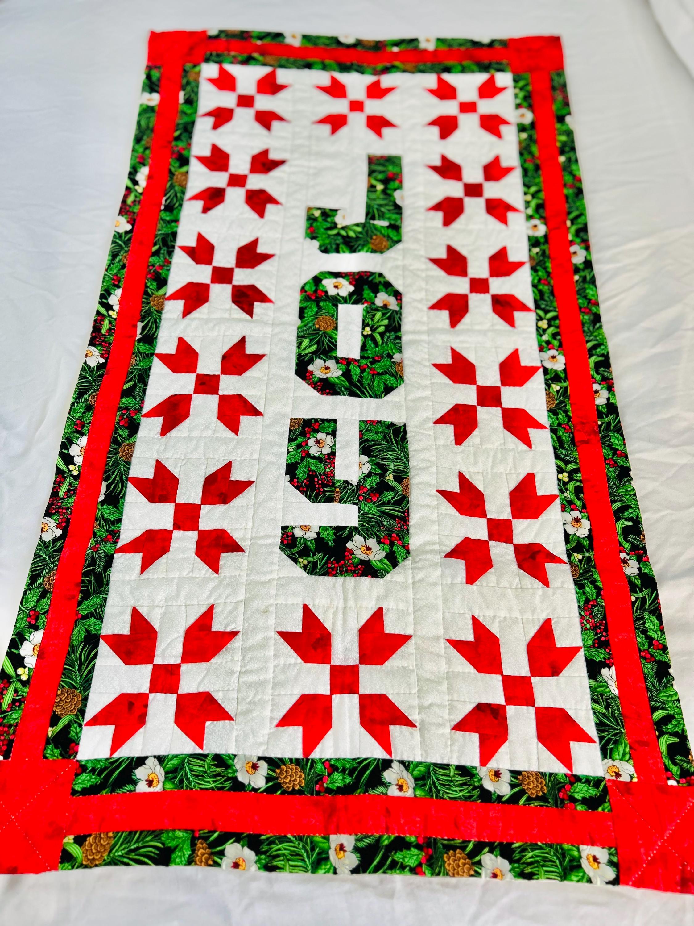 Vintage Holiday "JOY" Table Runner or accent piece made from high quality cottons with display sleeve sewn into the back. It has been machine pieced and quilted. The batting is lightweight.