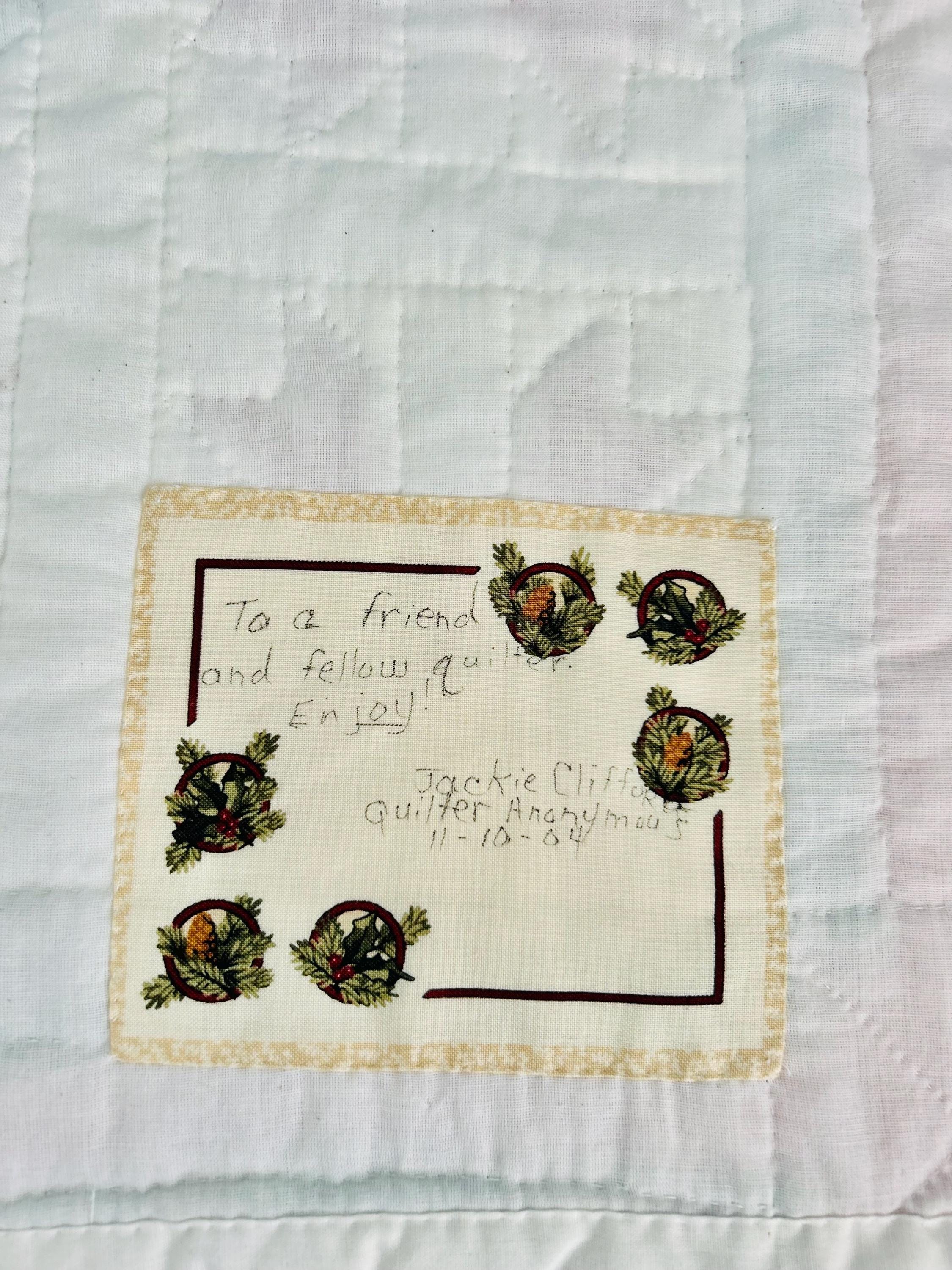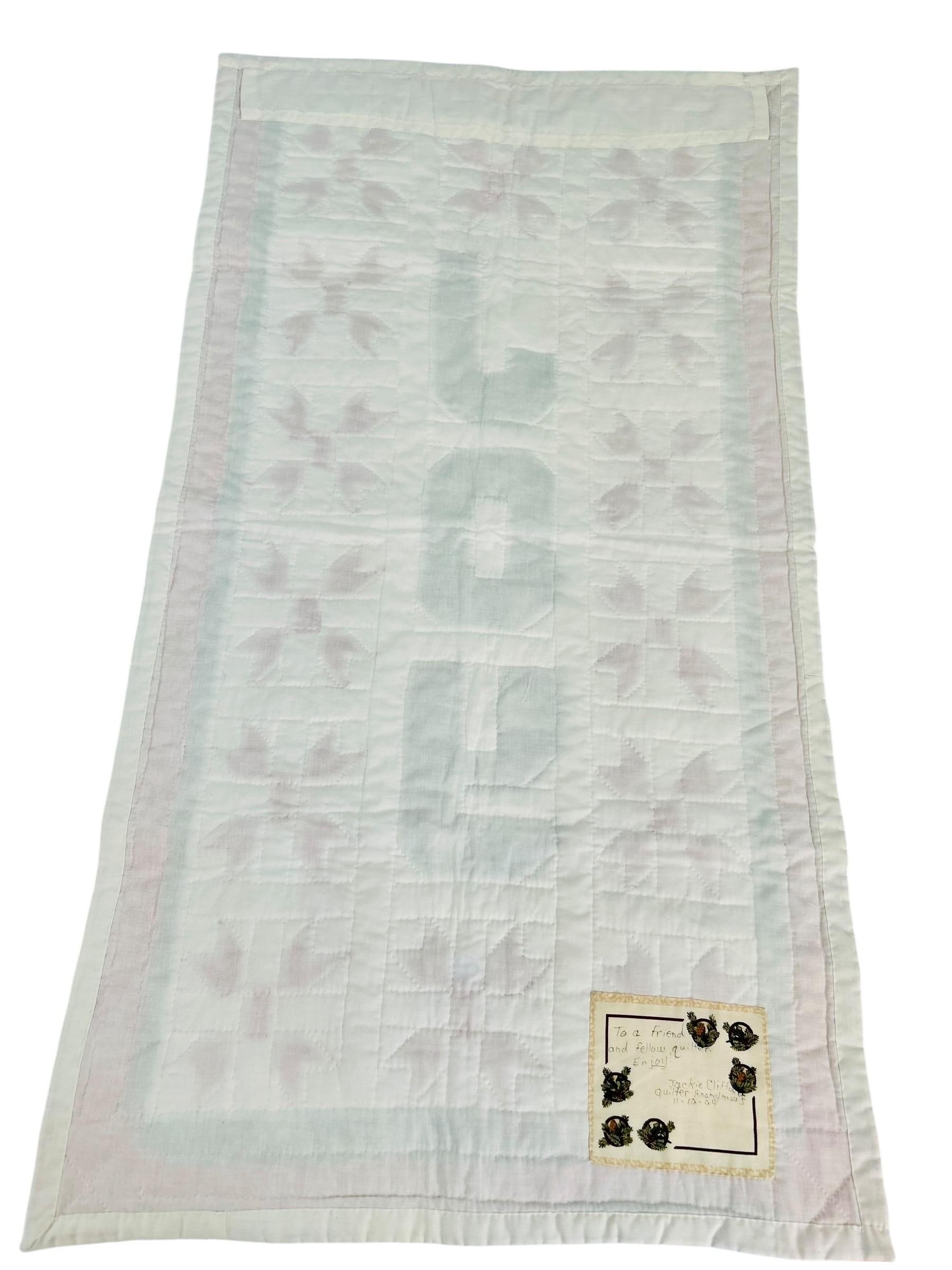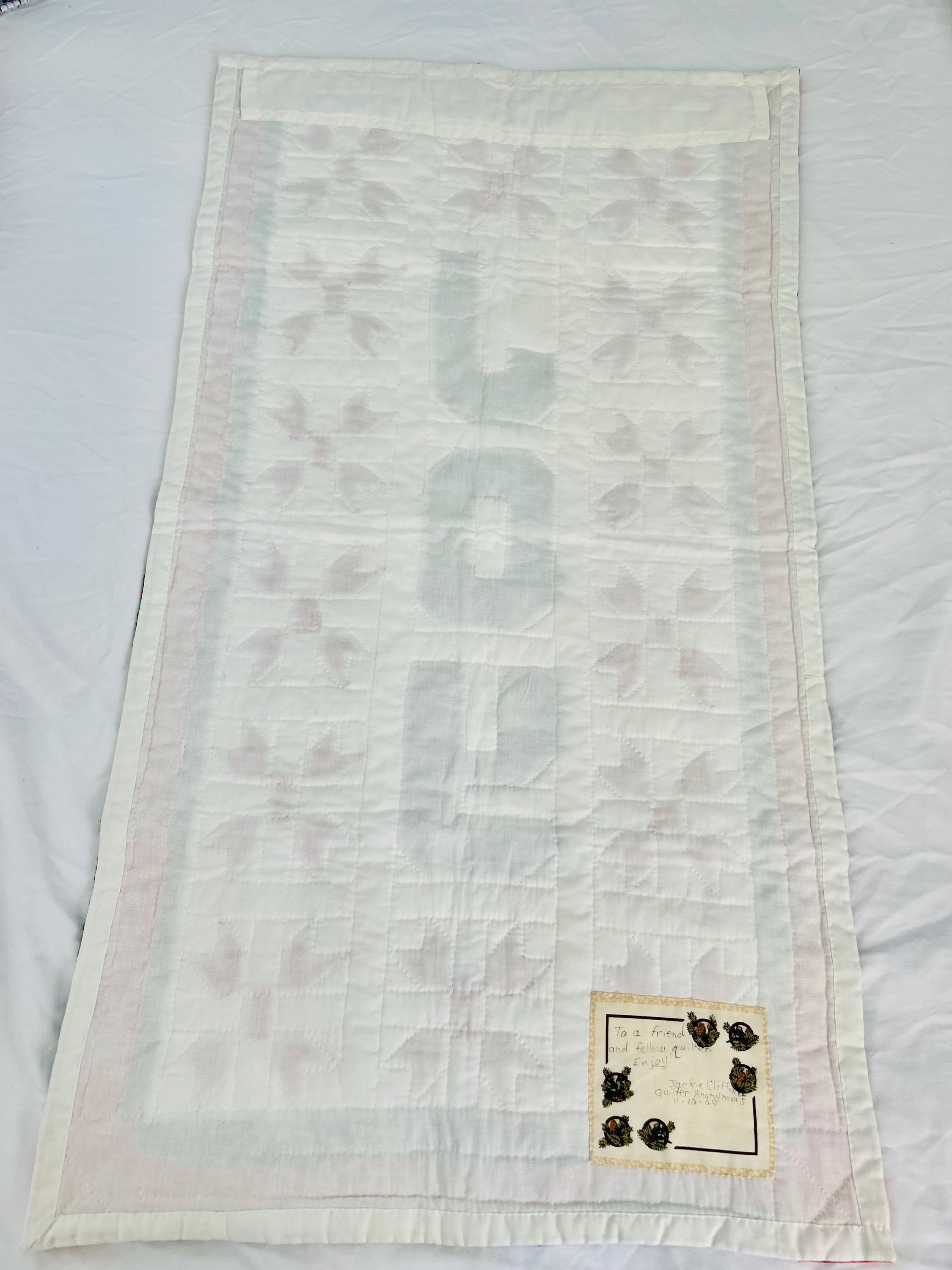 It is approximately 23 inches by 26.5 inches and has a display sleeve sewn into the back.
