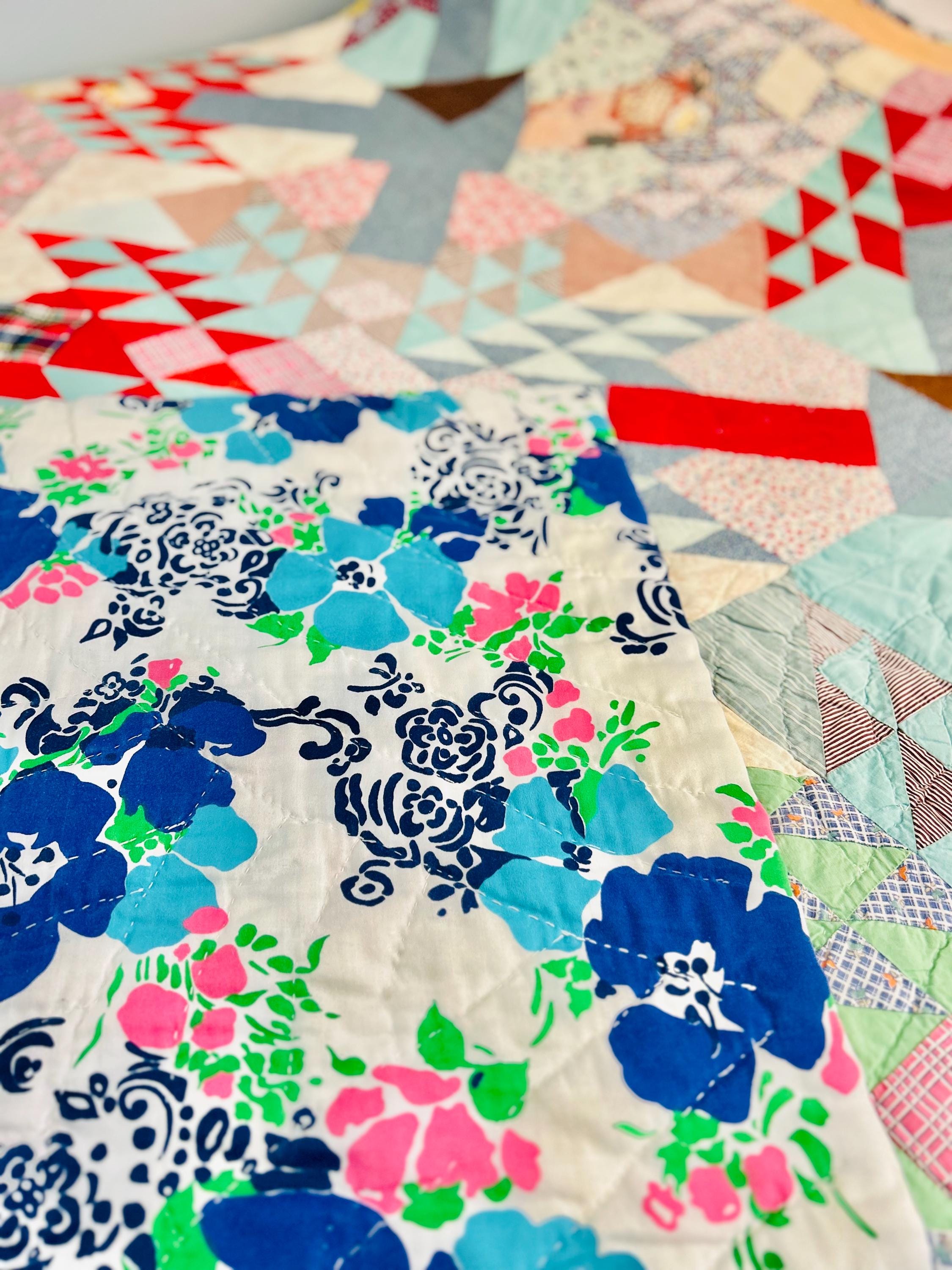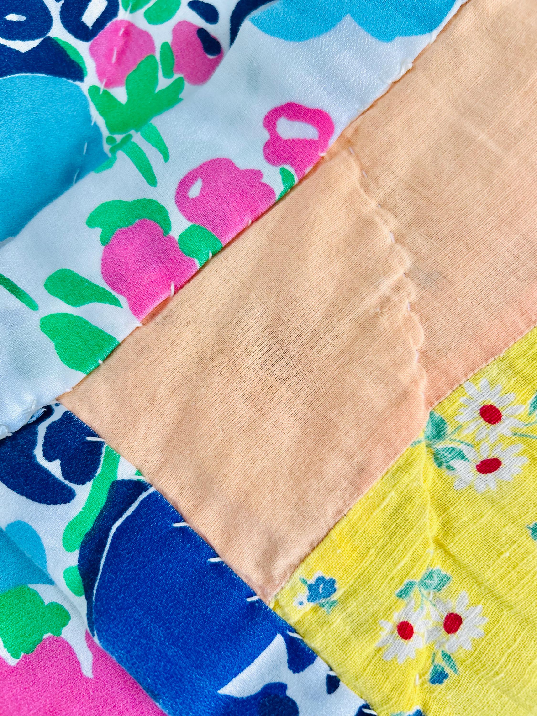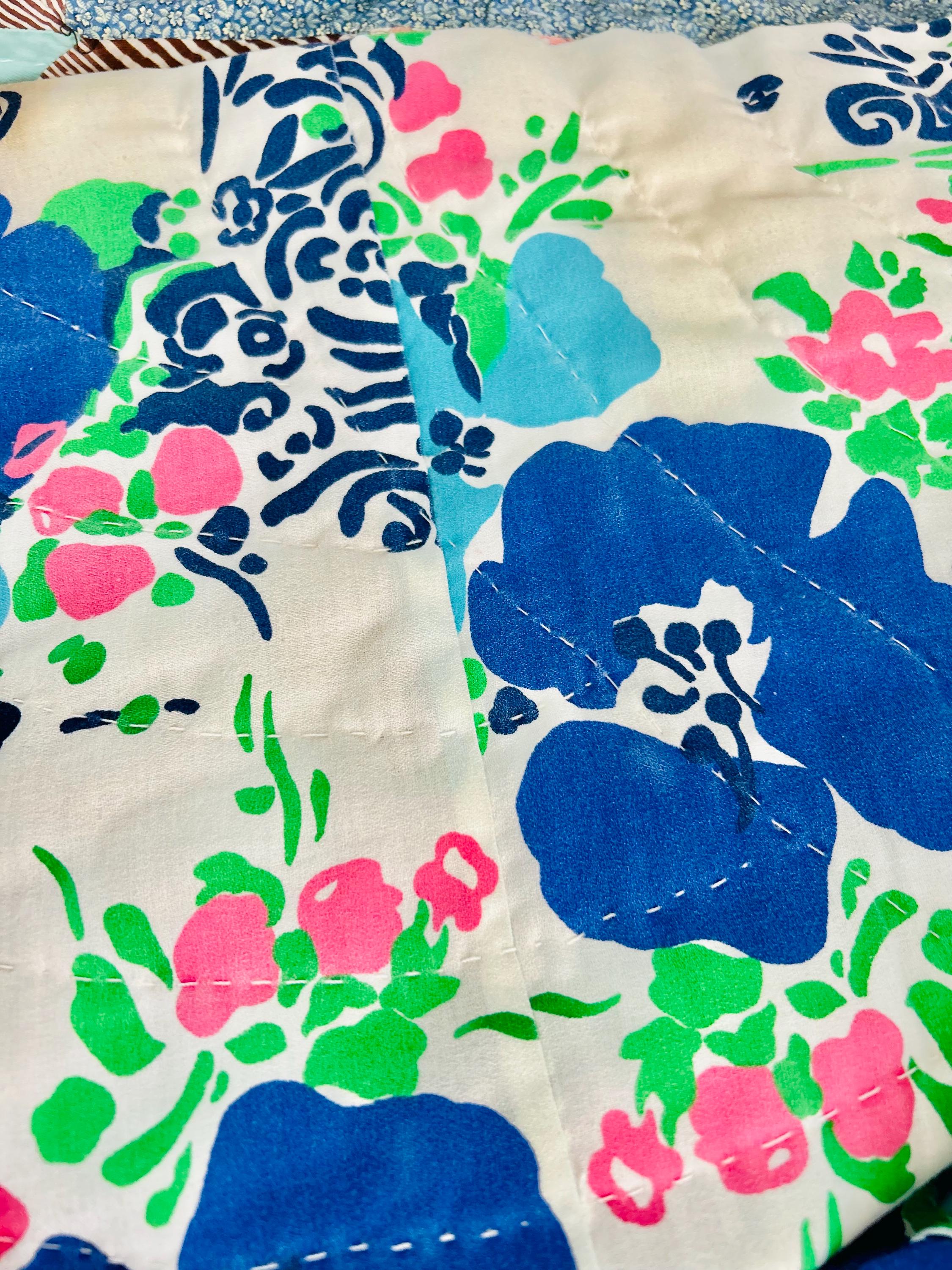 The back is a bold blue, white, pink, teal and green floral print that has been turned to the front and hand-stitched to form the binding. The cotton batting is lightweight.