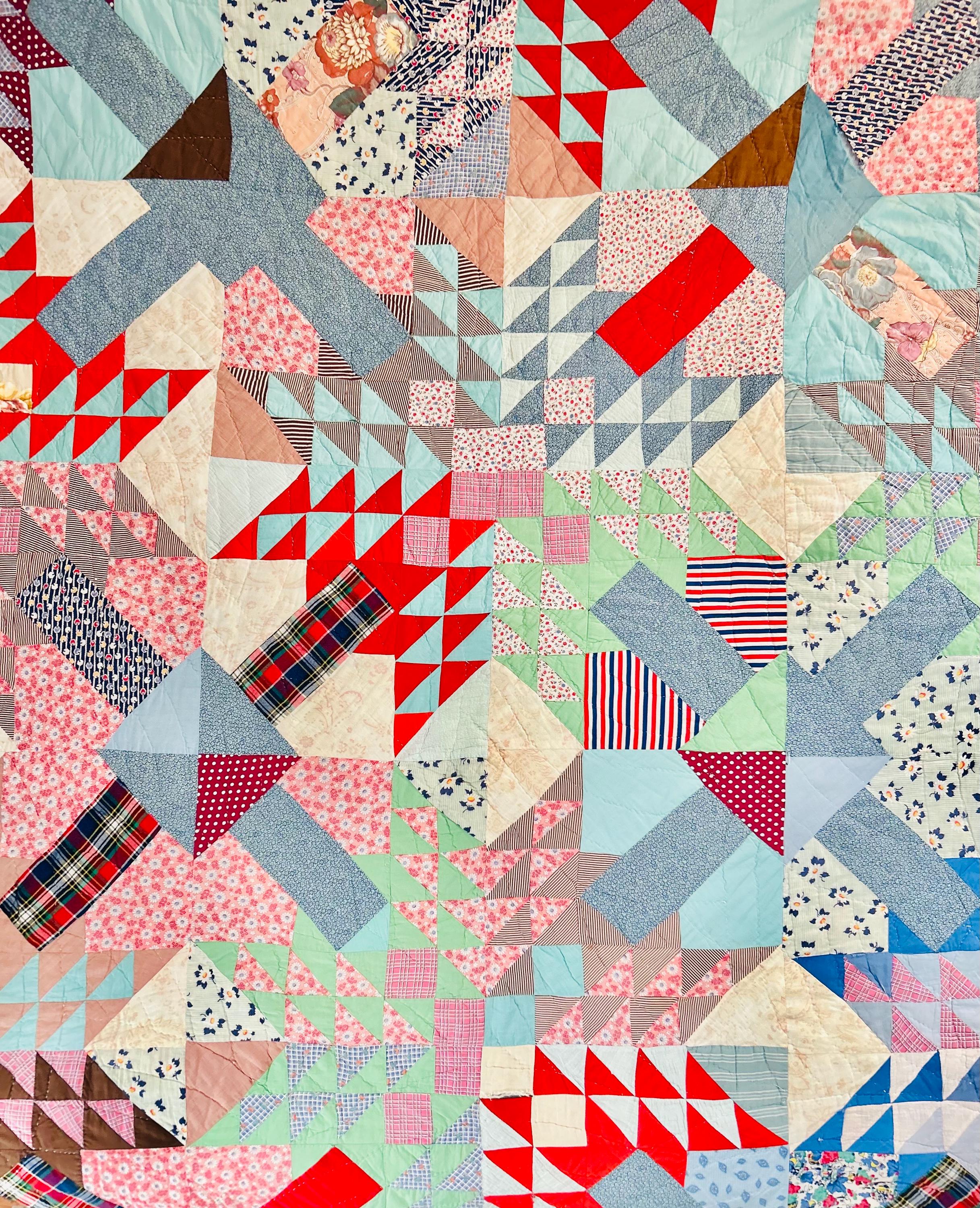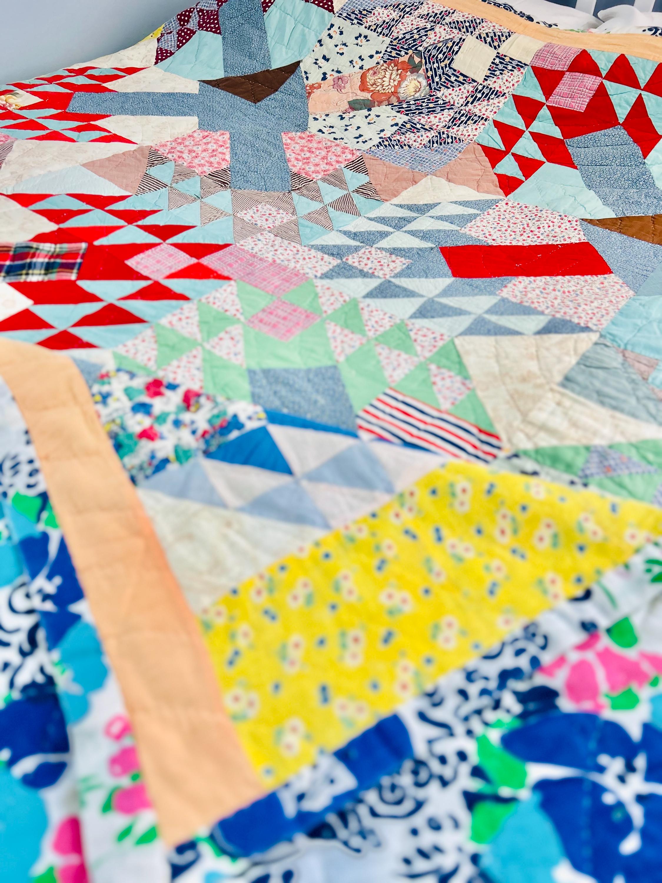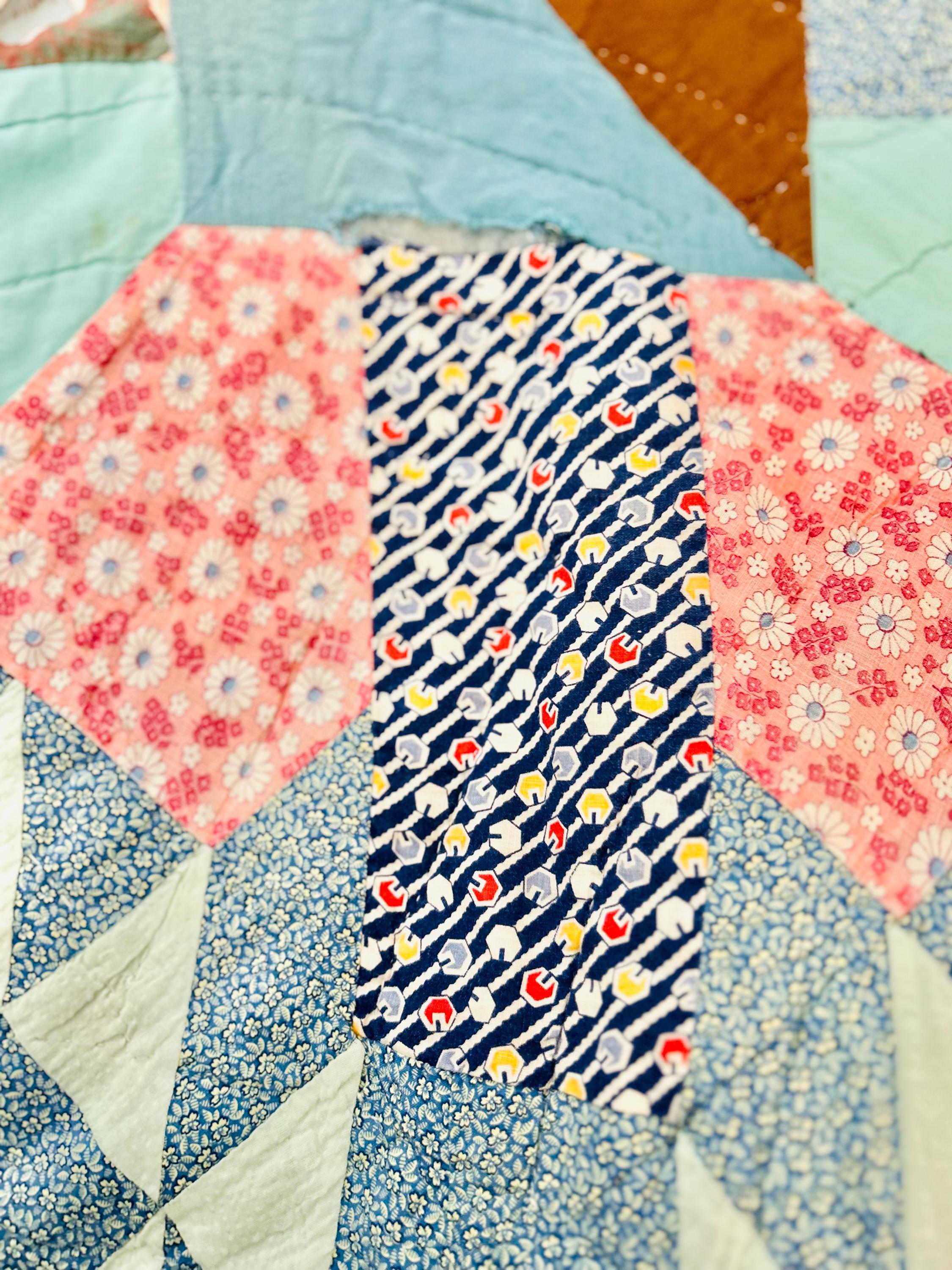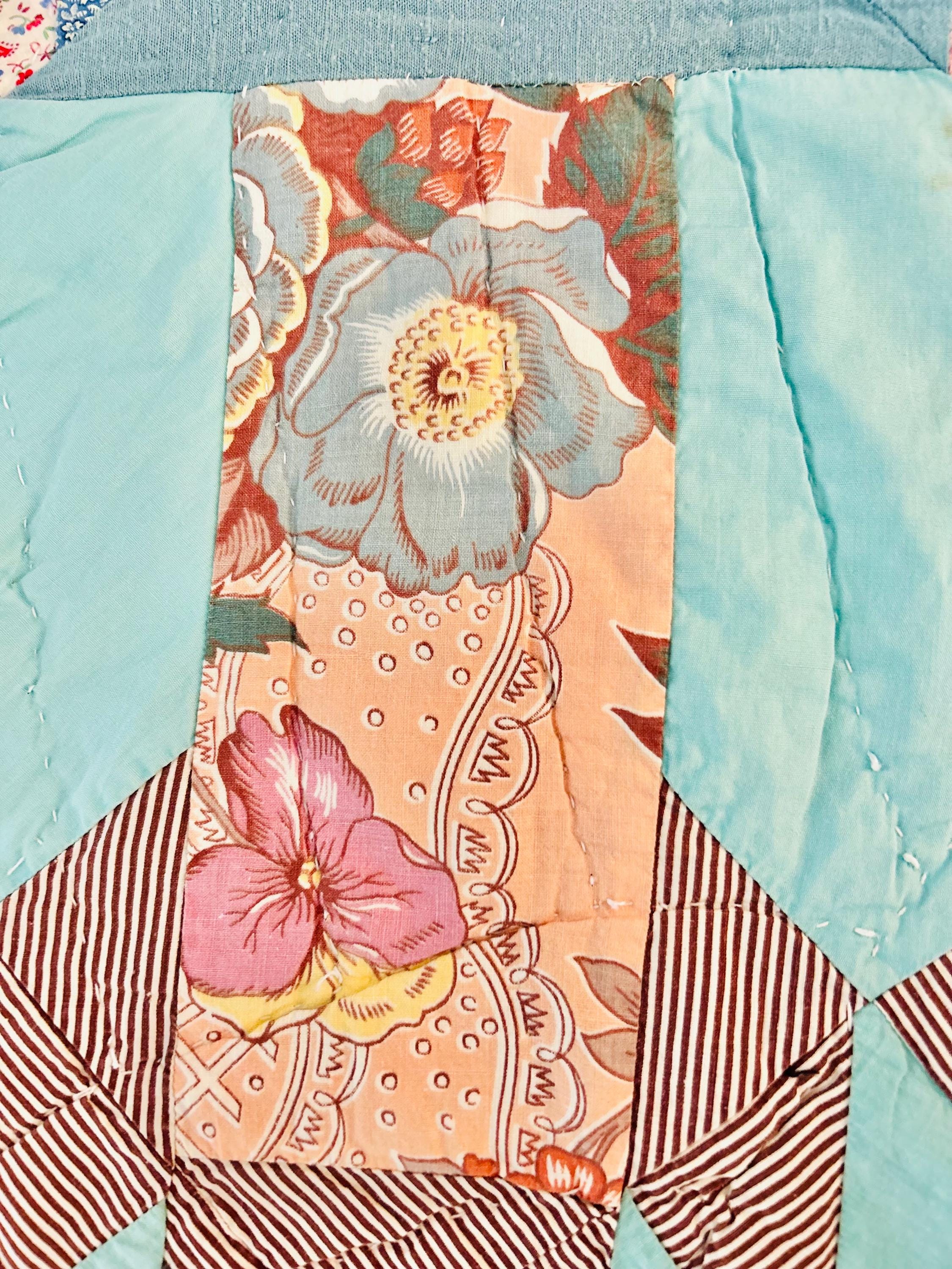 The back is a bold blue, white, pink, teal and green floral print that has been turned to the front and hand-stitched to form the binding. The cotton batting is lightweight.