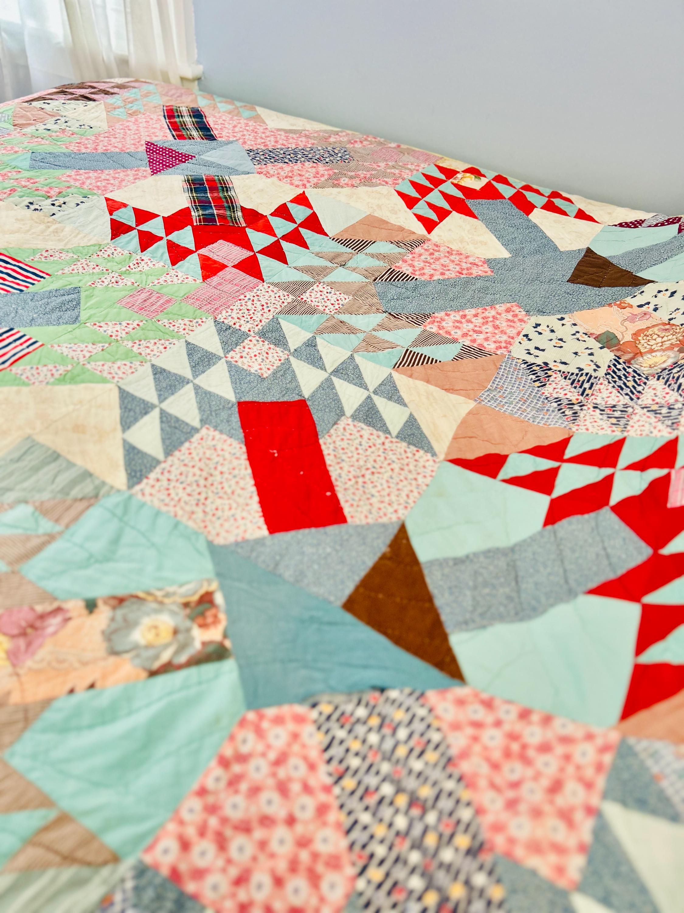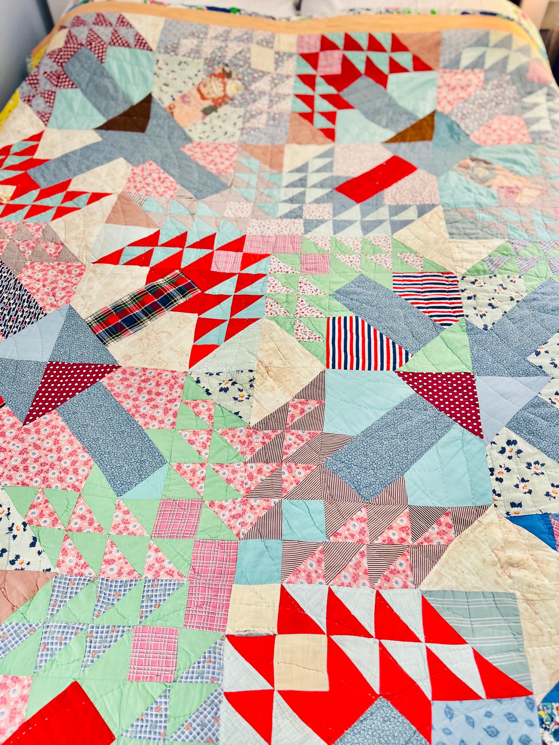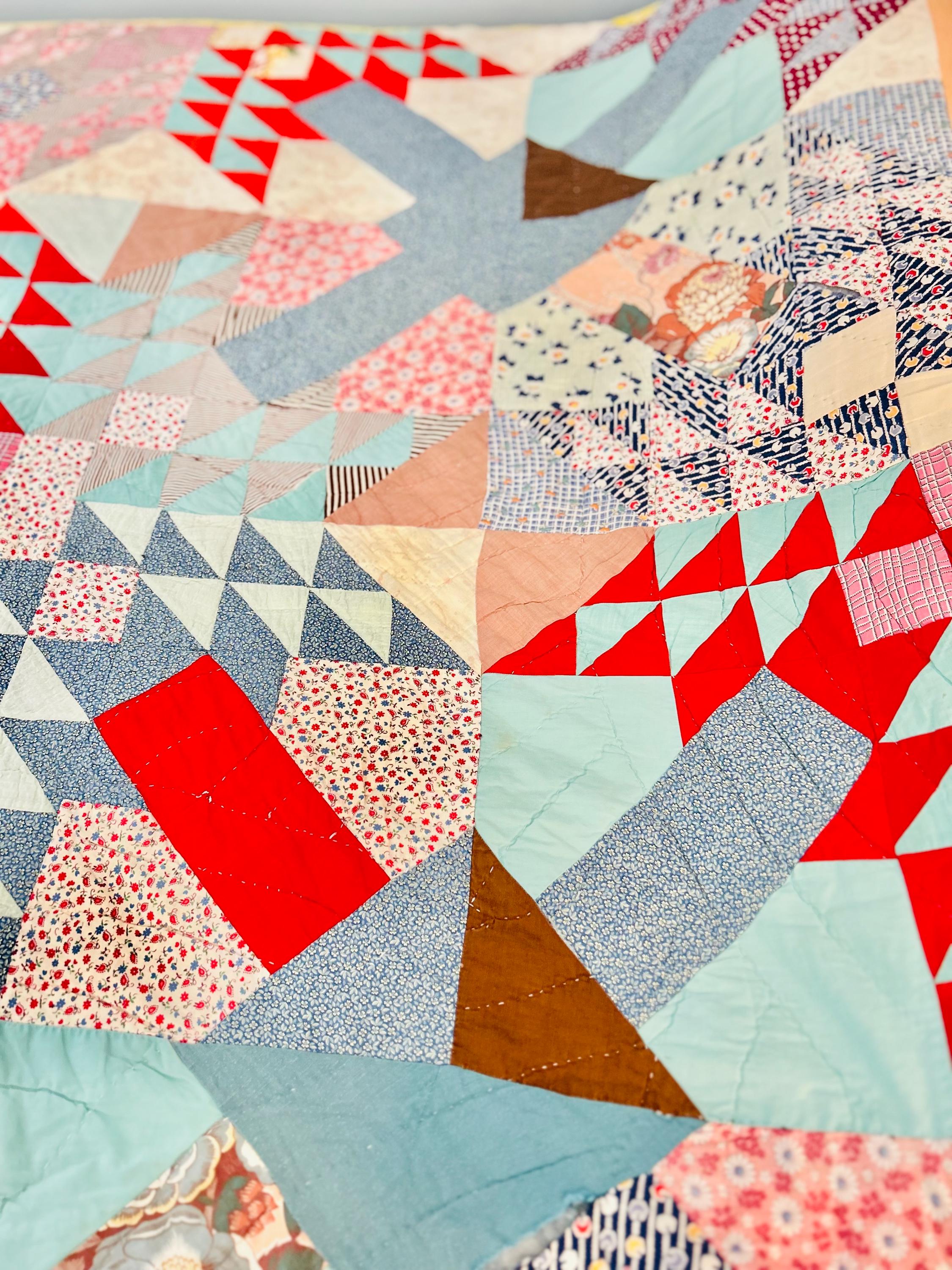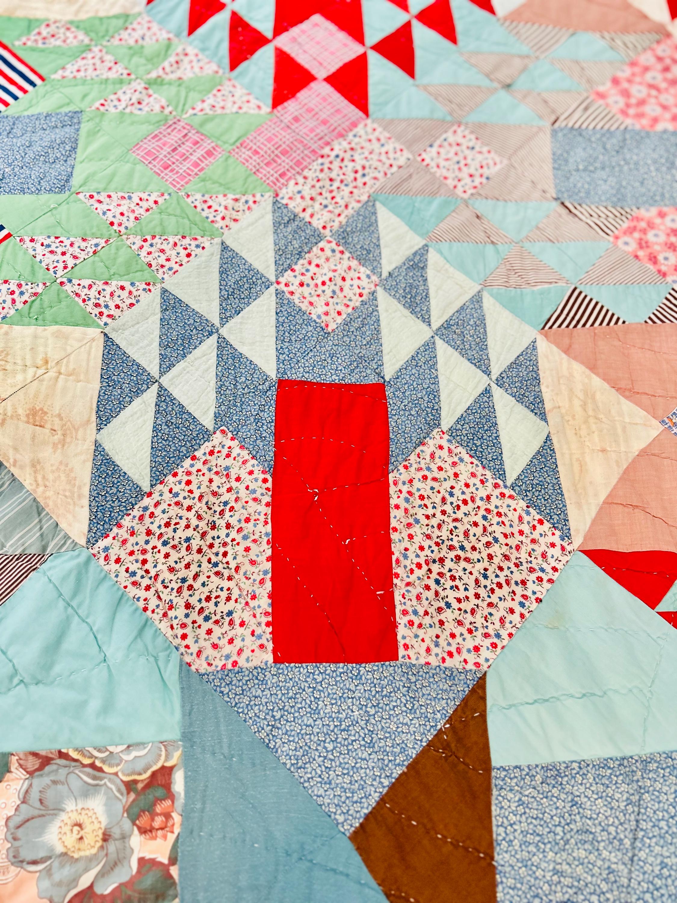 This lively Tree of Paradise Quilt is circa 1930s-1940s and has been pieced from a variety of eclectic blue, red, green, pink and yellow florals and bordered on all four sides by a yellow and red flower border. It is hand-quilted in arches and shells.