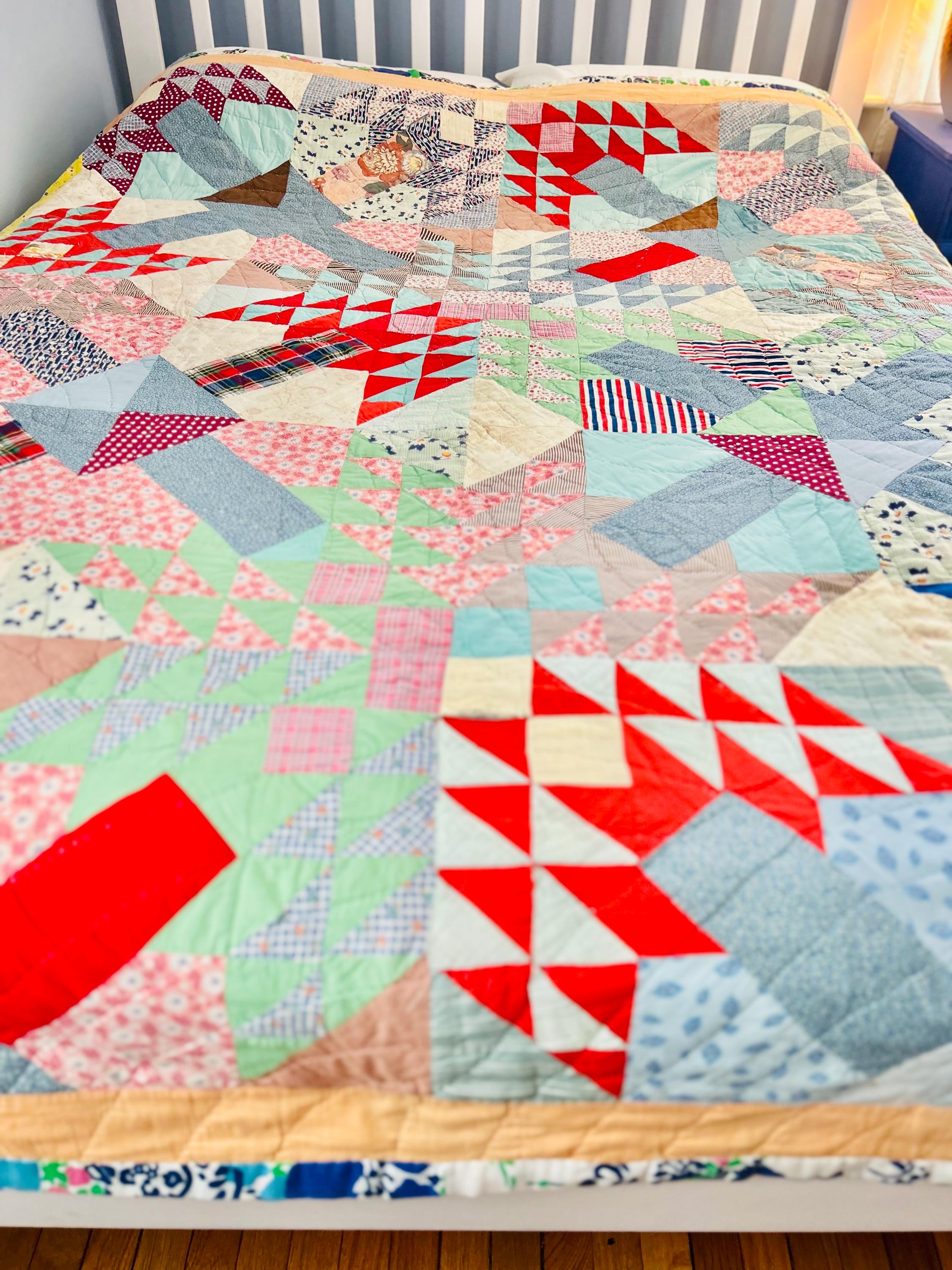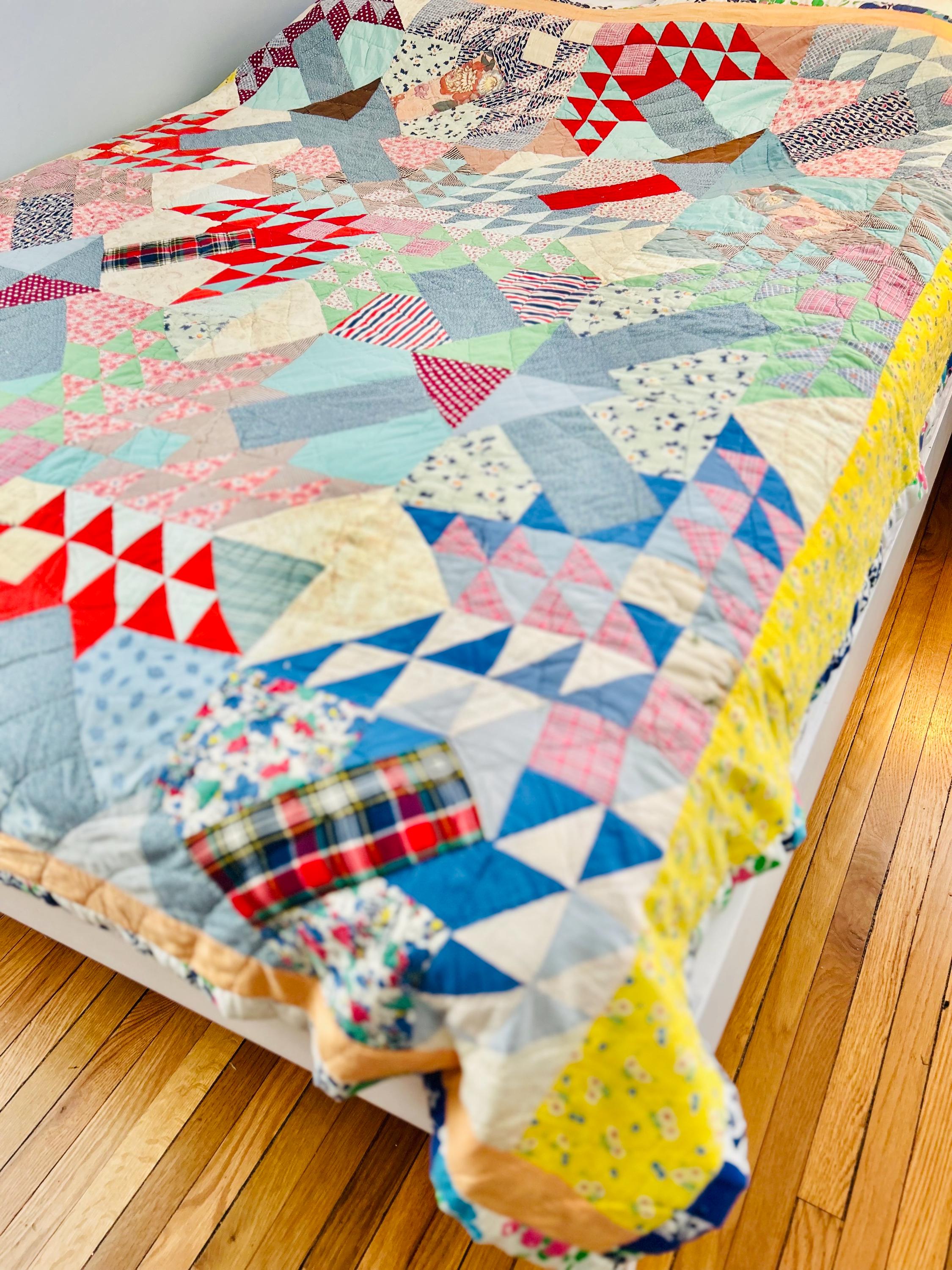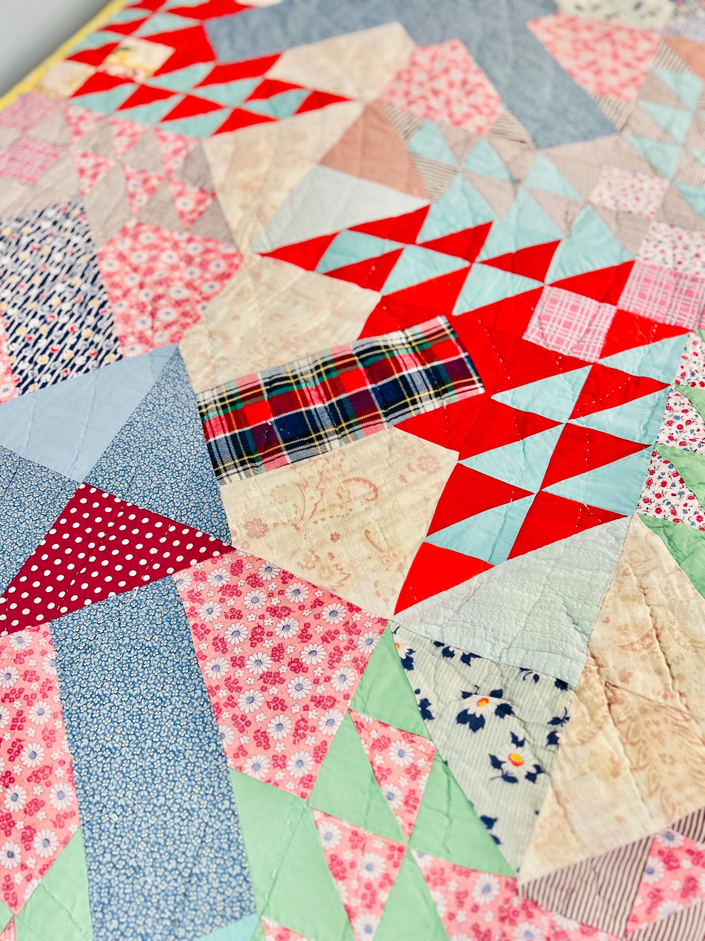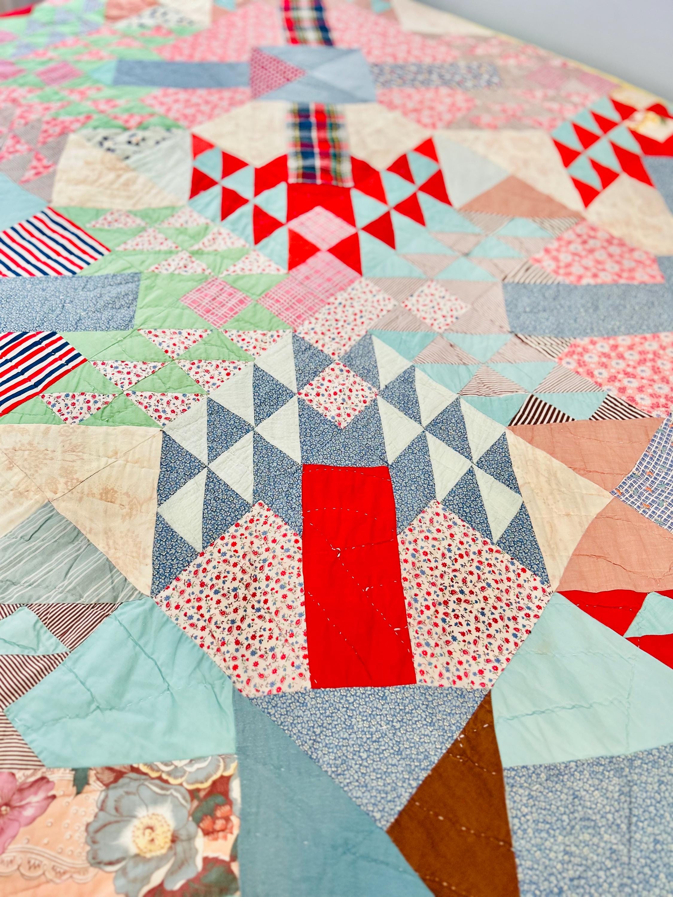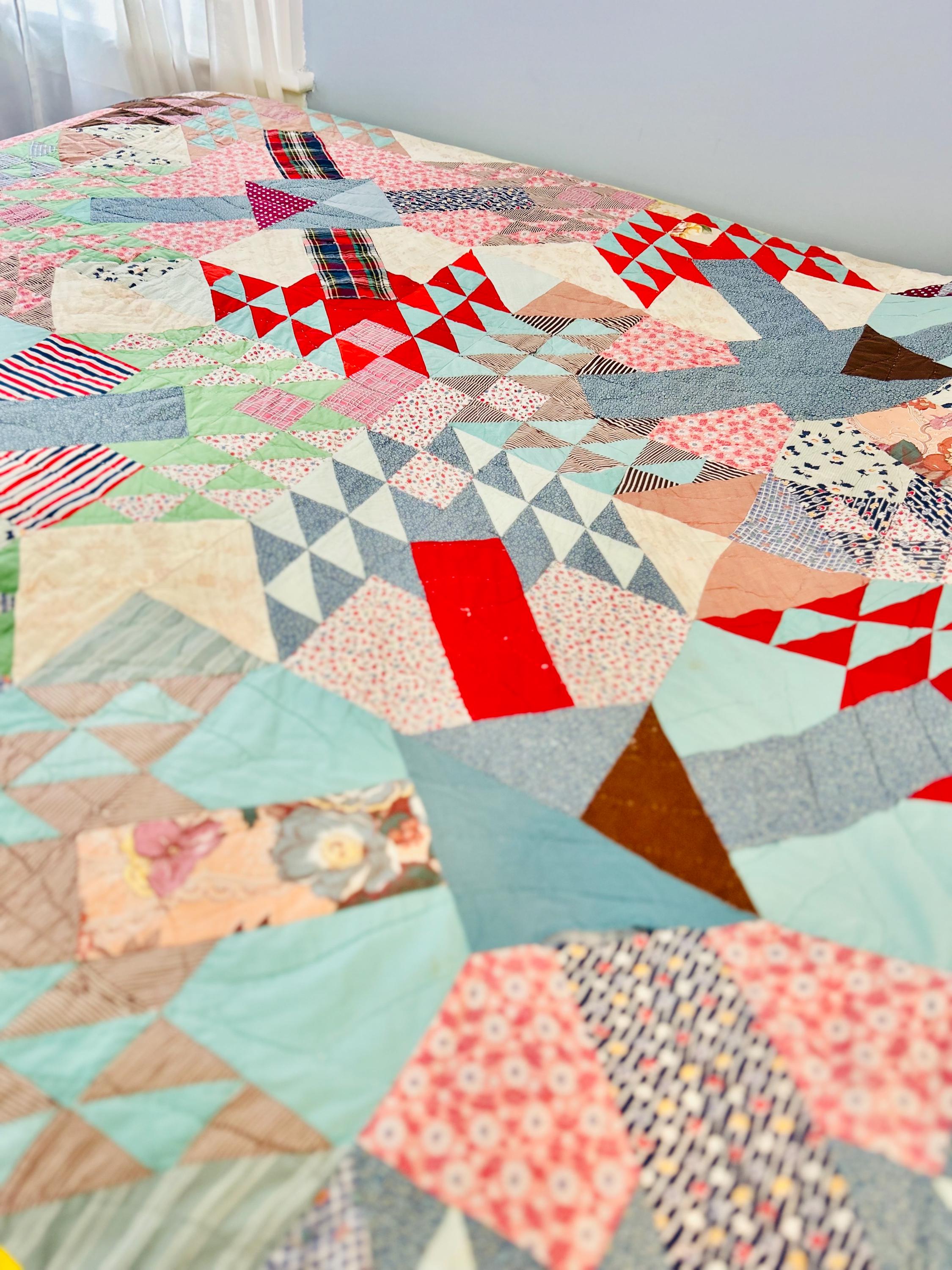 This lively Tree of Paradise Quilt is circa 1930s-1940s and has been pieced from a variety of eclectic blue, red, green, pink and yellow florals and bordered on all four sides by a yellow and red flower border. It is hand-quilted in arches and shells.