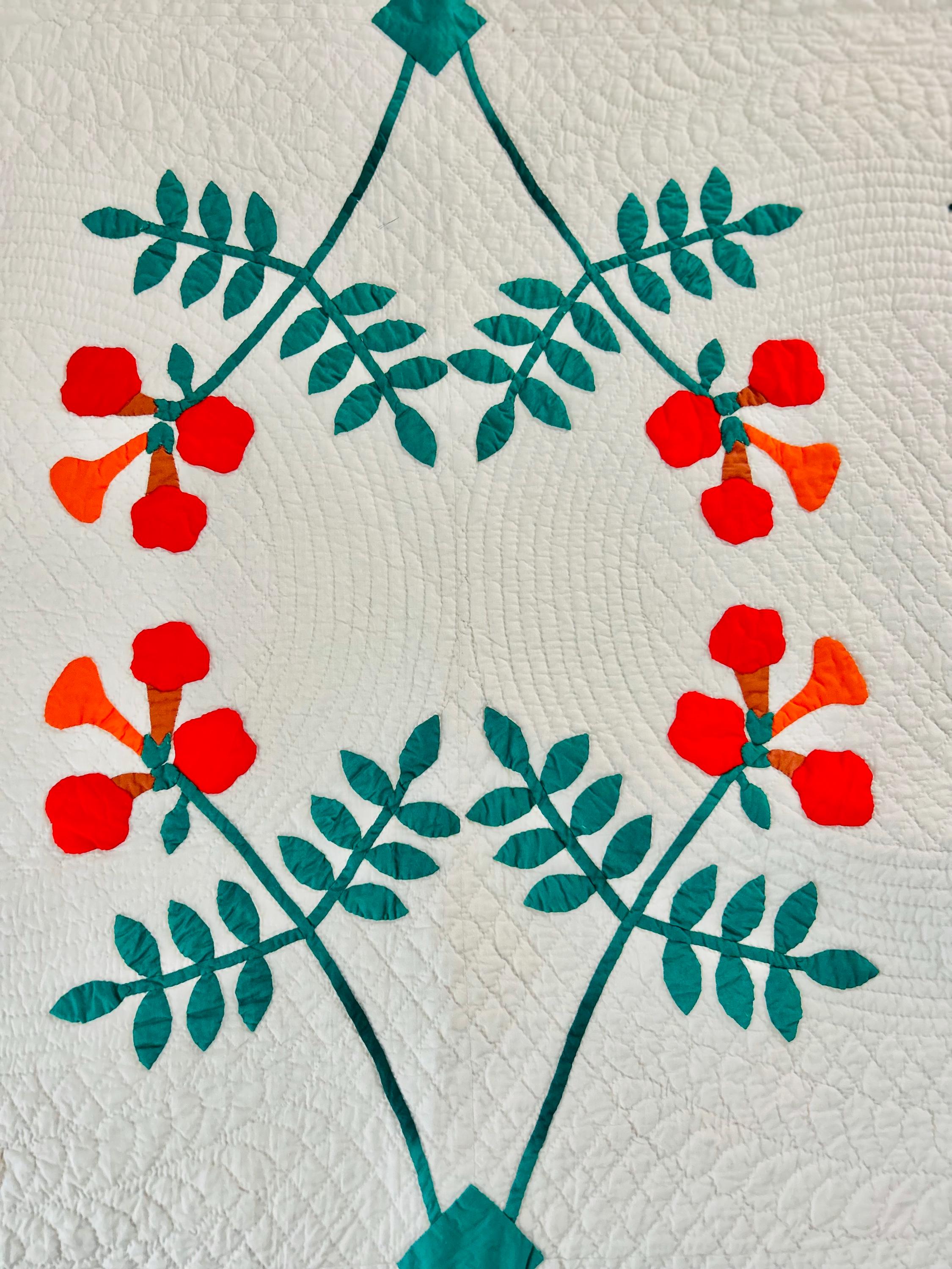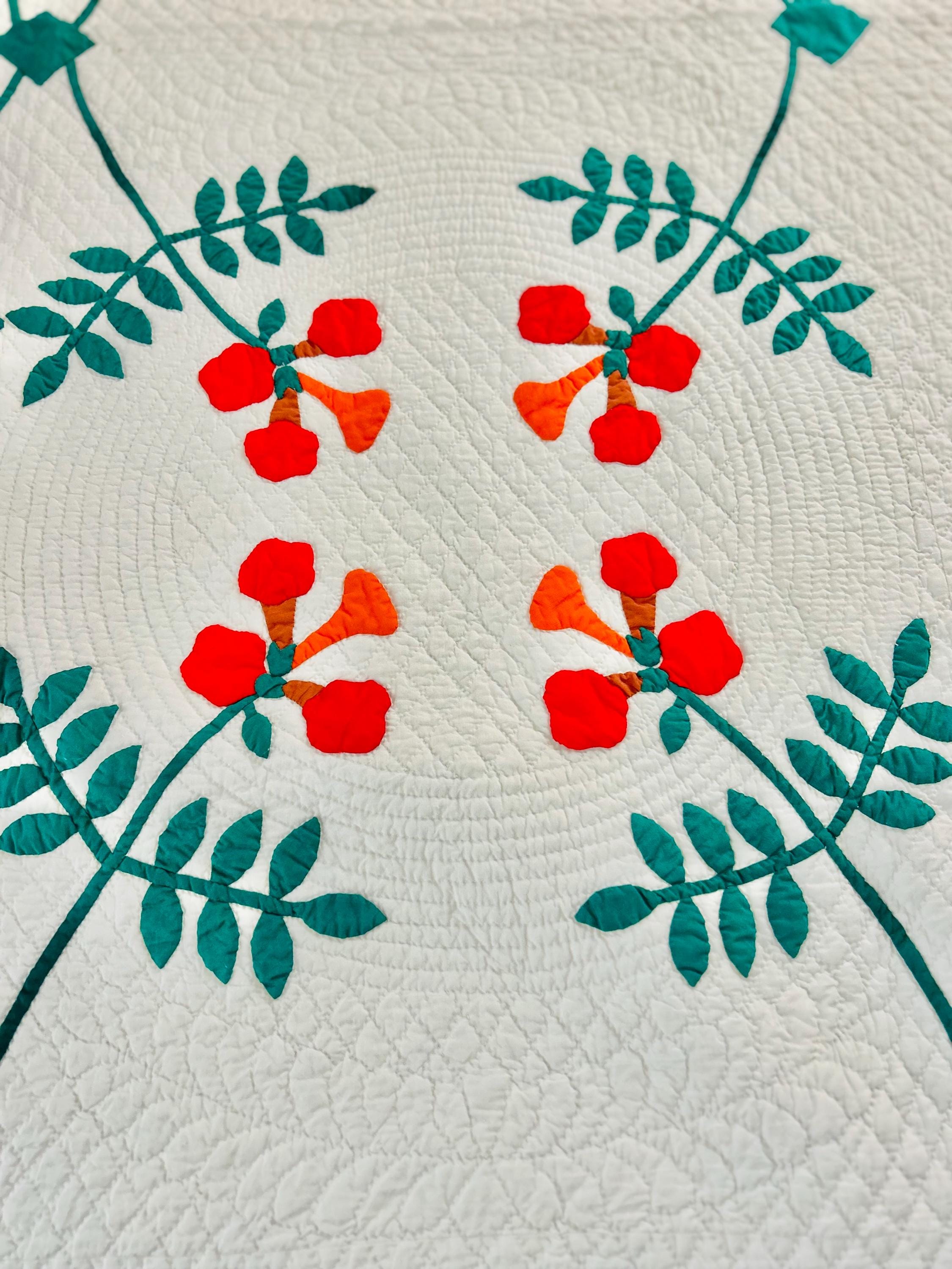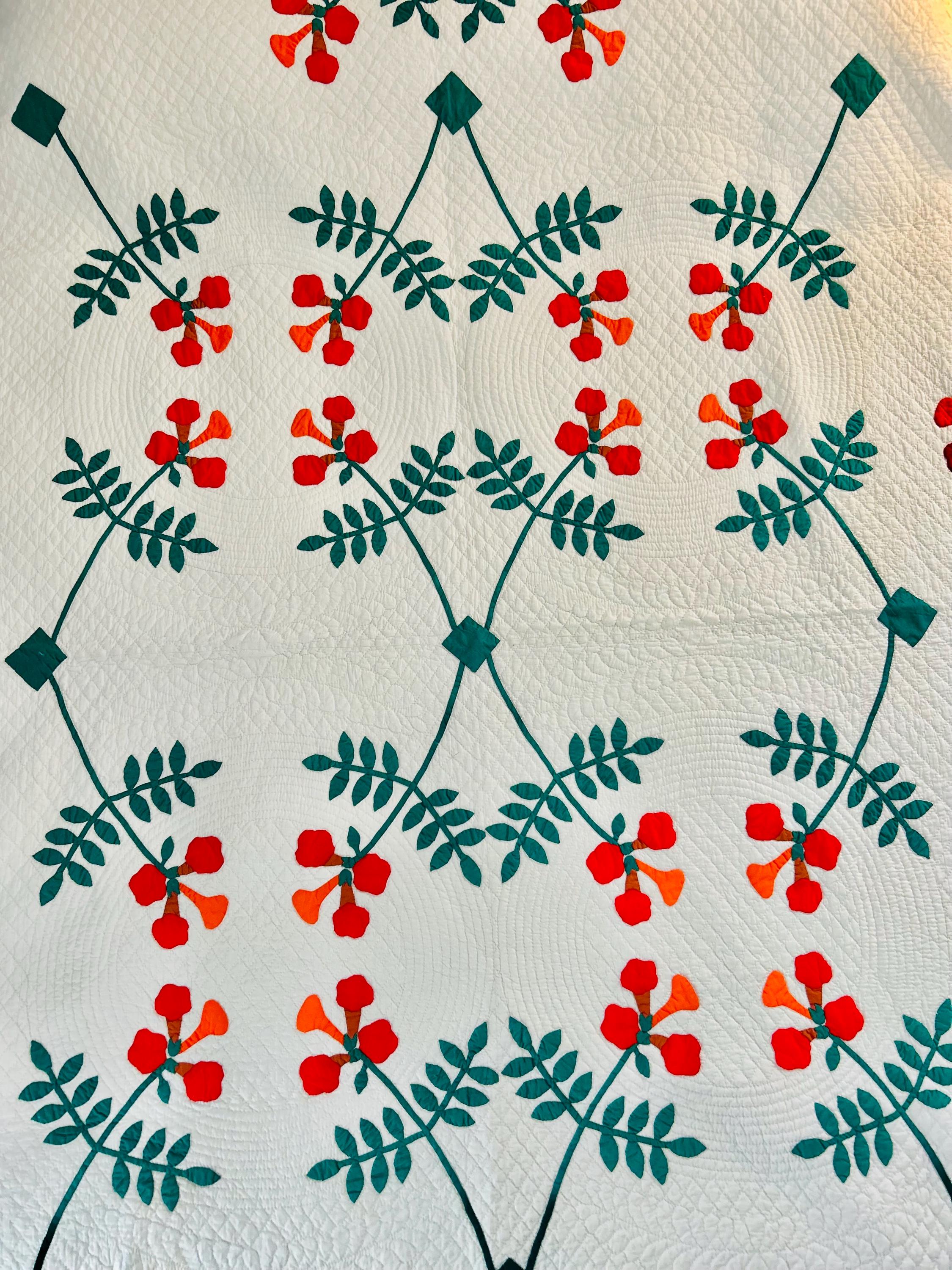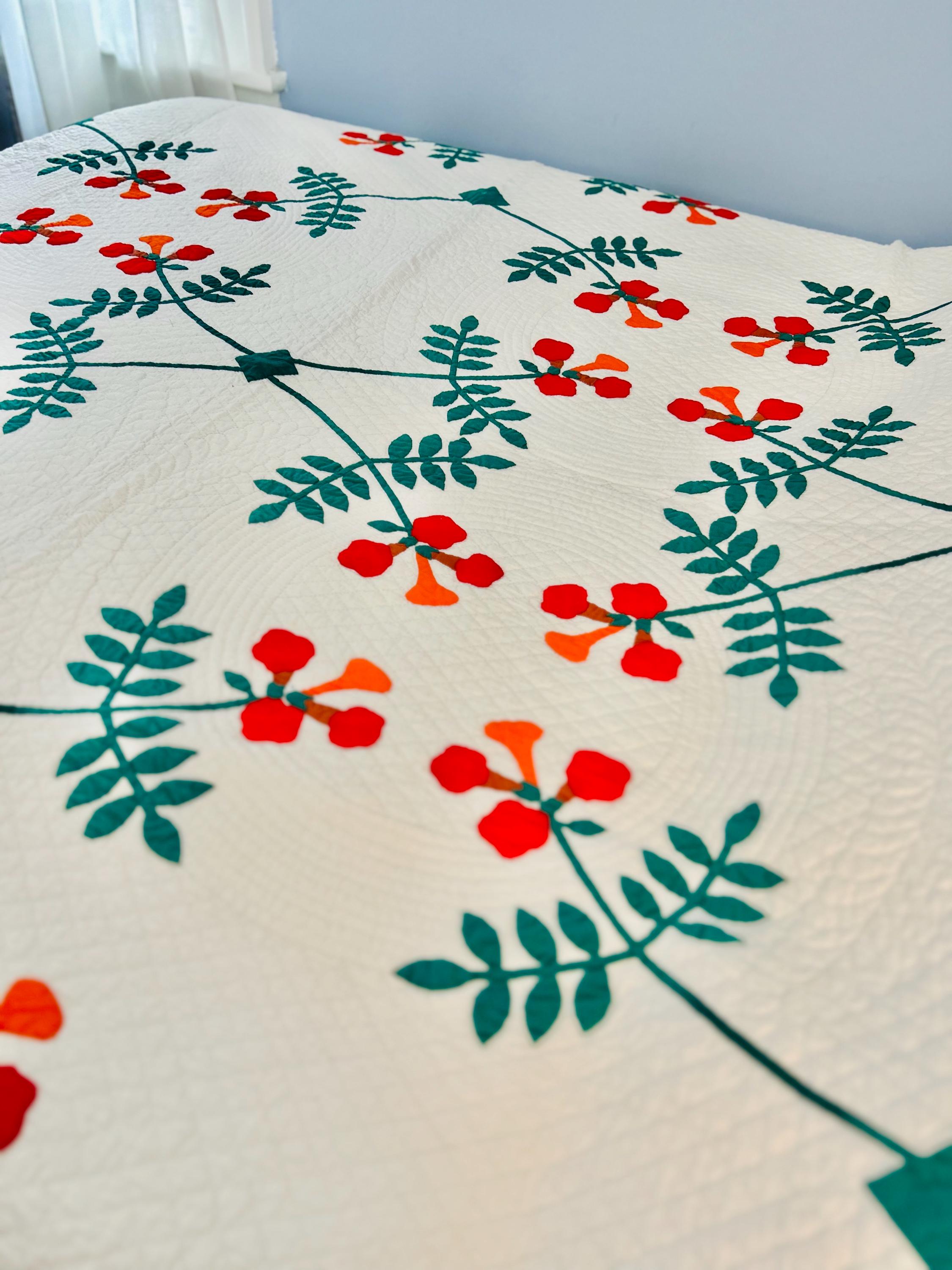 This is a lovely Trumpet Vine Quilt that was likely pieced from a quilt kit. It has been entirely hand-quilted in tiny stitches in patterns of beautiful feathers, tiny diamonds and close-together concentric circles.