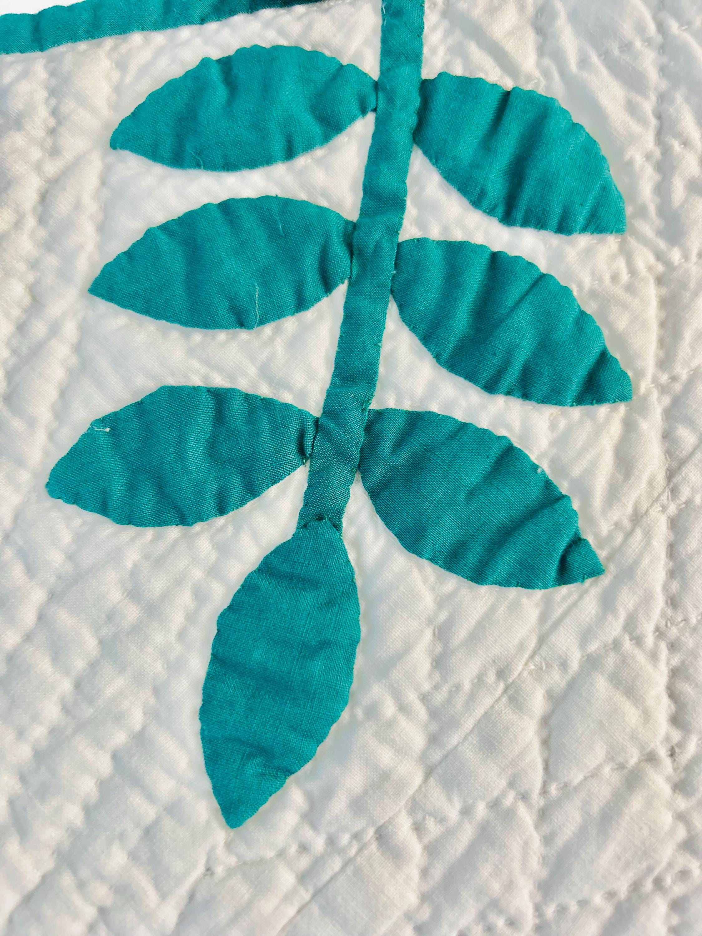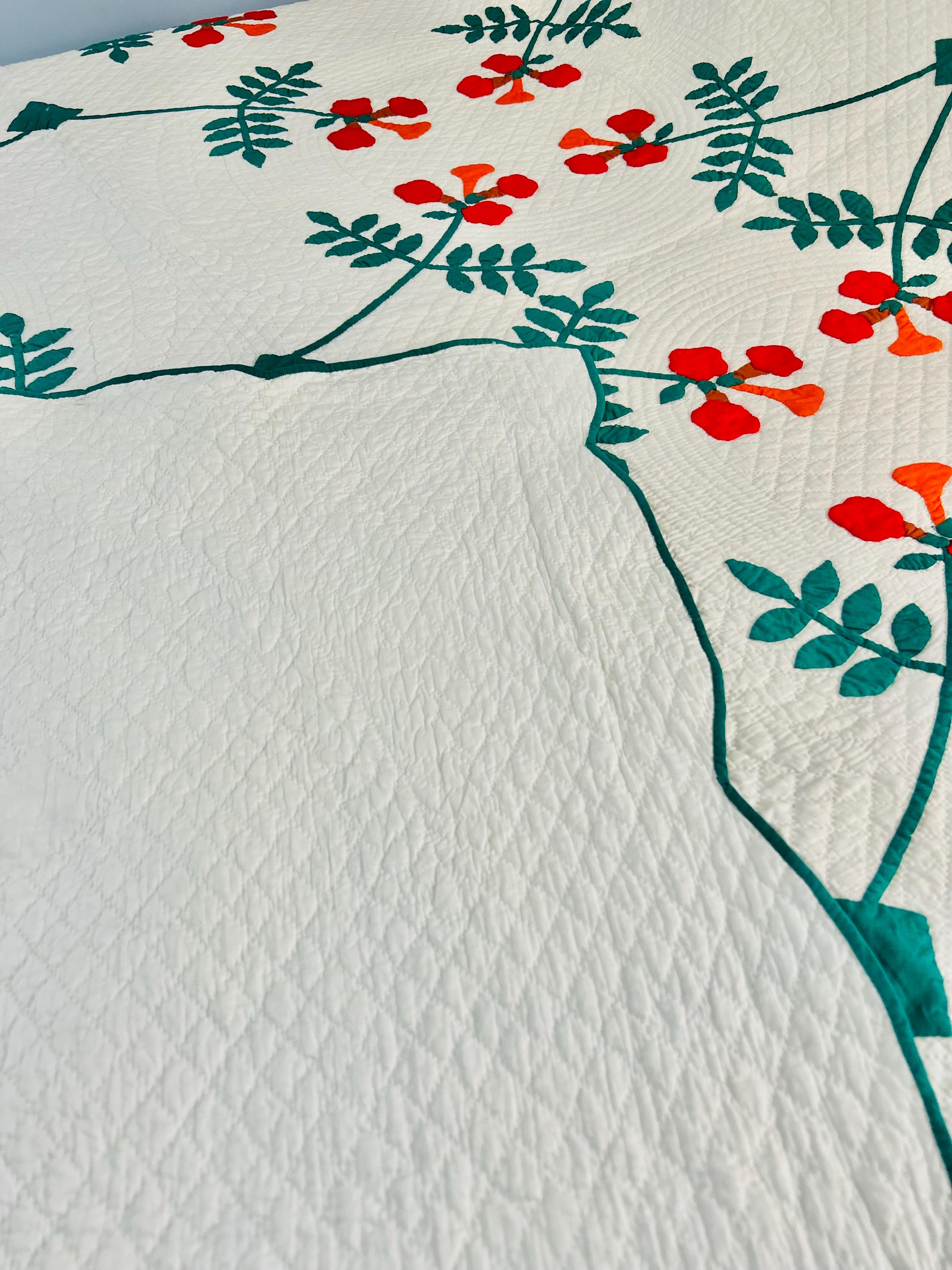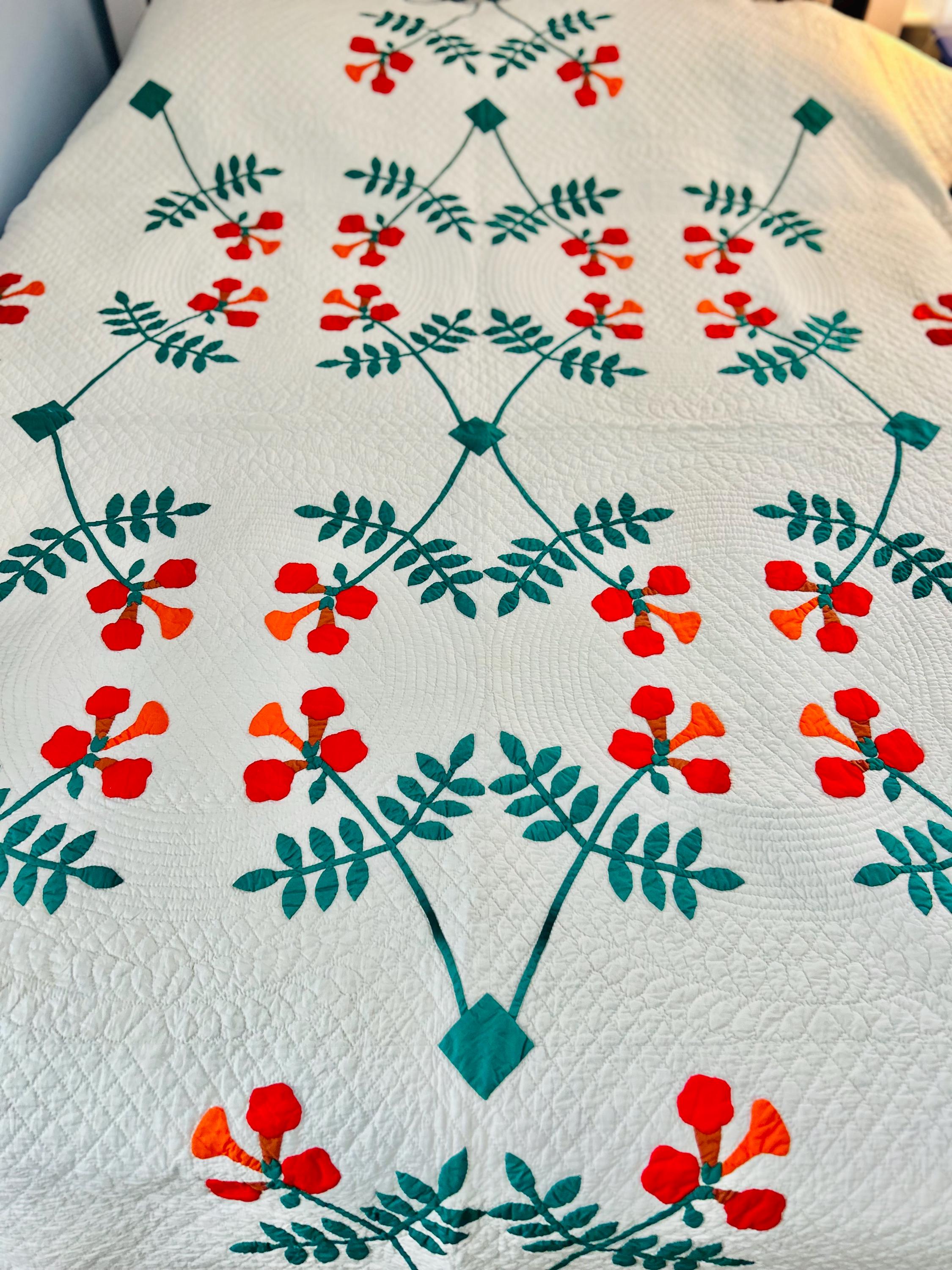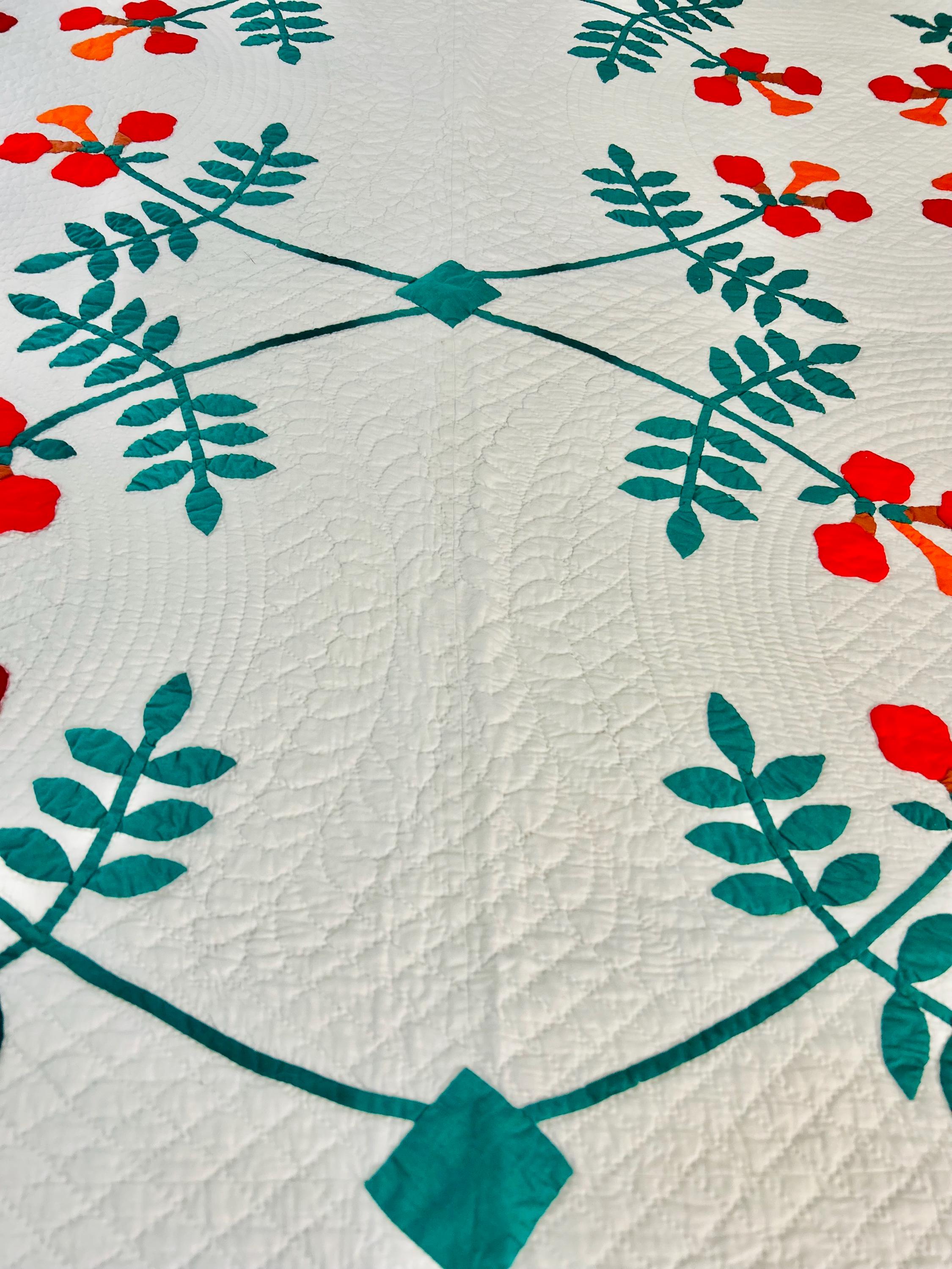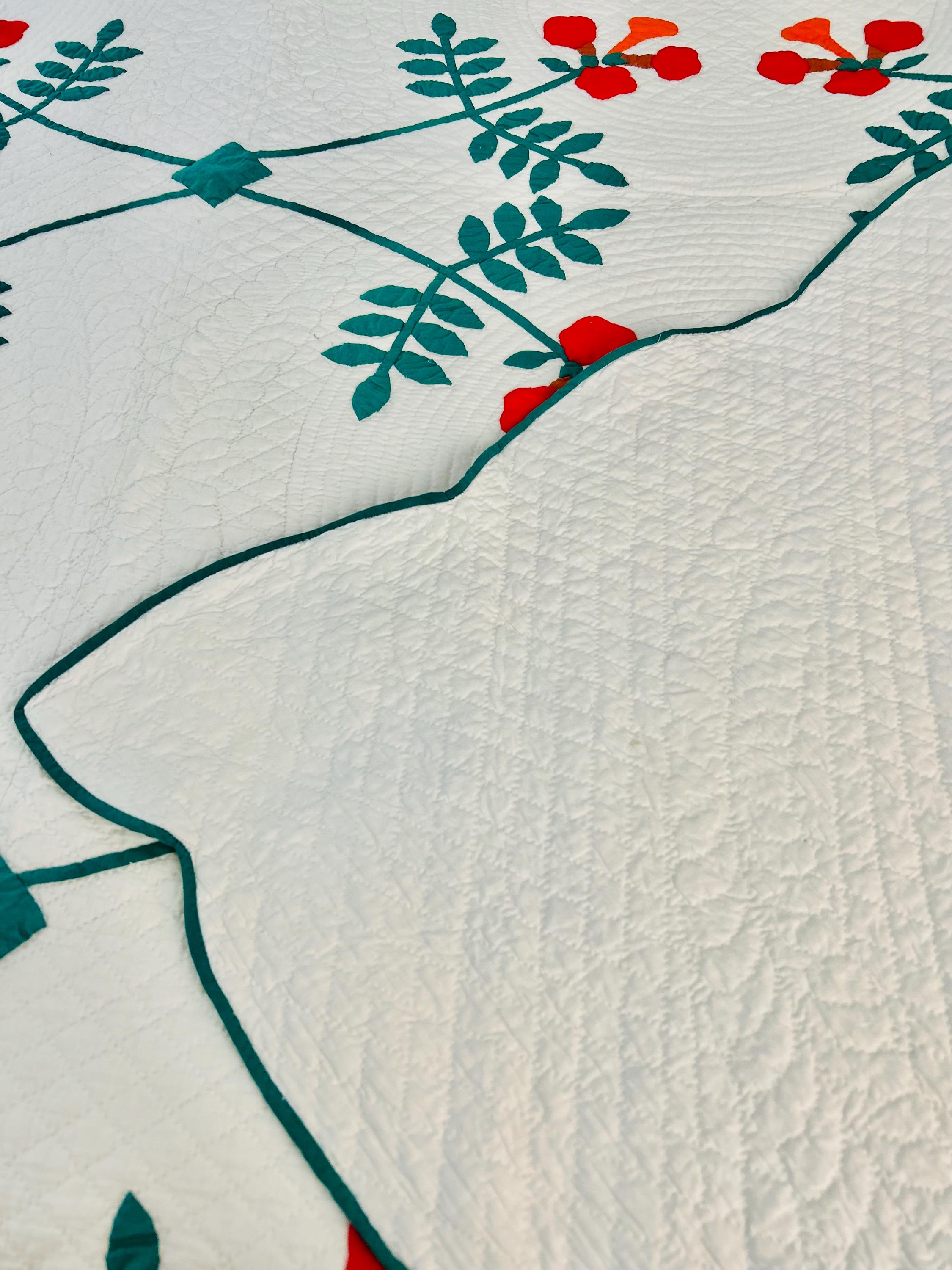 This is a lovely Trumpet Vine Quilt that was likely pieced from a quilt kit. It has been entirely hand-quilted in tiny stitches in patterns of beautiful feathers, tiny diamonds and close-together concentric circles.
