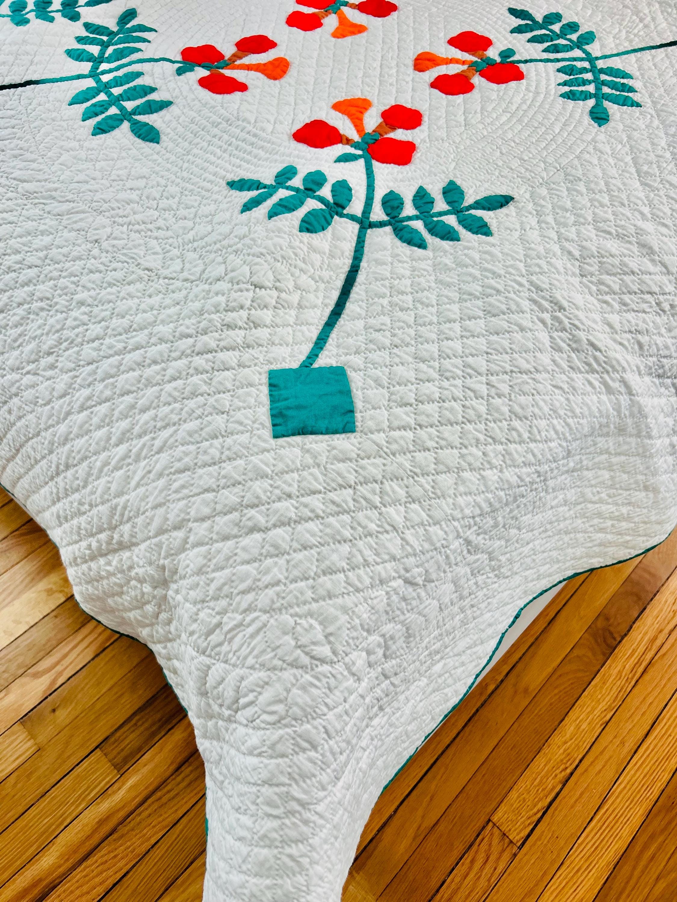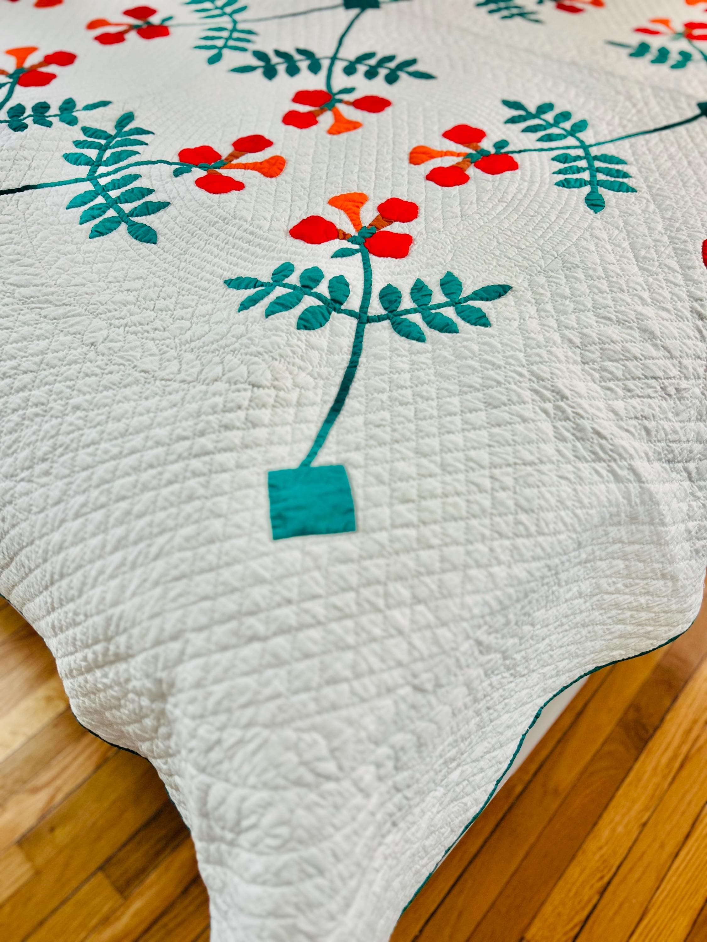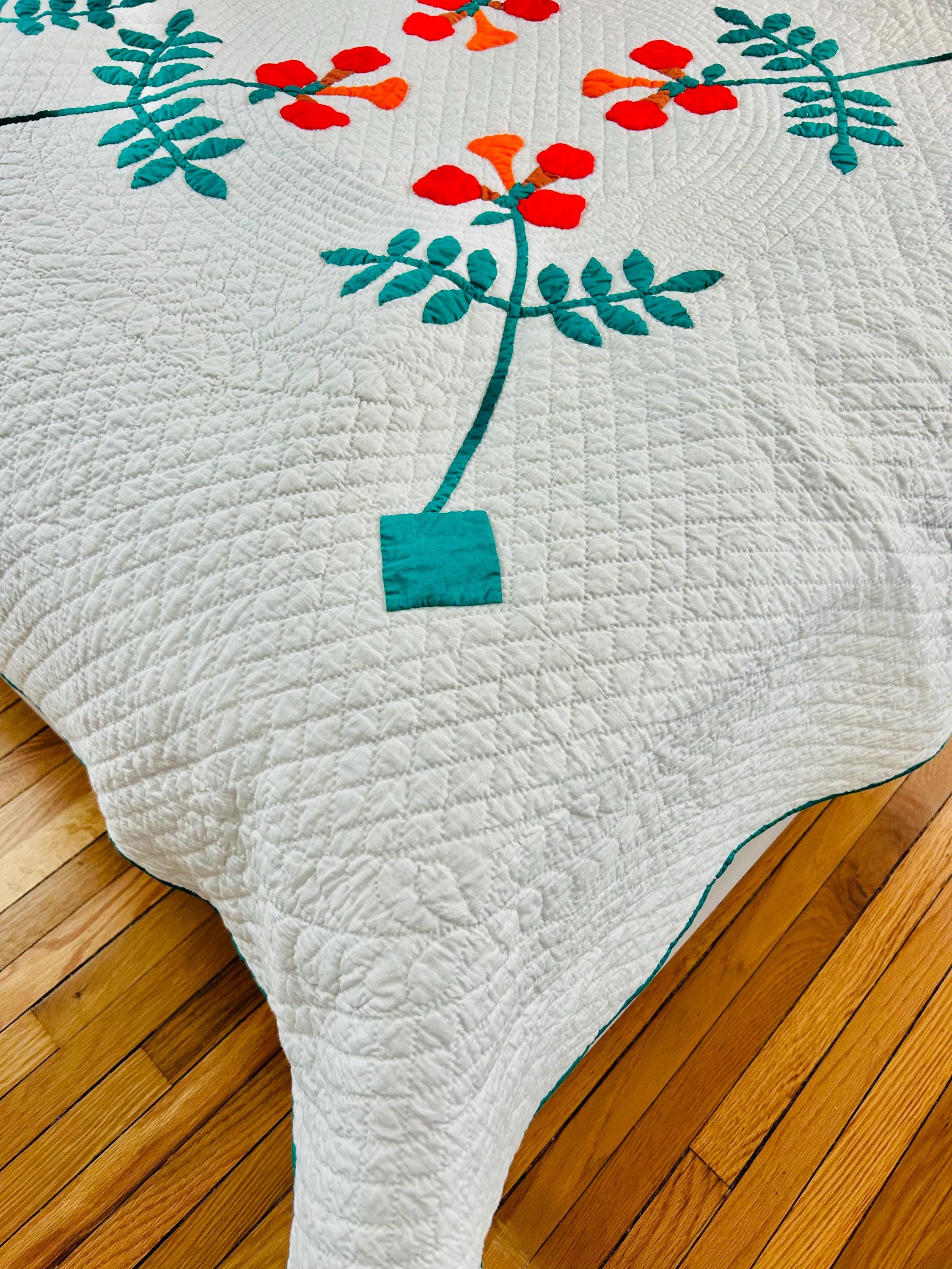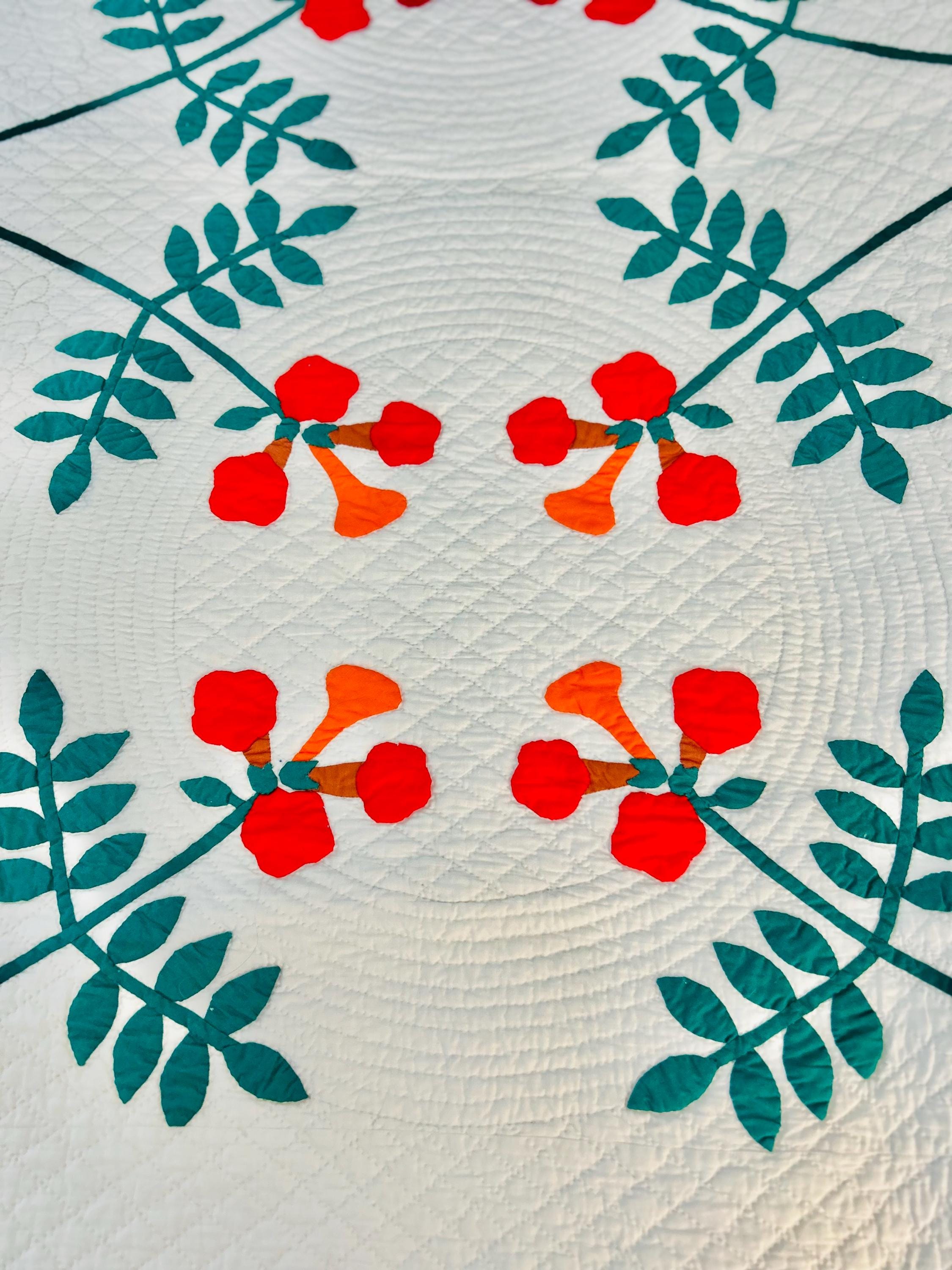 This is a lovely Trumpet Vine Quilt that was likely pieced from a quilt kit. It has been entirely hand-quilted in tiny stitches in patterns of beautiful feathers, tiny diamonds and close-together concentric circles.