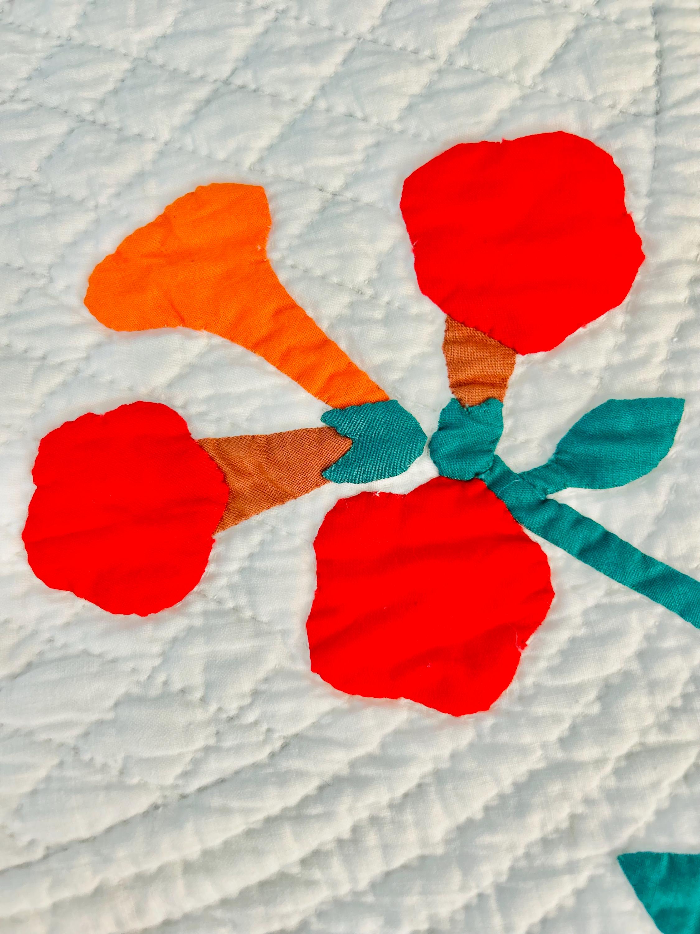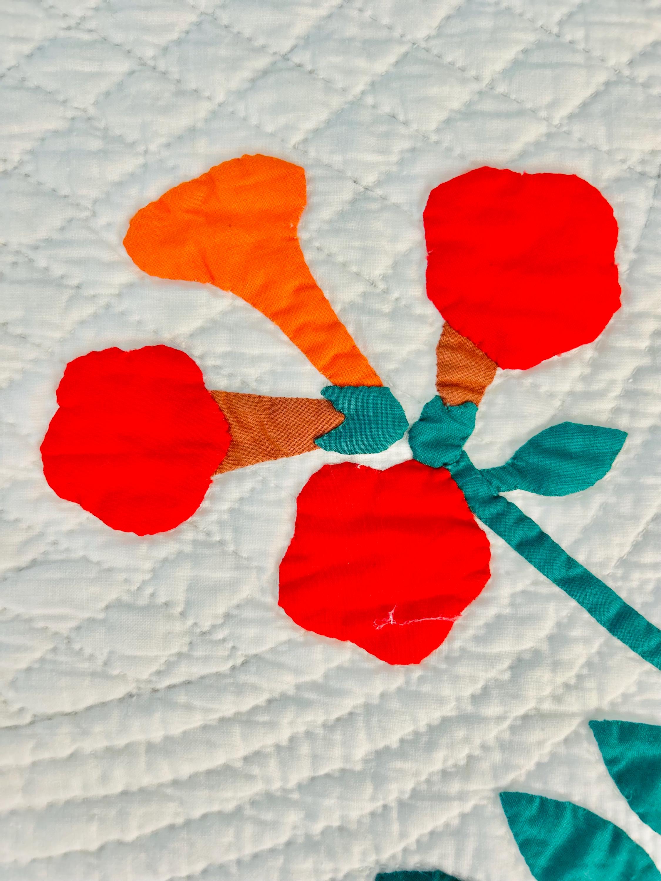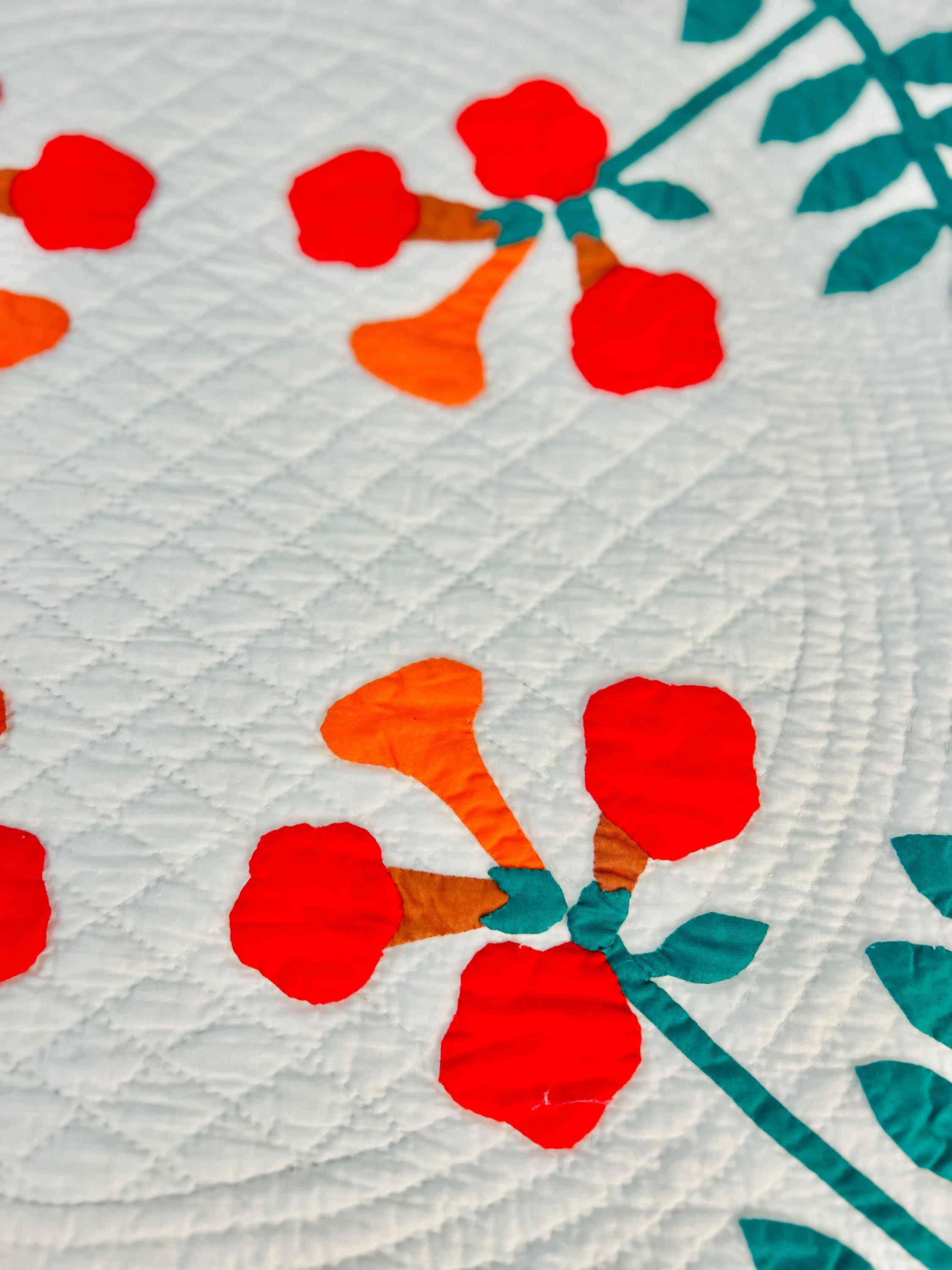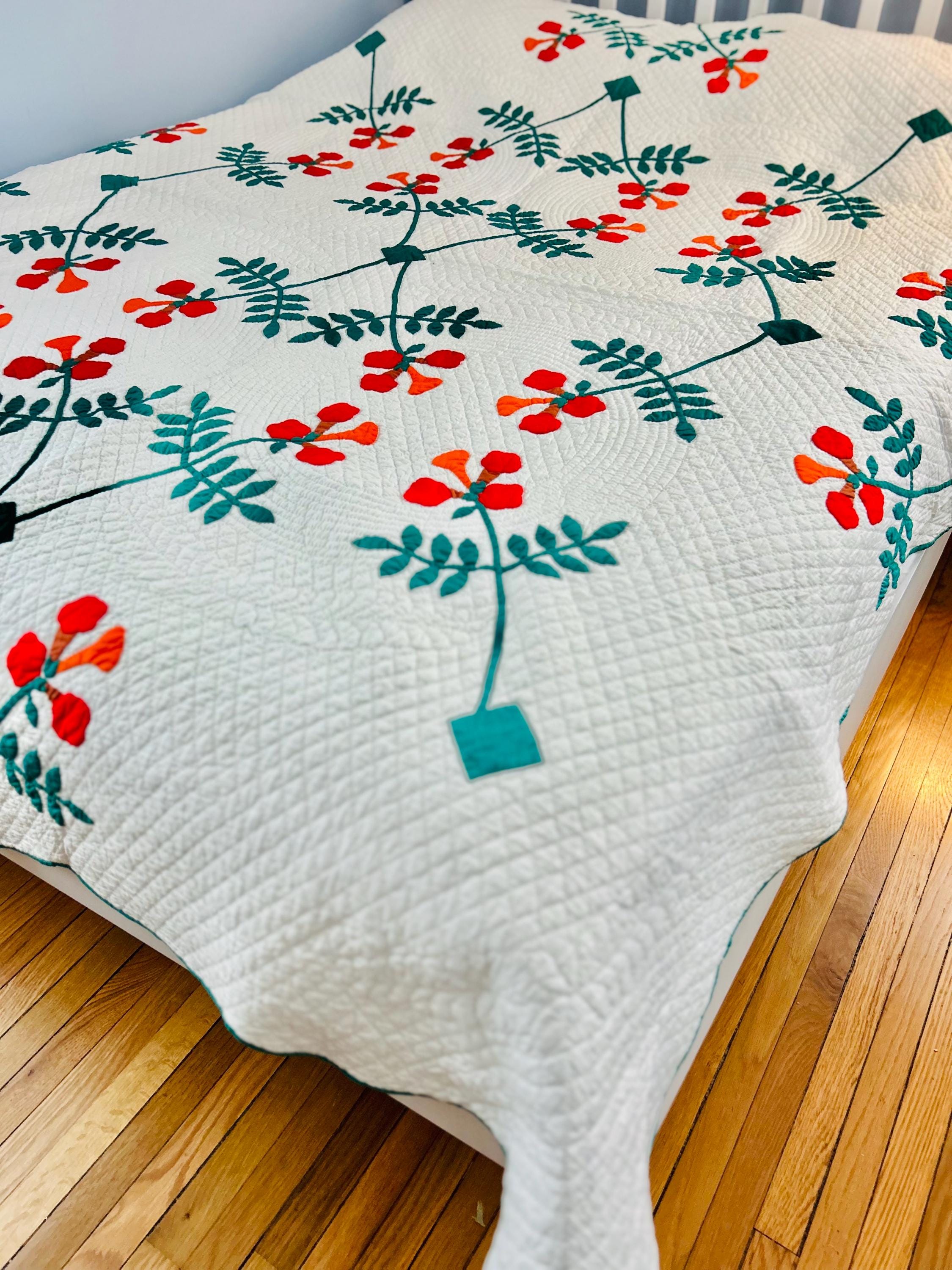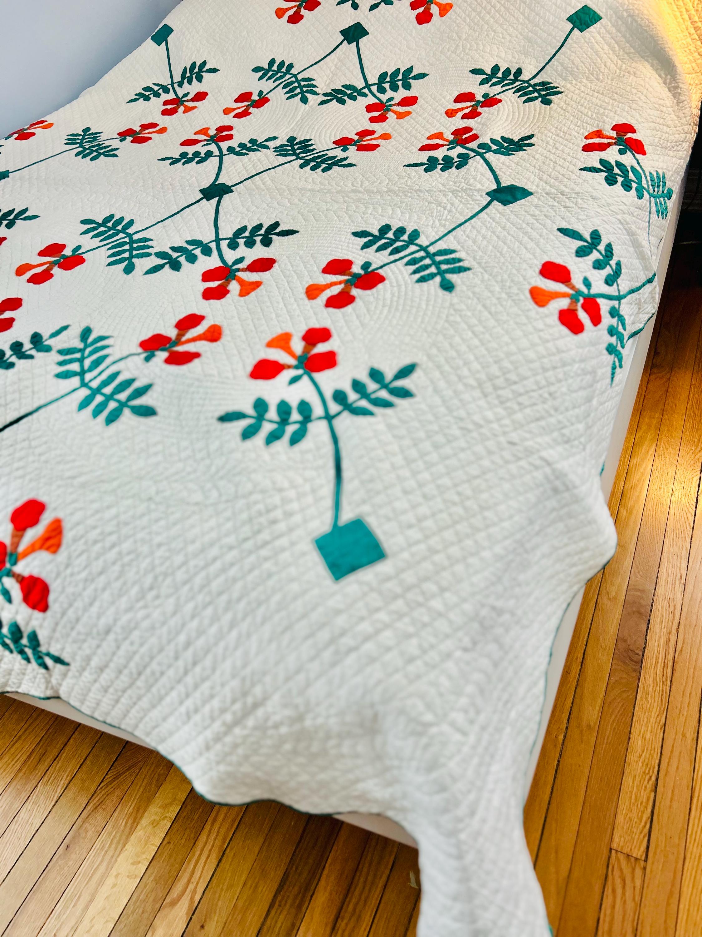 This is a lovely Trumpet Vine Quilt that was likely pieced from a quilt kit. It has been entirely hand-quilted in tiny stitches in patterns of beautiful feathers, tiny diamonds and close-together concentric circles.