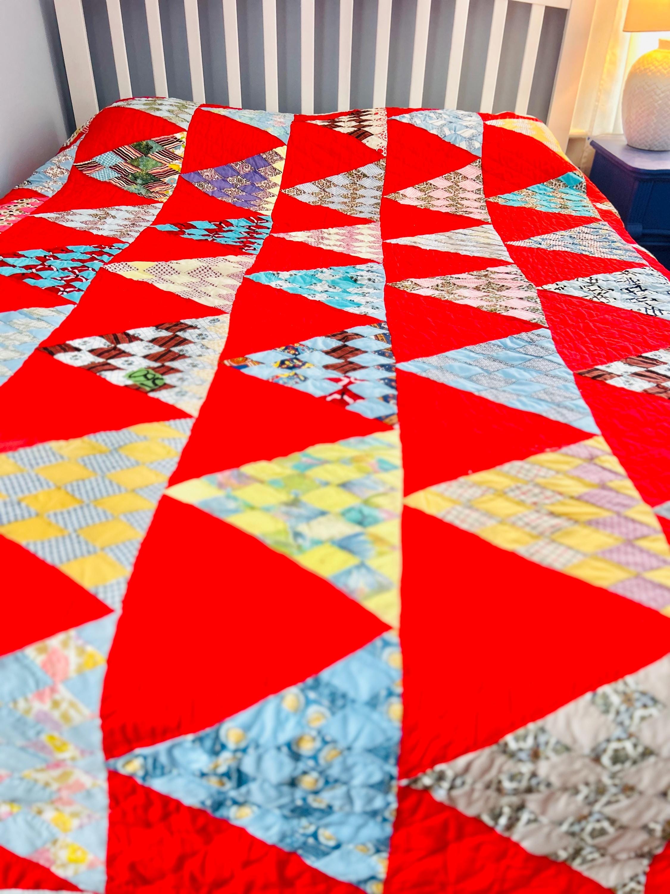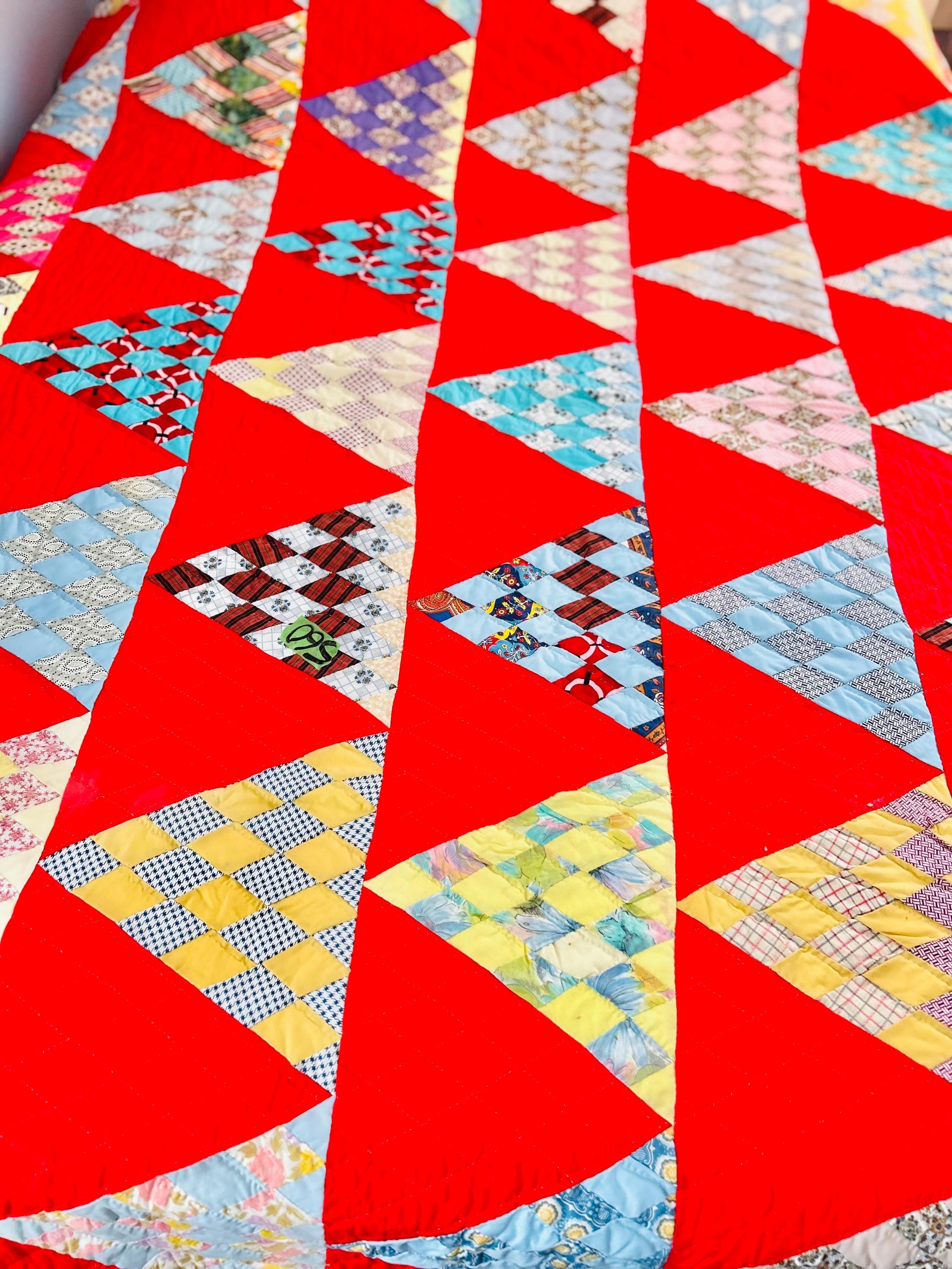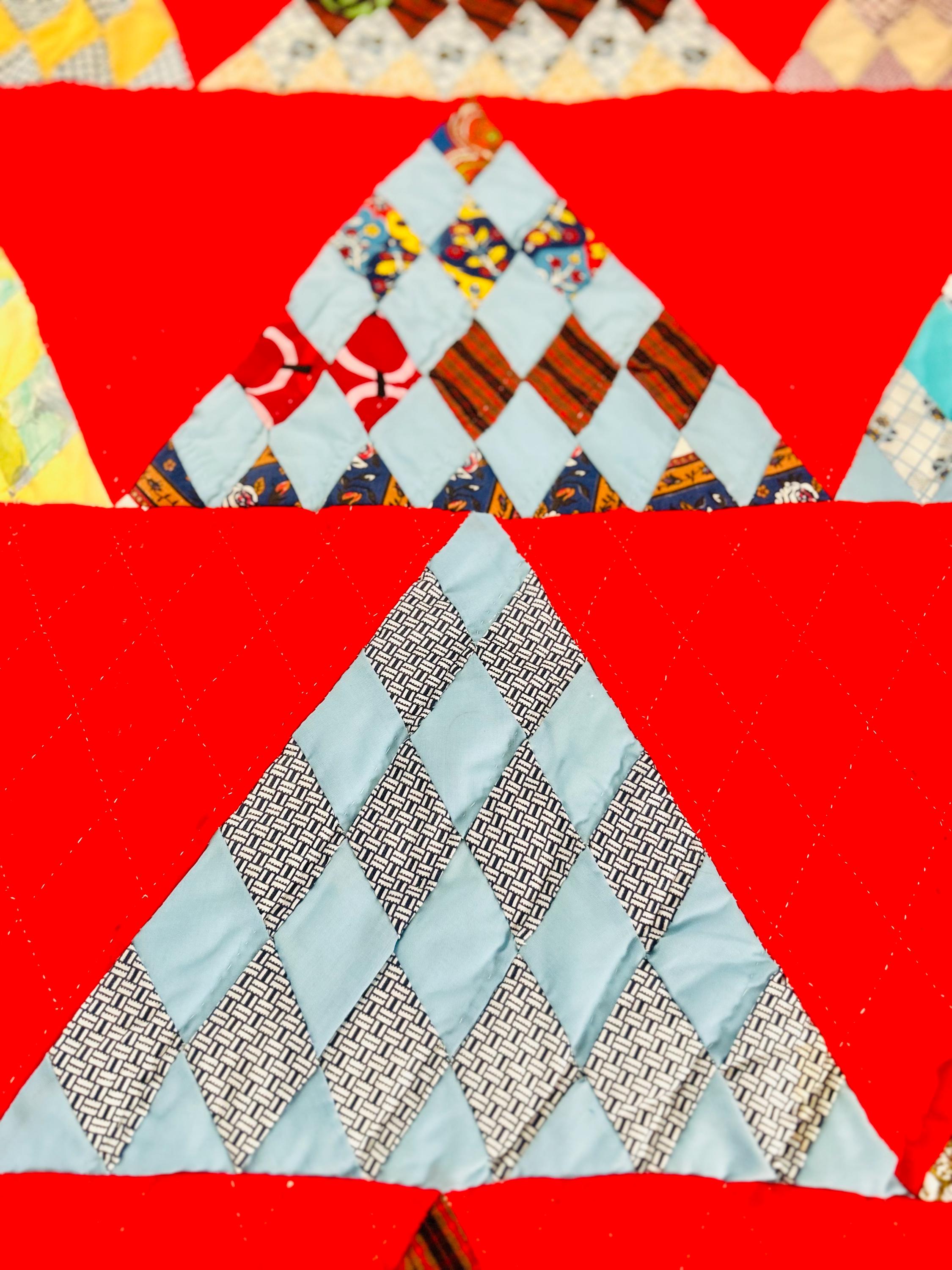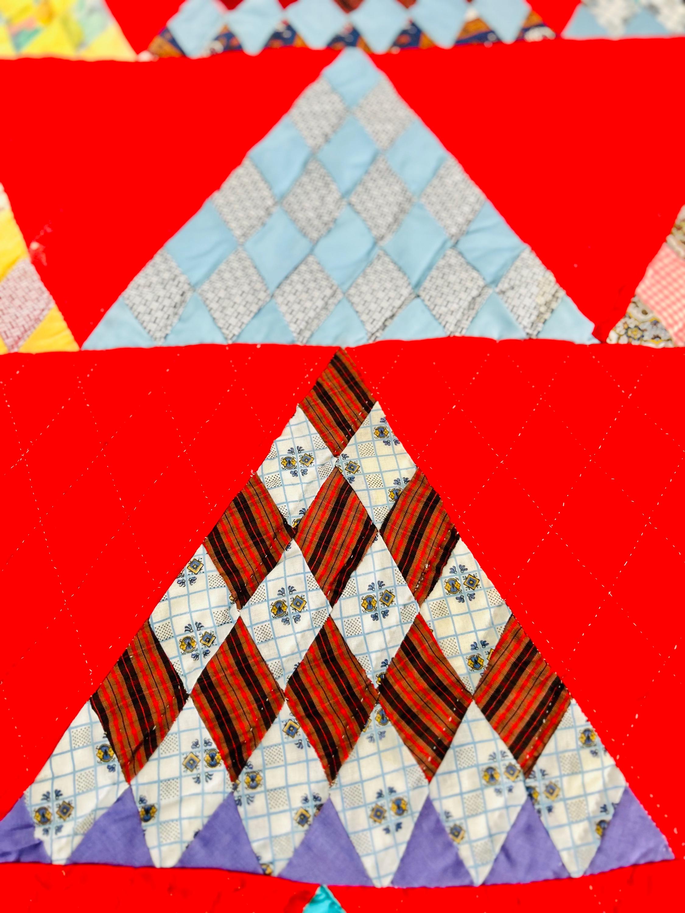This Thousand Pyramids Quilt is circa 1940s and has been beautifully hand-pieced and entirely hand-quilted. The quilting, like the piecework, is in diamonds.