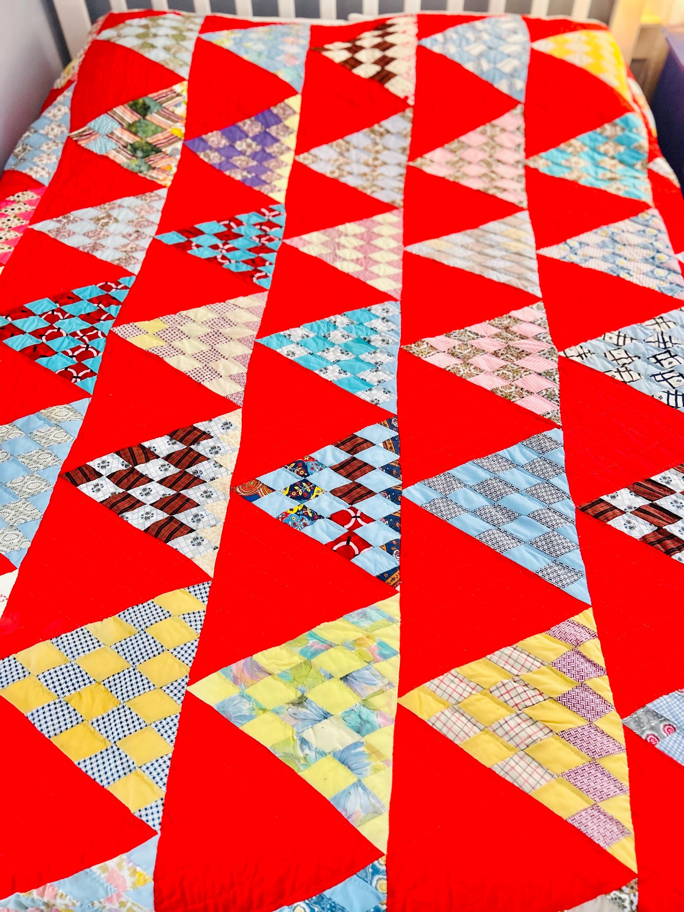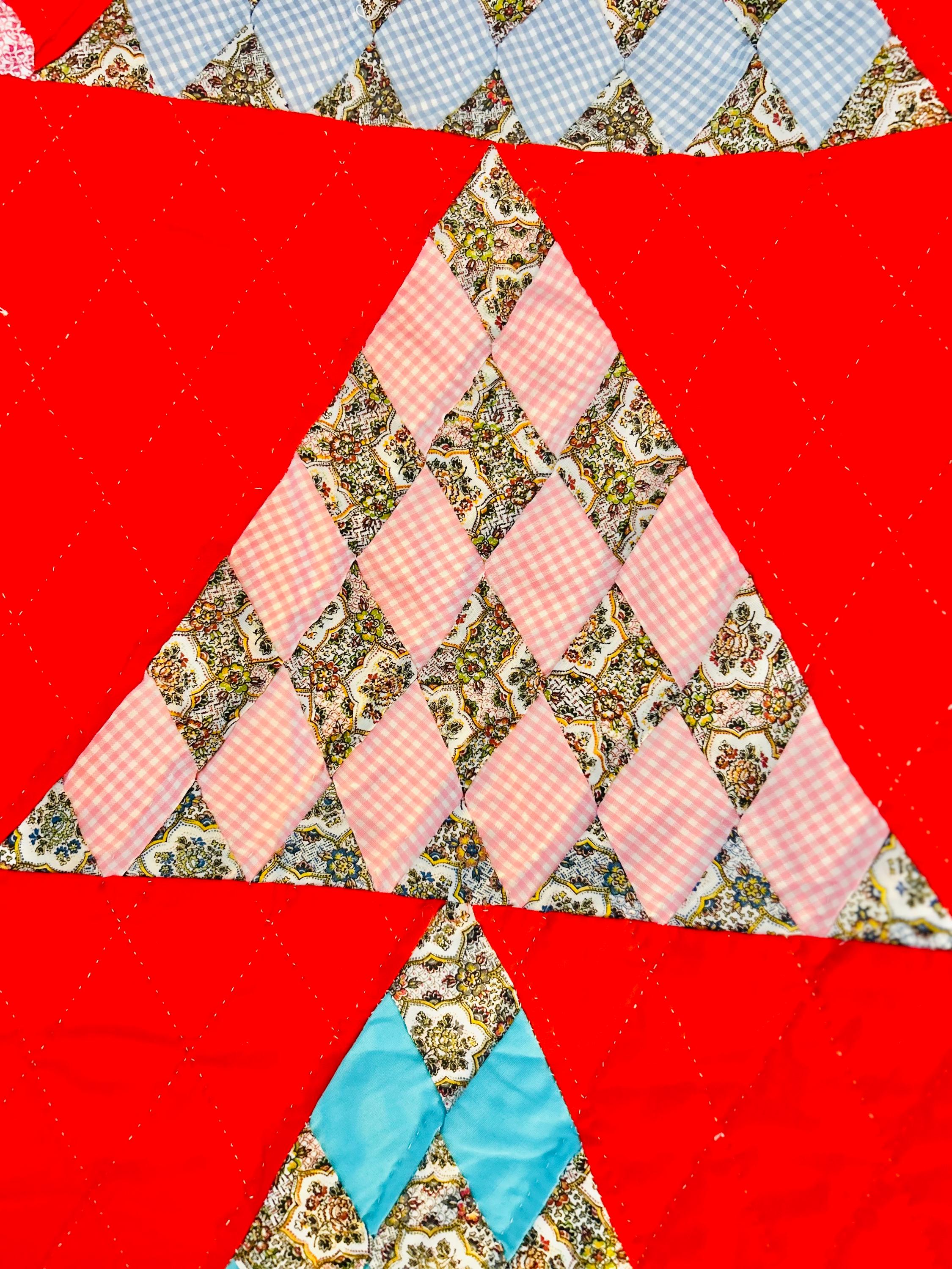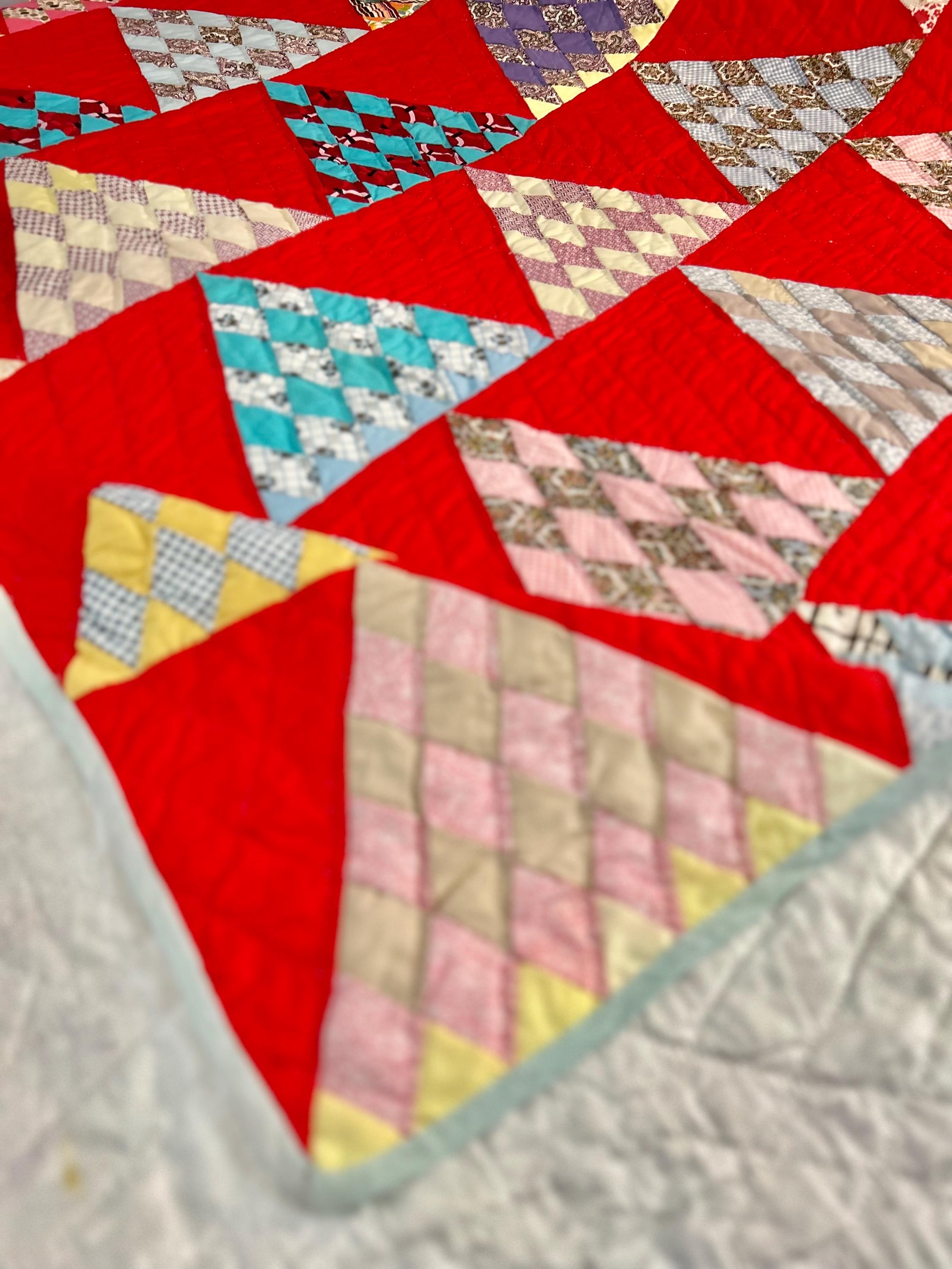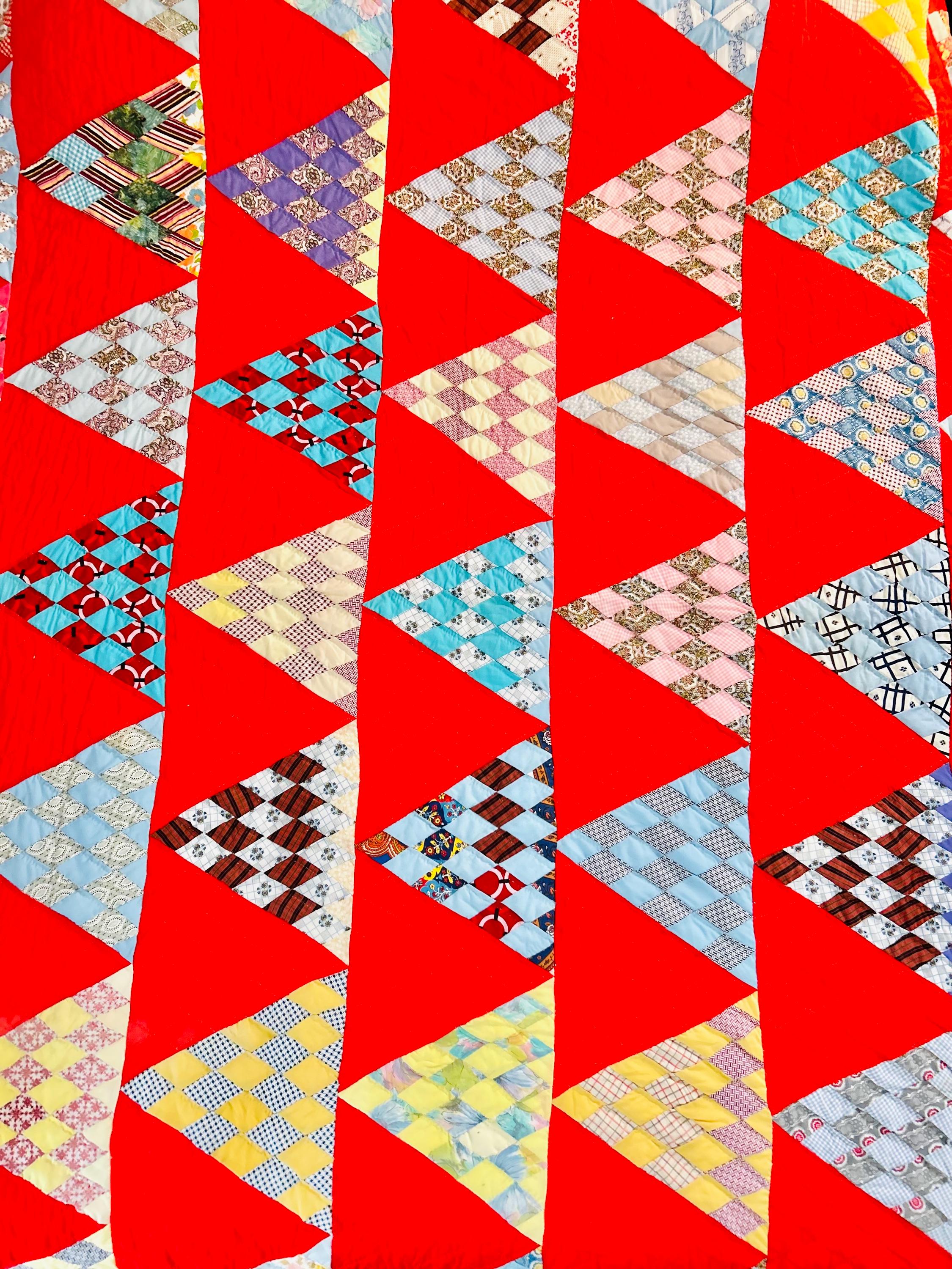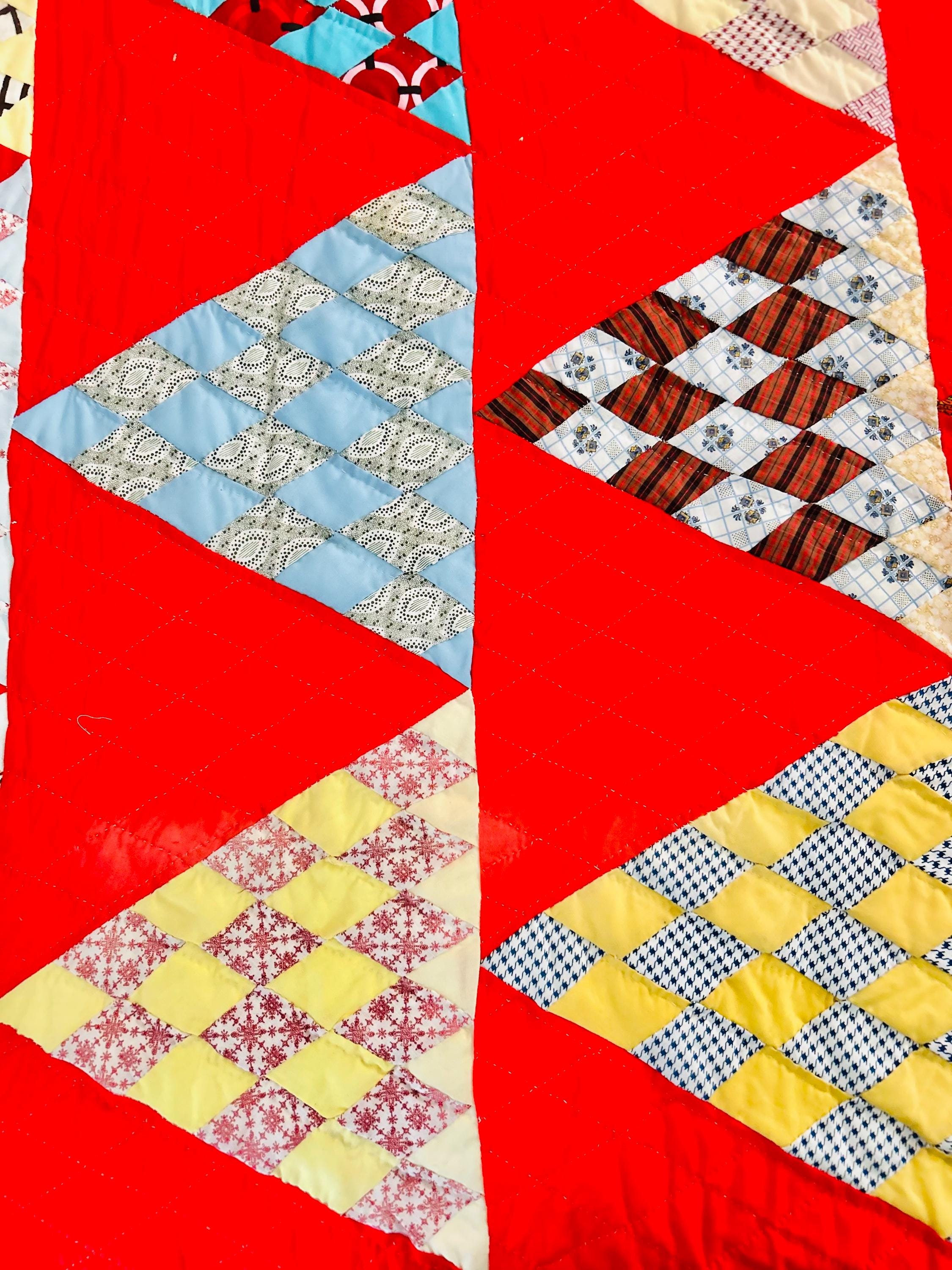 This Thousand Pyramids Quilt is circa 1940s and has been beautifully hand-pieced and entirely hand-quilted. The quilting, like the piecework, is in diamonds.
