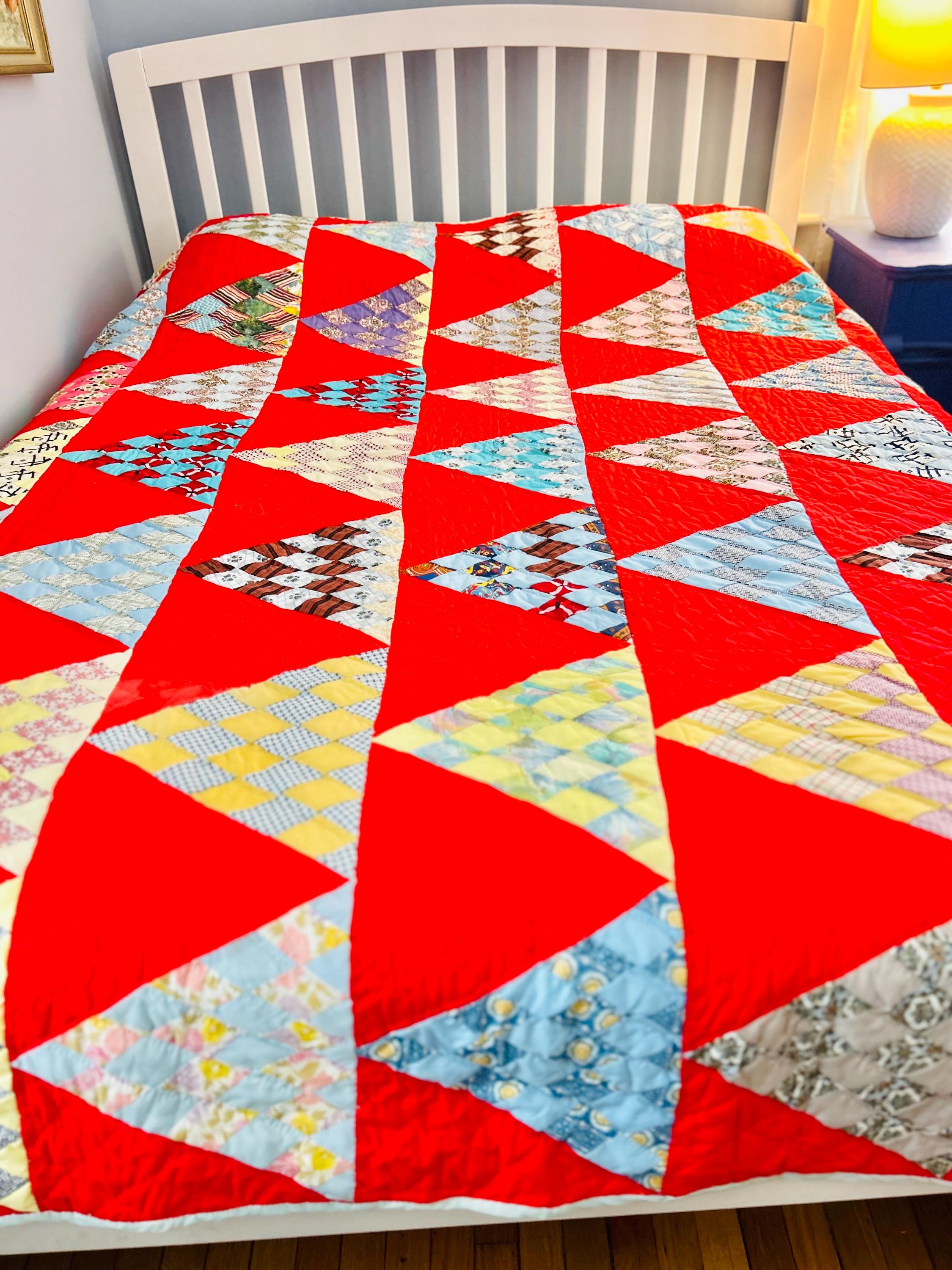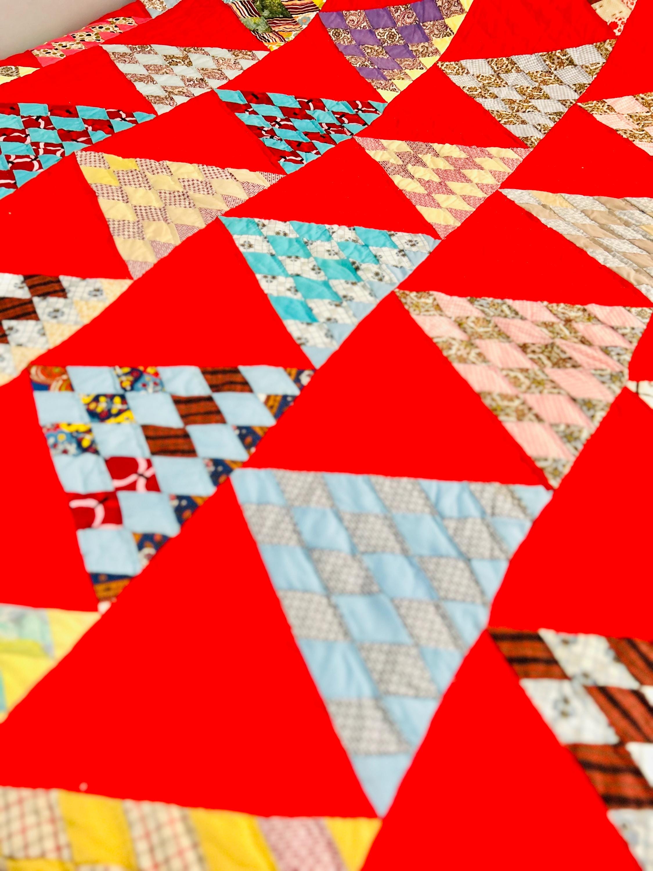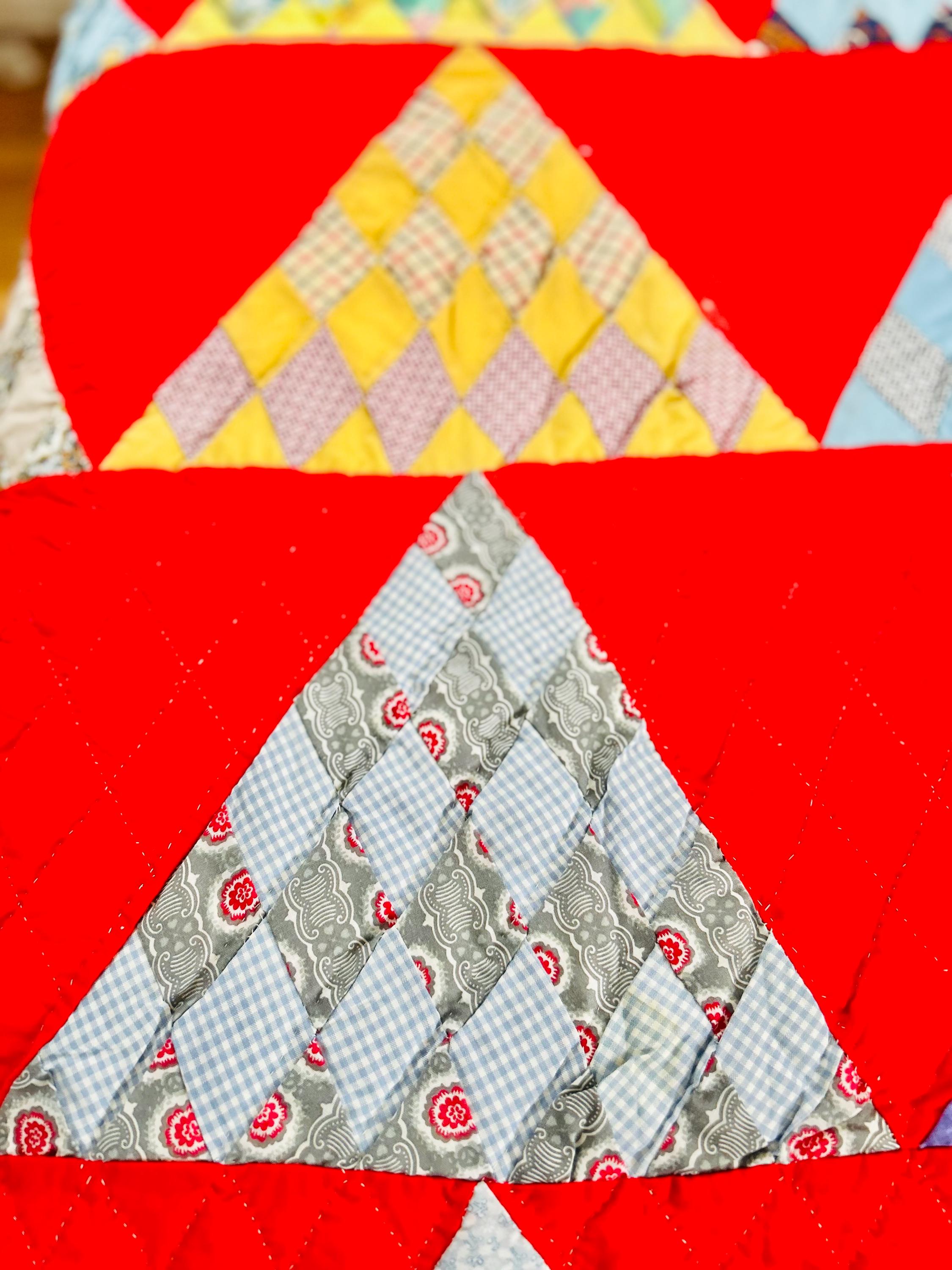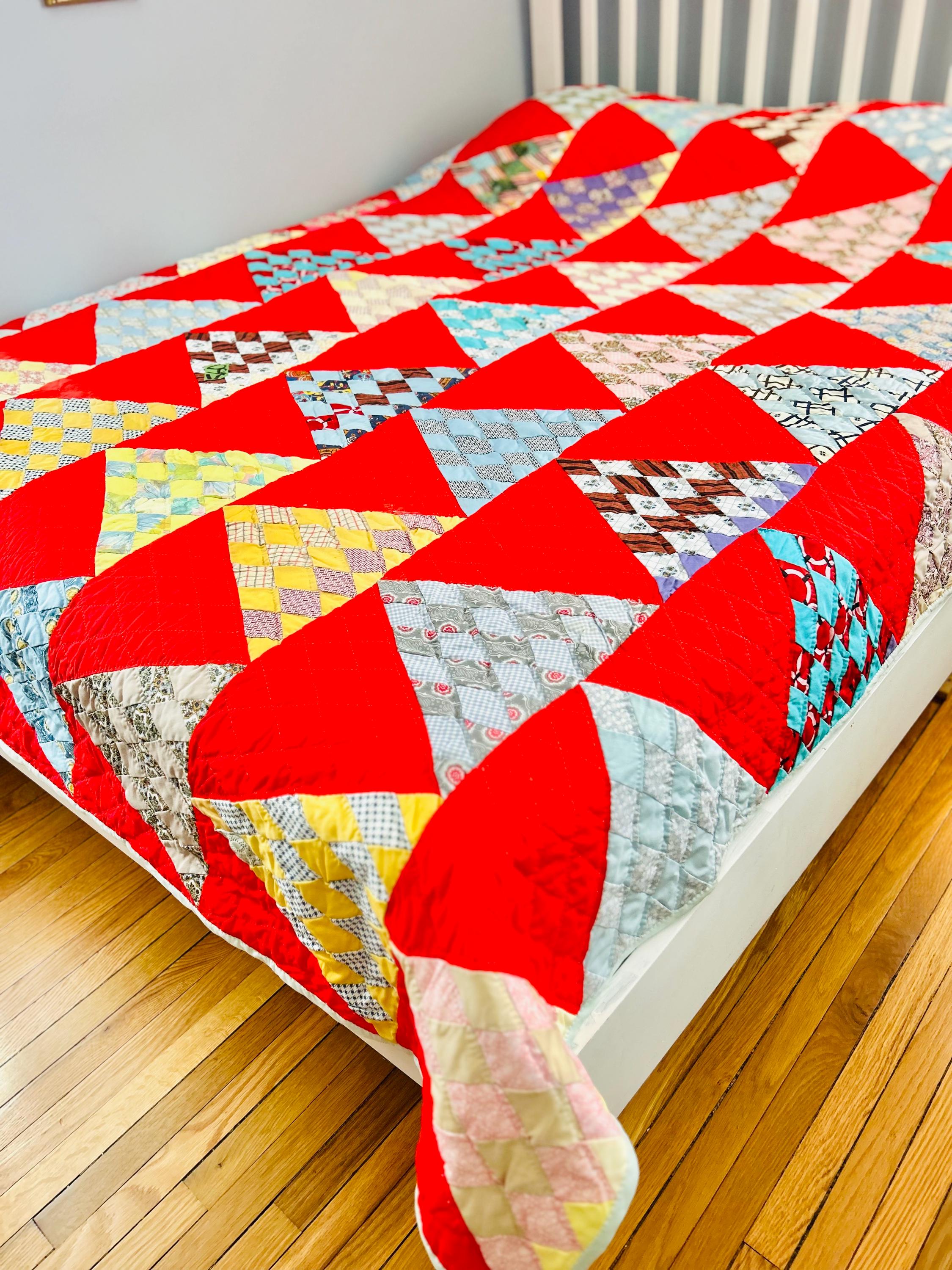 This Thousand Pyramids Quilt is circa 1940s and has been beautifully hand-pieced and entirely hand-quilted. The quilting, like the piecework, is in diamonds.