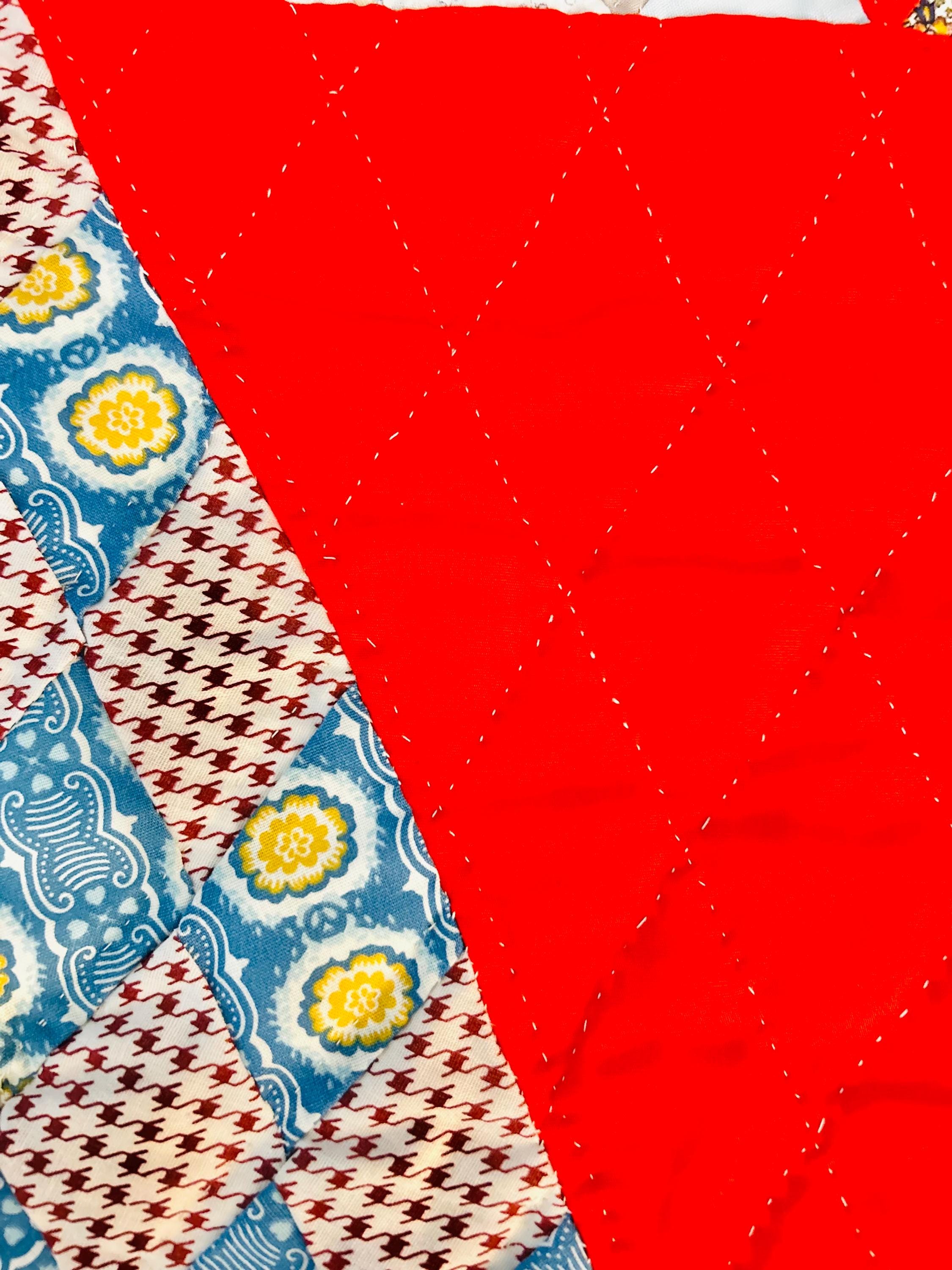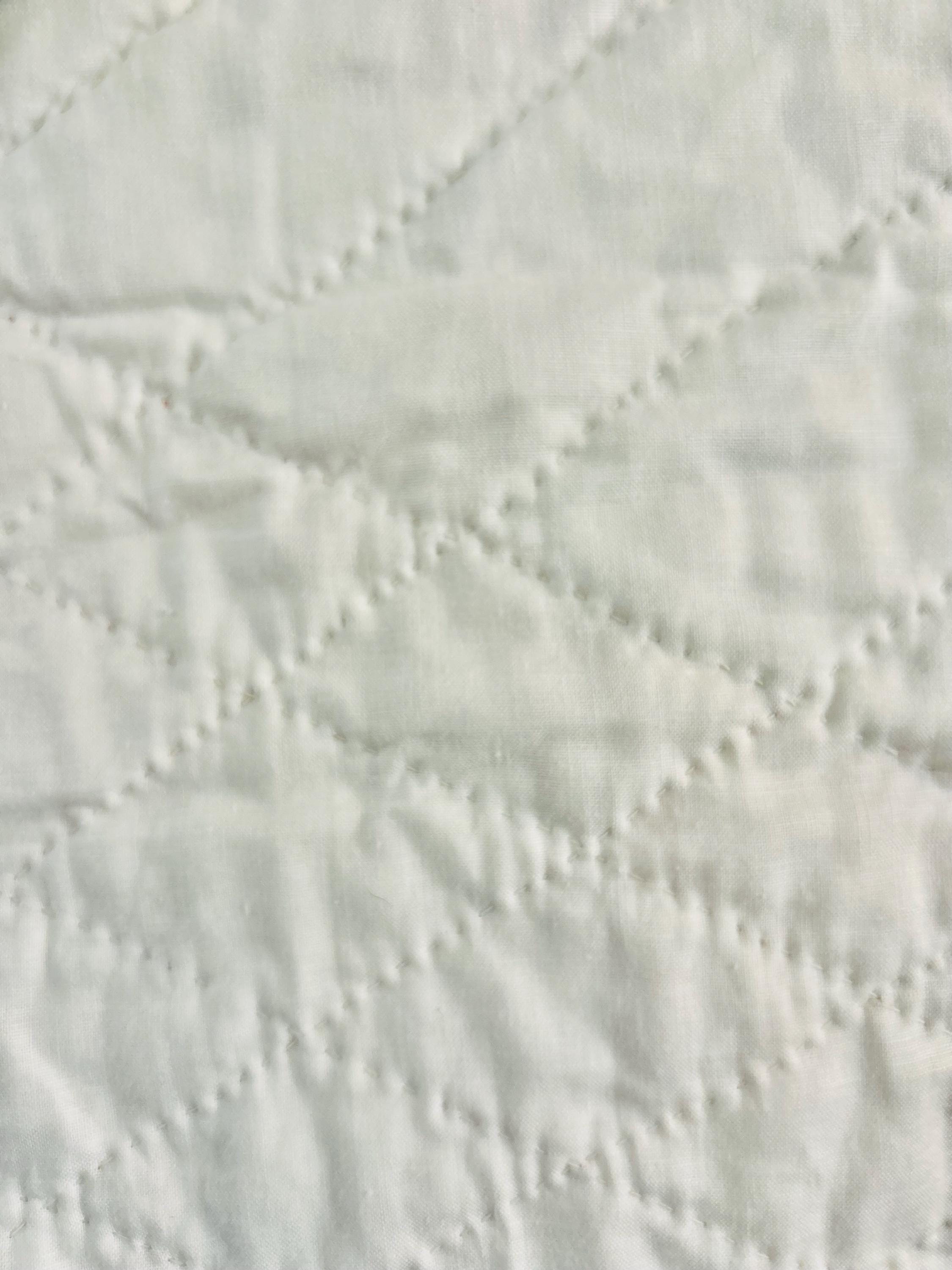 The back is white cotton while the binding is light blue cotton that has been machine stitched to the back and hand-stitched to the front. The cotton batting is lightweight.