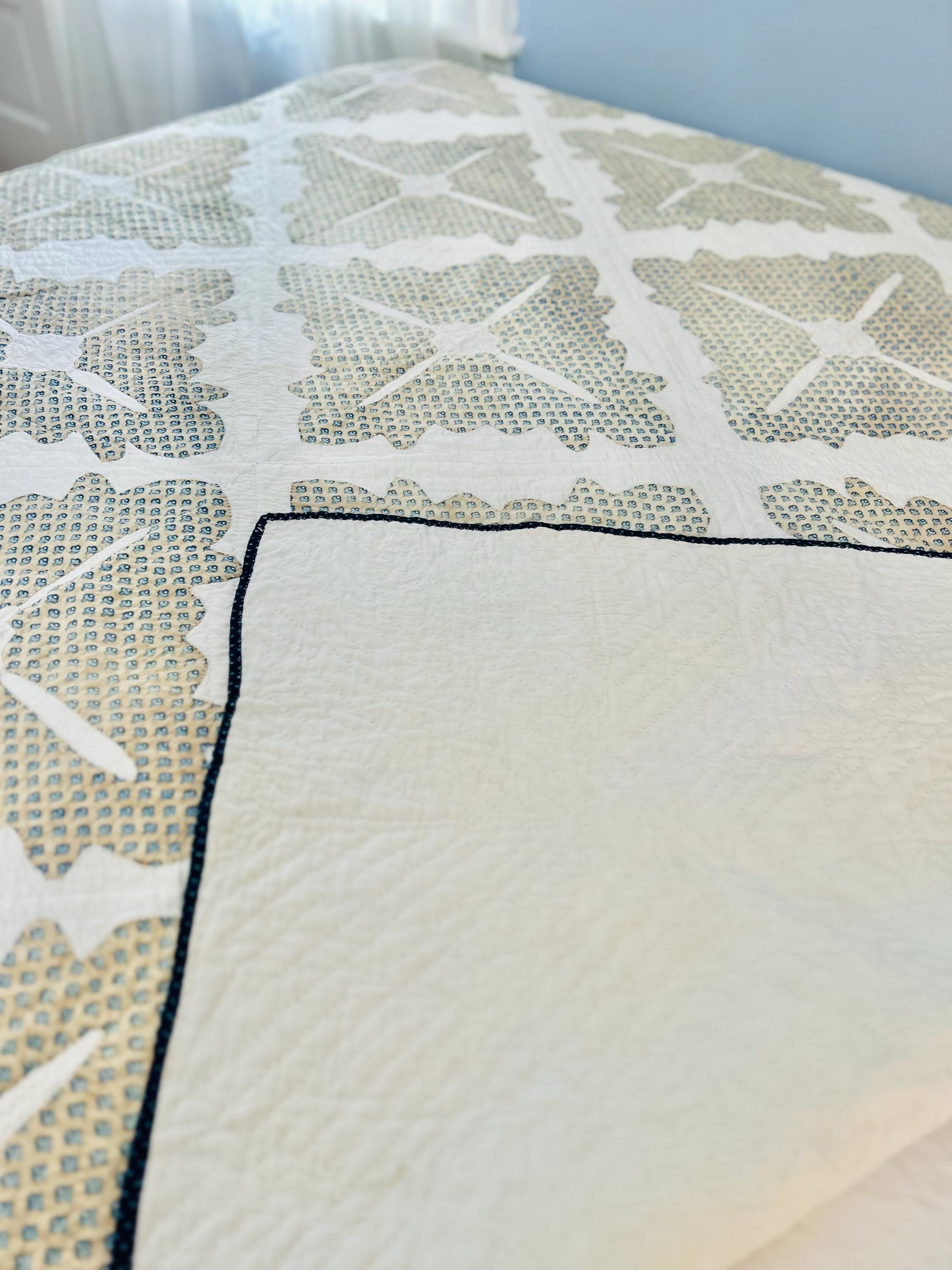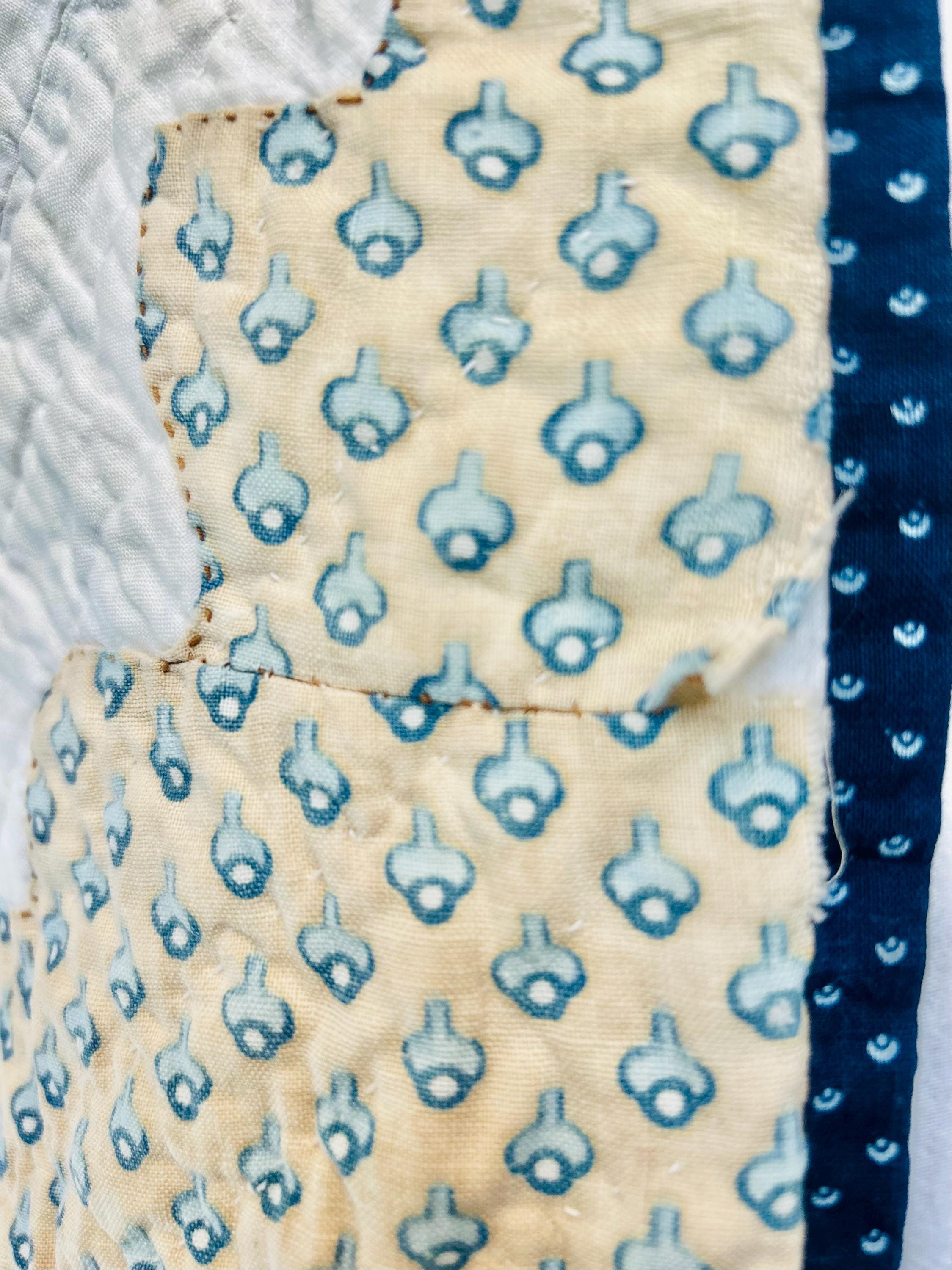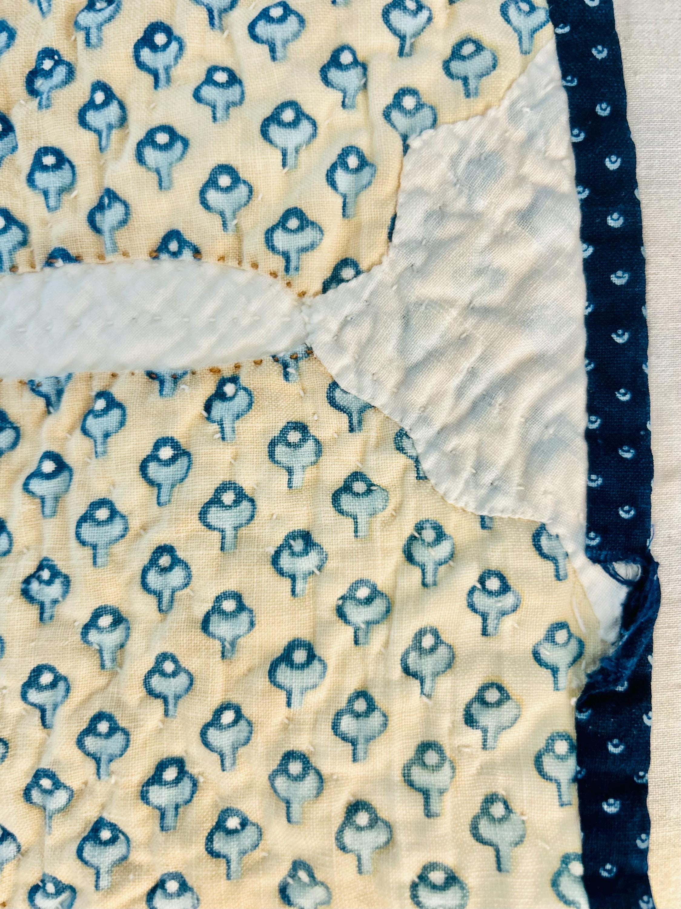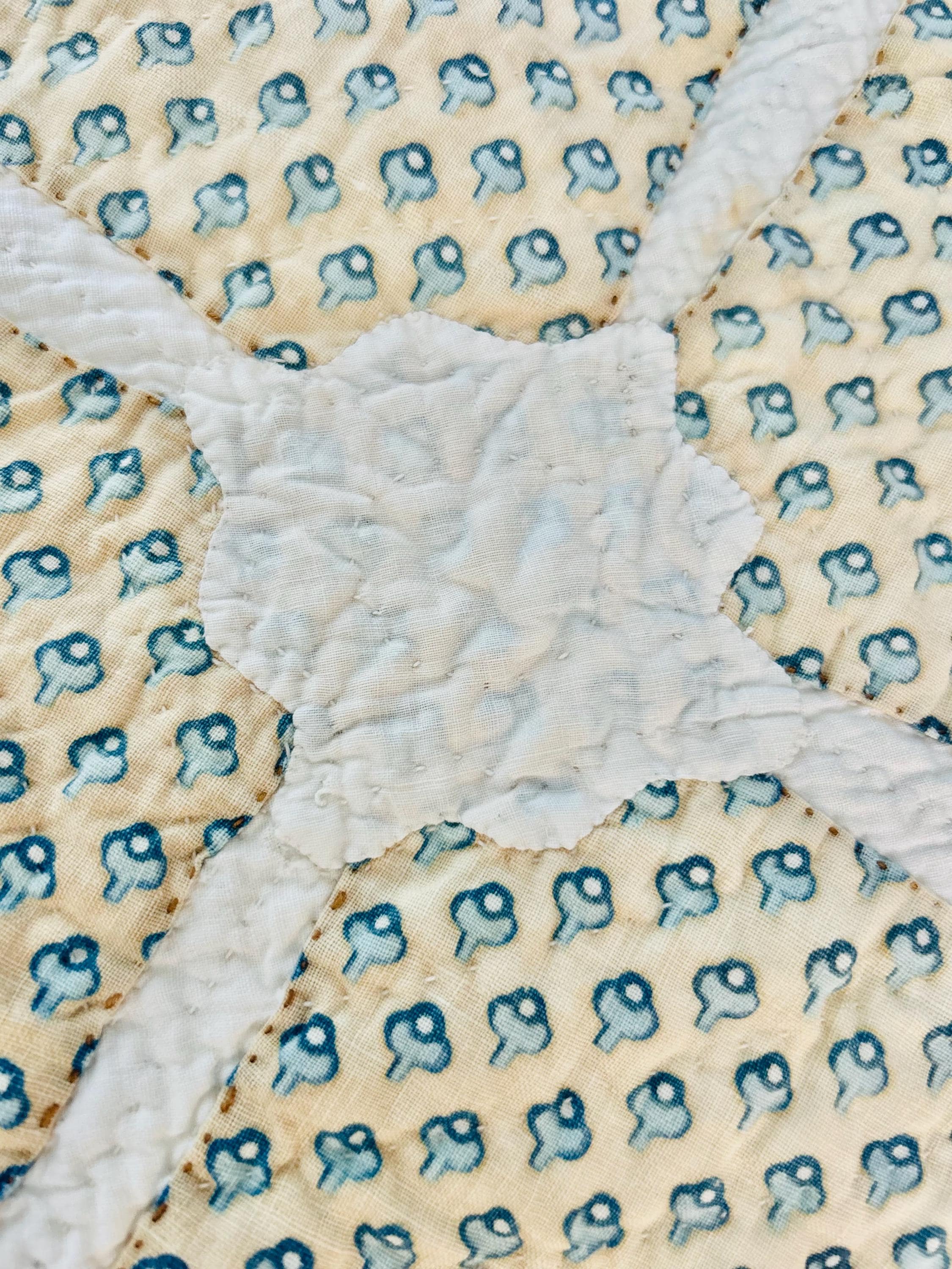 The quilt is in excellent antique condition with one small (half-inch) old repair to the front, some age-related fading of the fabrics and two small seam separations (see photos).
