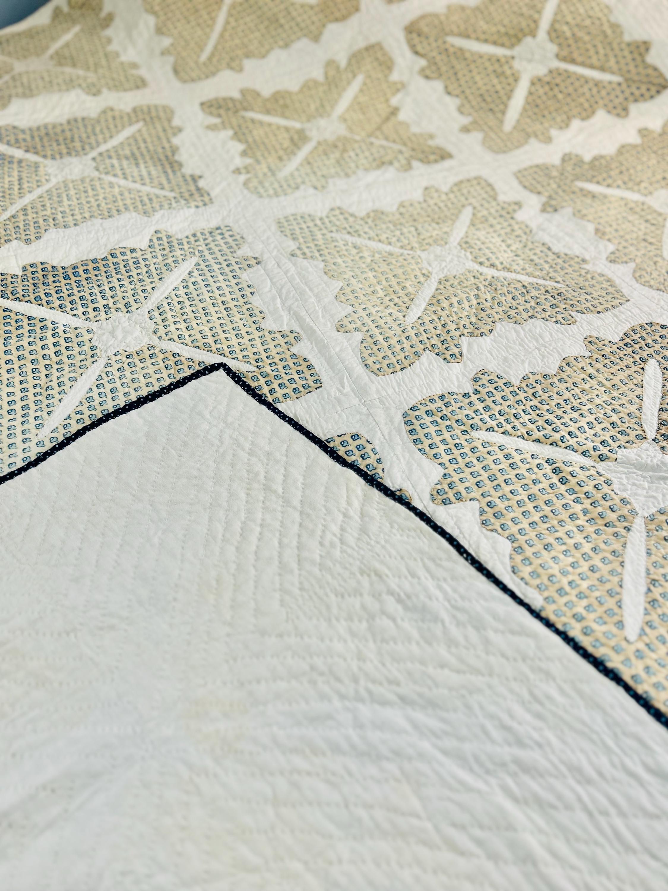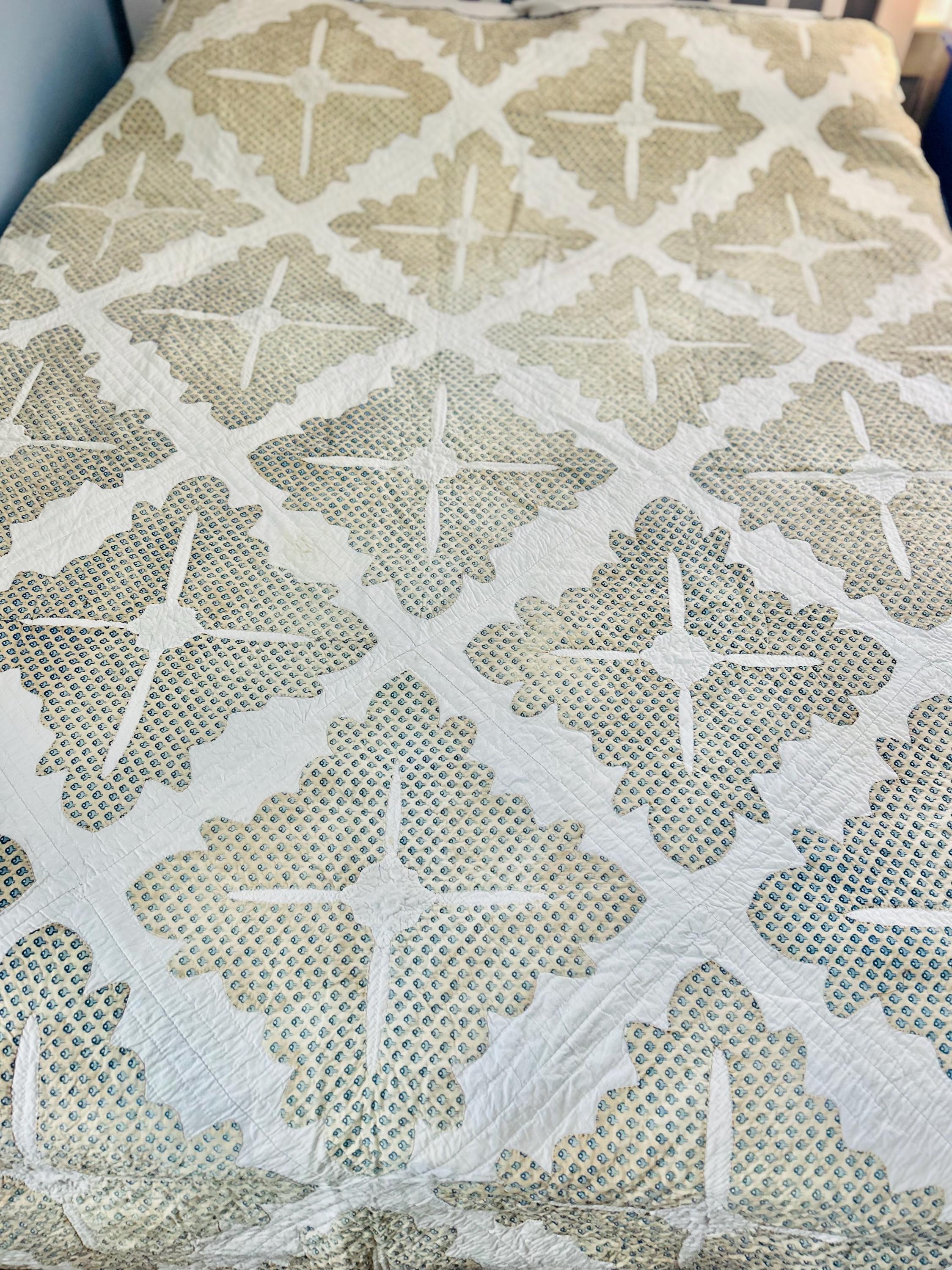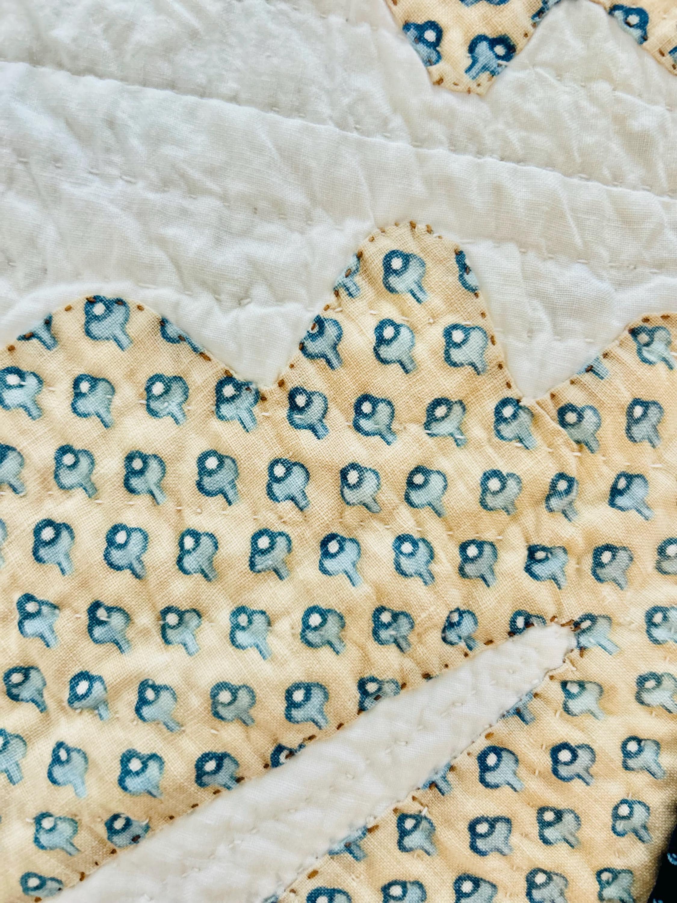The quilt is in excellent antique condition with one small (half-inch) old repair to the front, some age-related fading of the fabrics and two small seam separations (see photos).