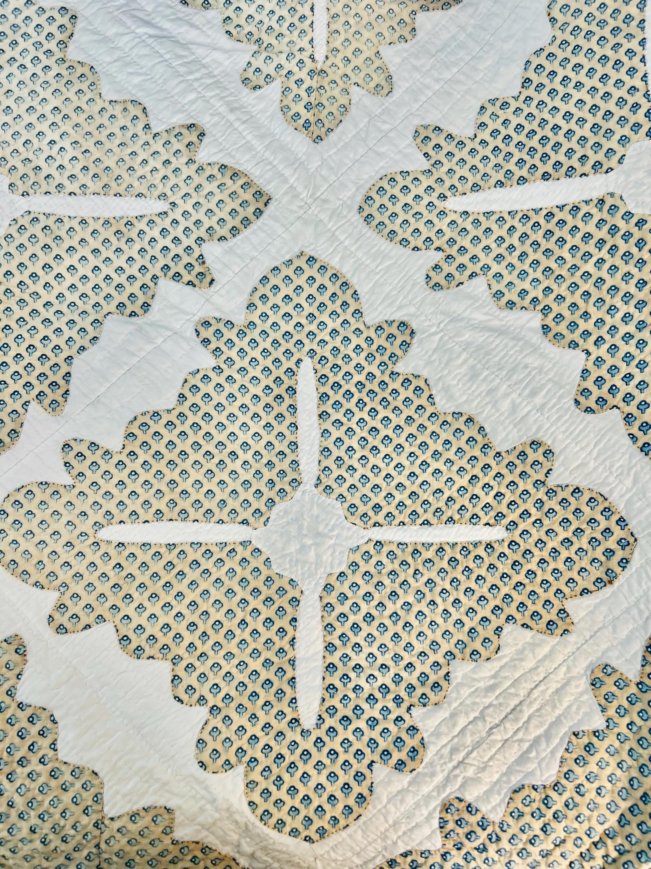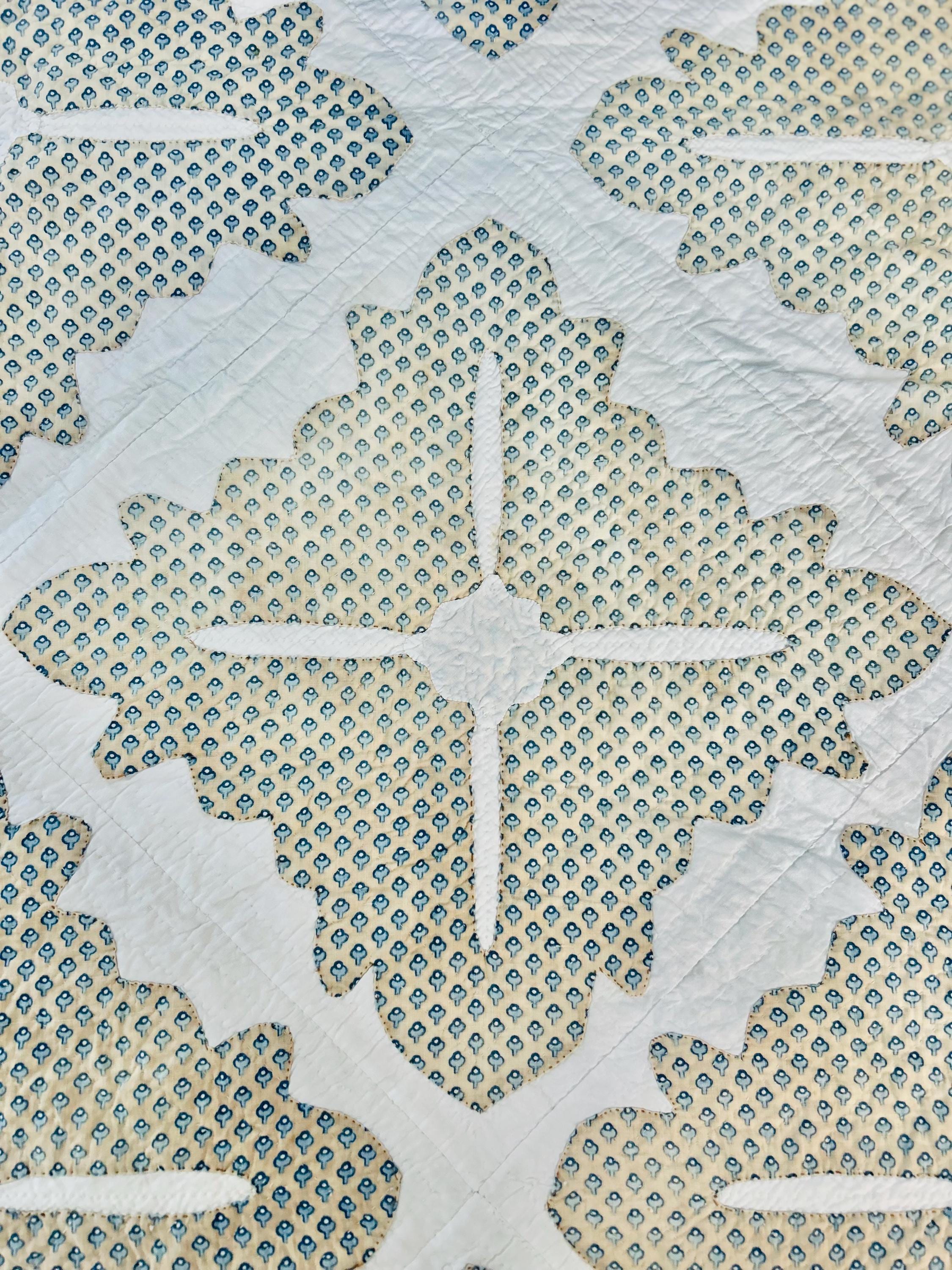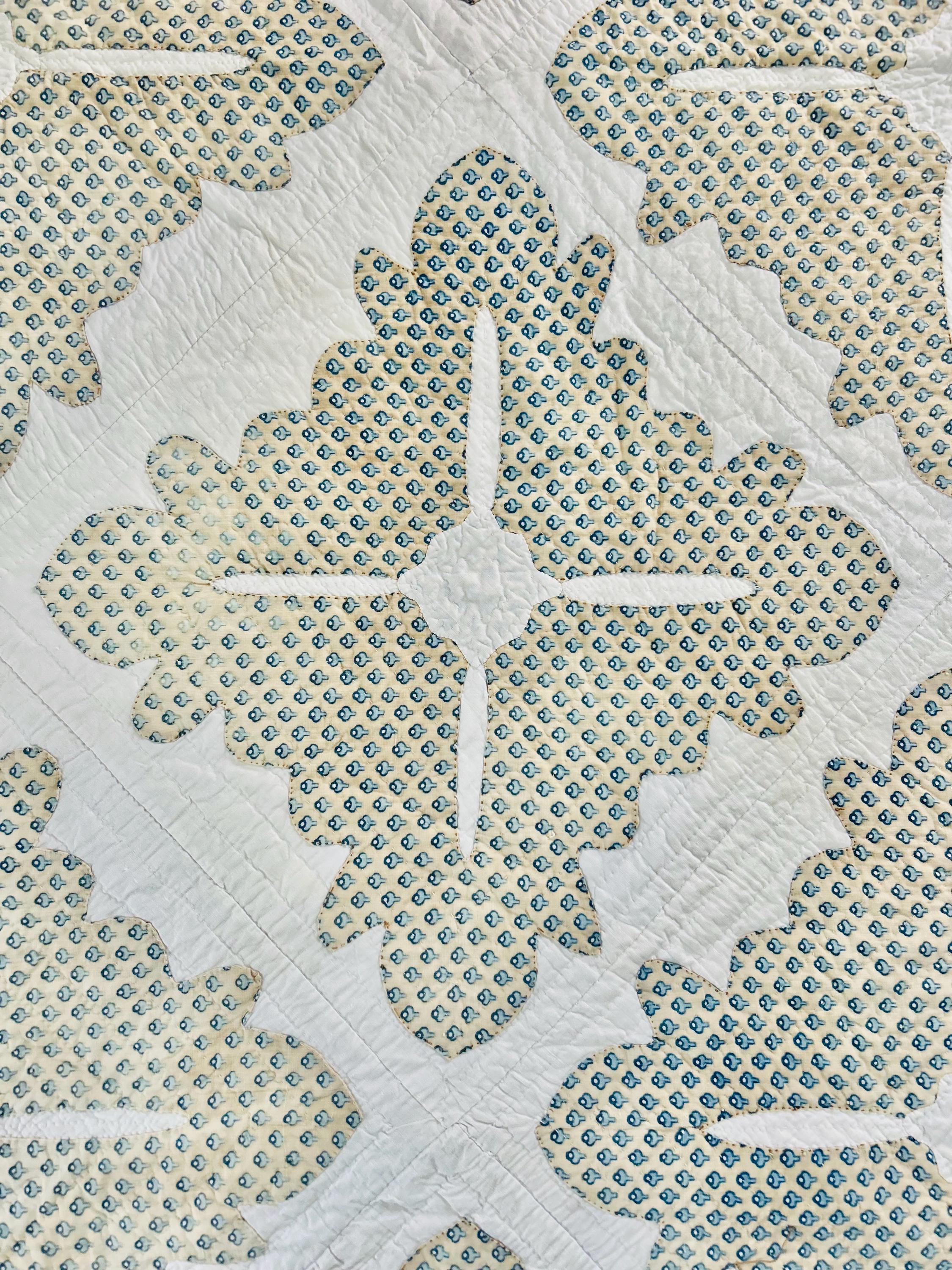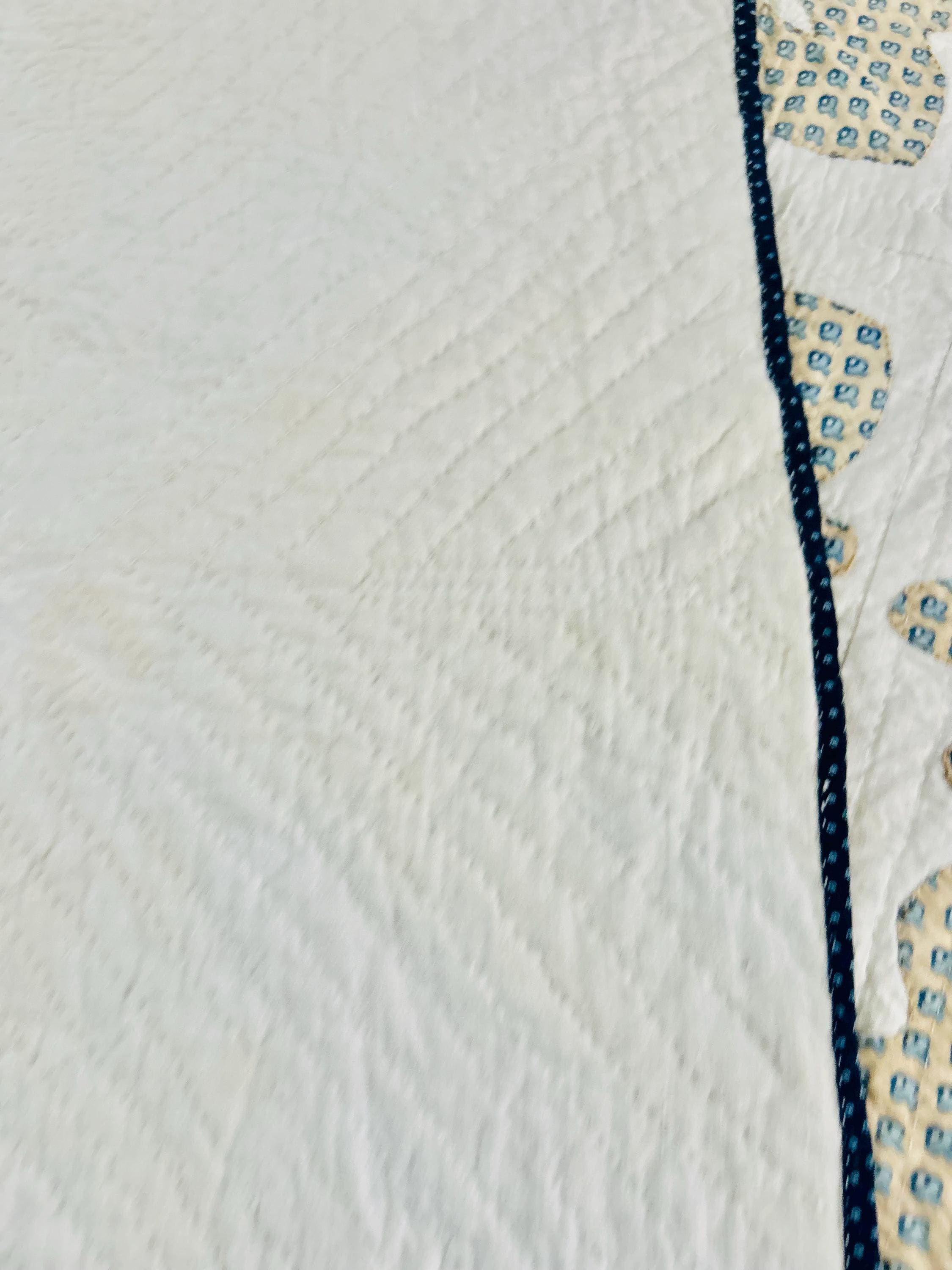 This Scherenschnitte Quilt, circa 1910-1920s, has an unusual design, even for a Scherenschnitte. The applique work has all been hand-stitched in very tiny stitches, while the quilting is in outlines of the applique as well as in concentric triangles spaced very close together.