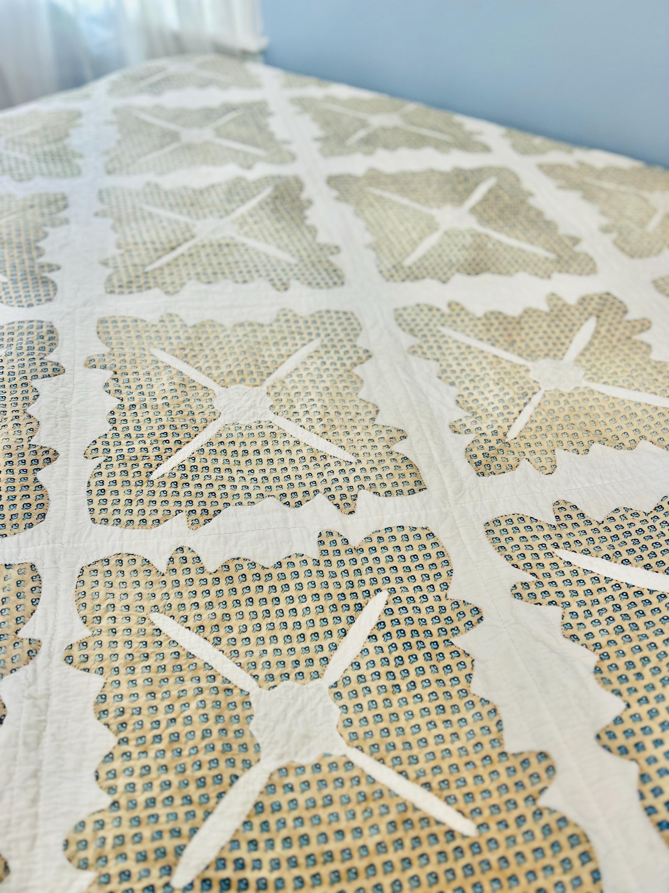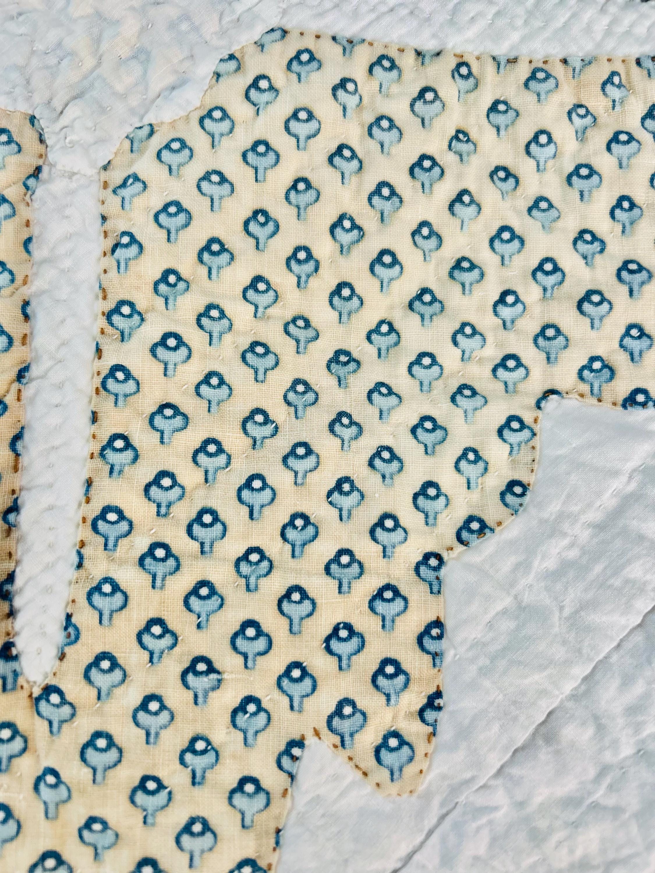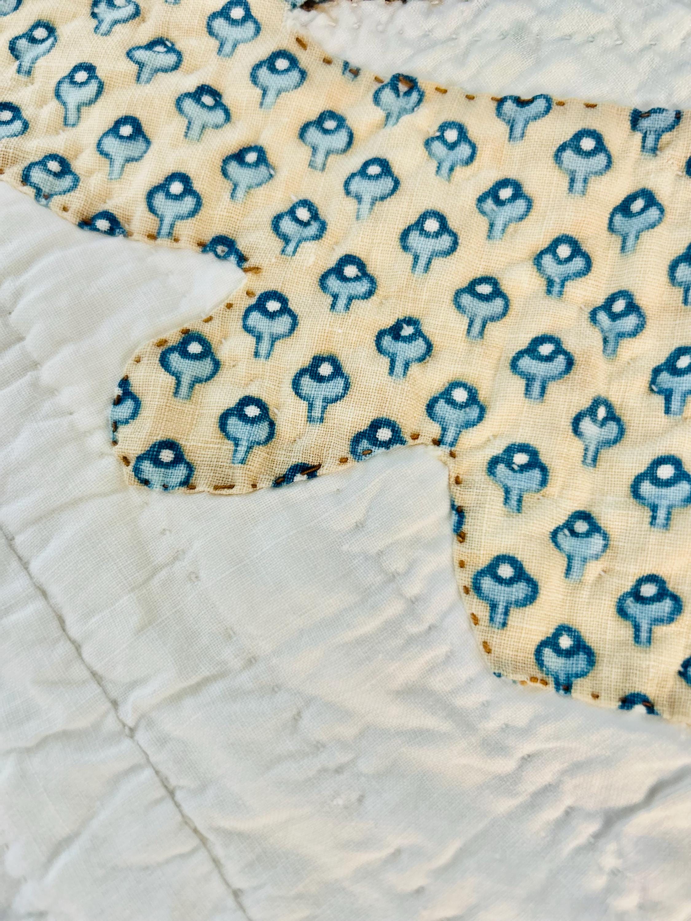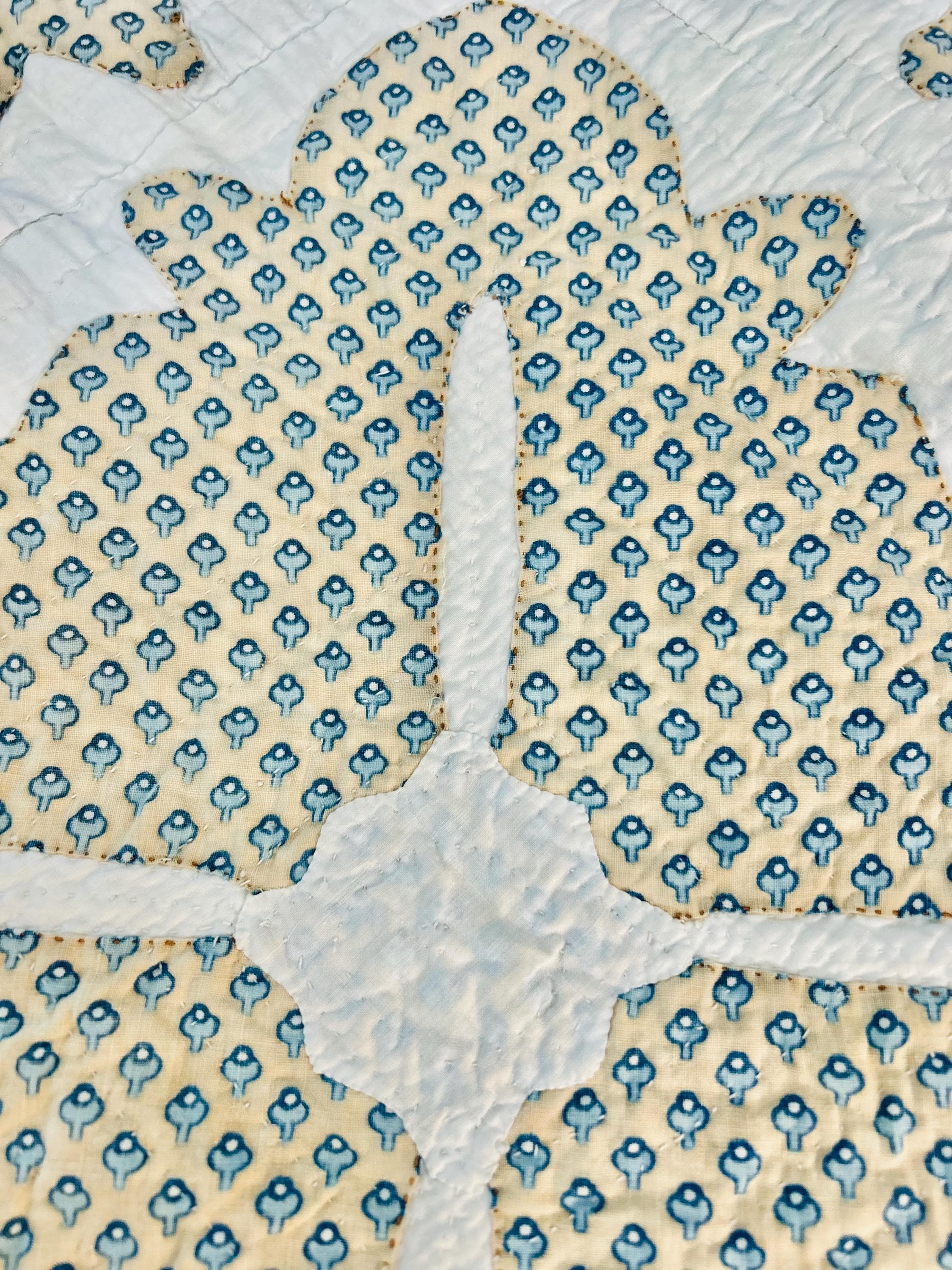 This Scherenschnitte Quilt, circa 1910-1920s, has an unusual design, even for a Scherenschnitte. The applique work has all been hand-stitched in very tiny stitches, while the quilting is in outlines of the applique as well as in concentric triangles spaced very close together.