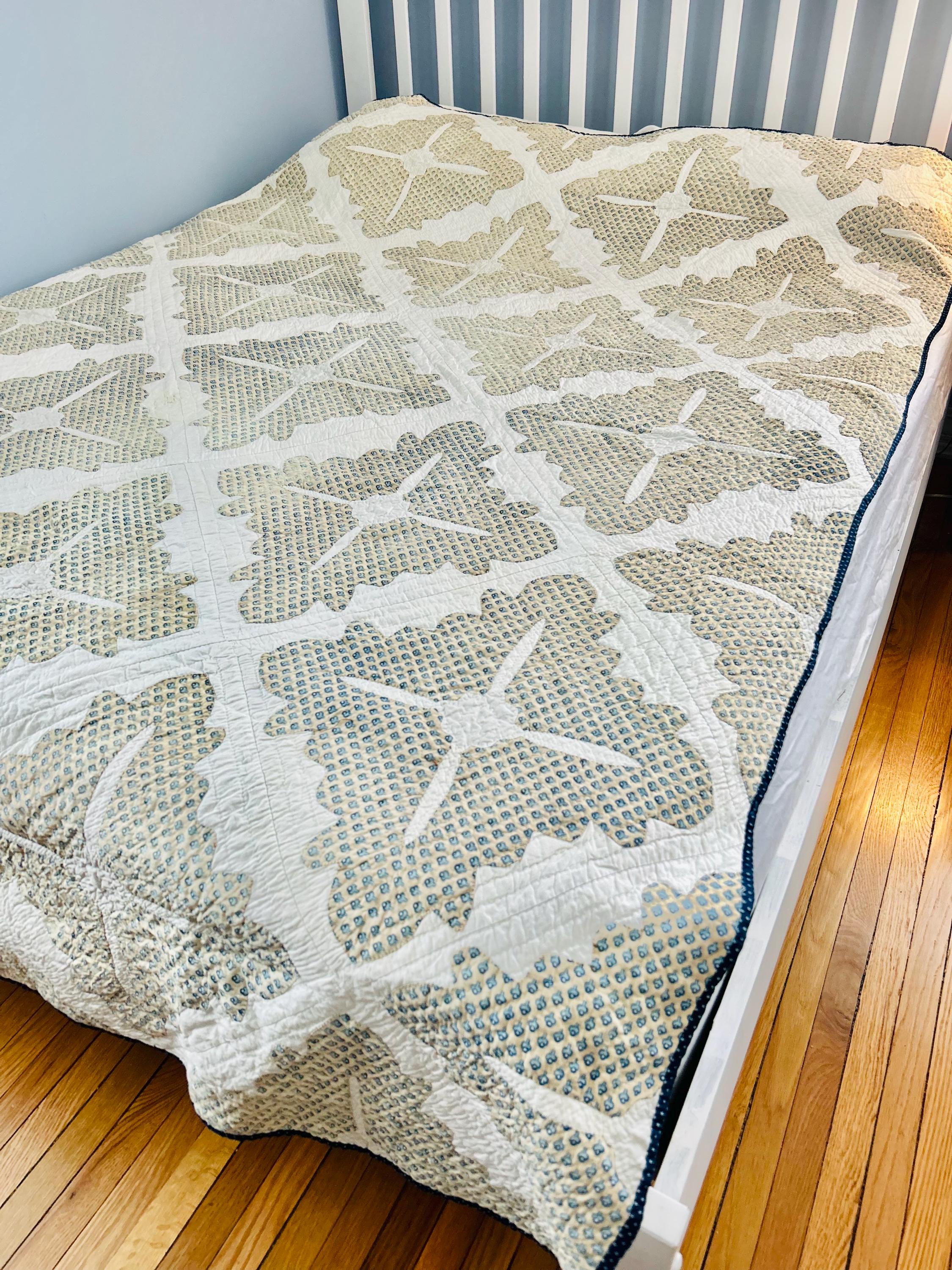 The quilt is approximately 62 inches by 88 inches and comes from a smoke-free and pet-free home. Pictured on a queen-size bed.