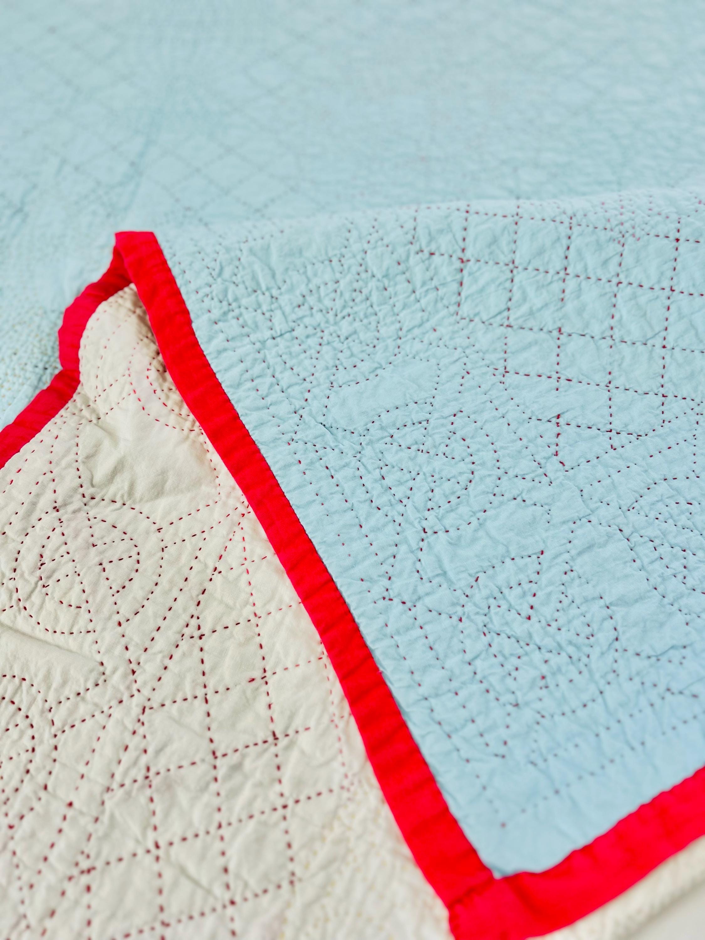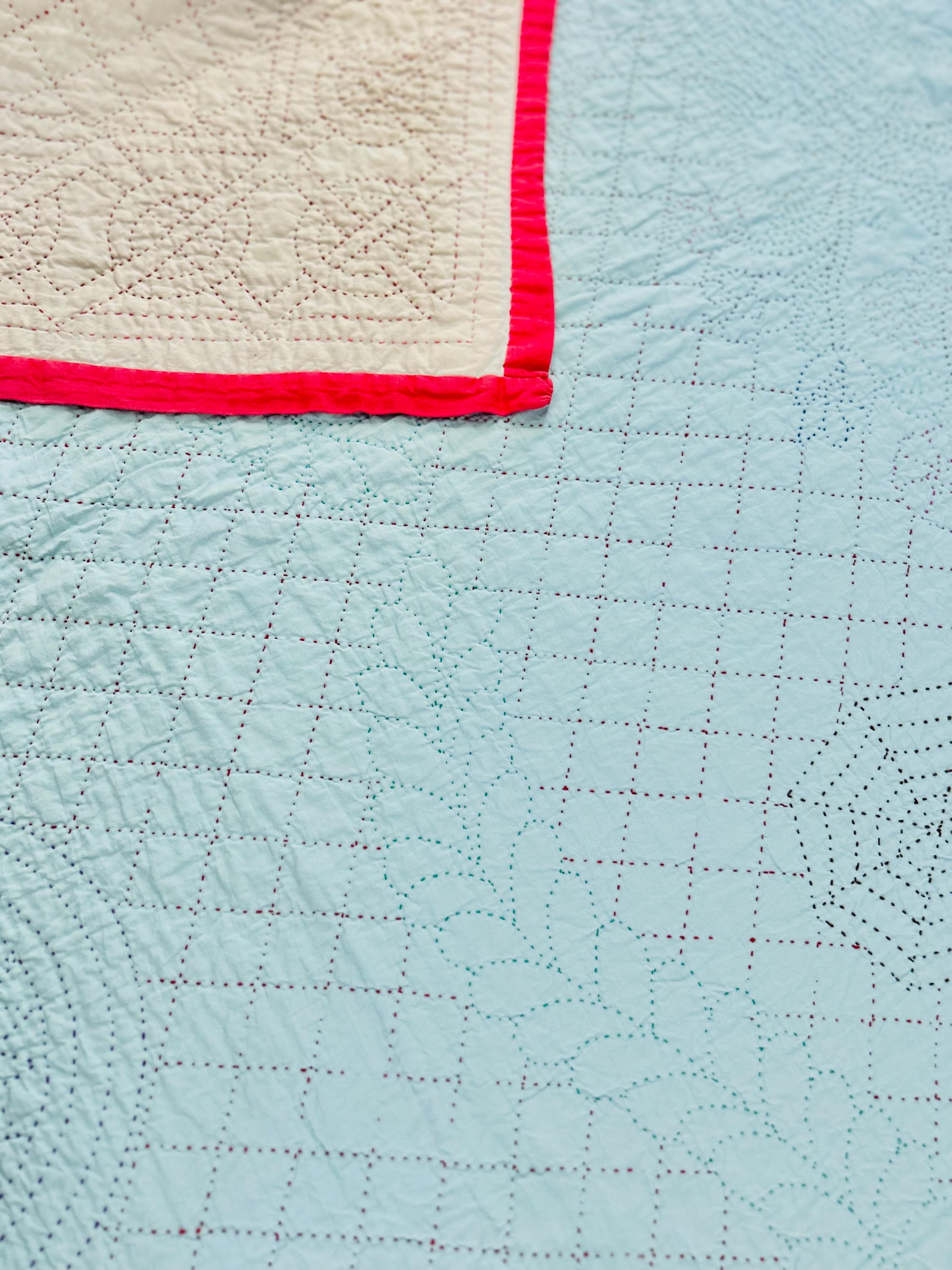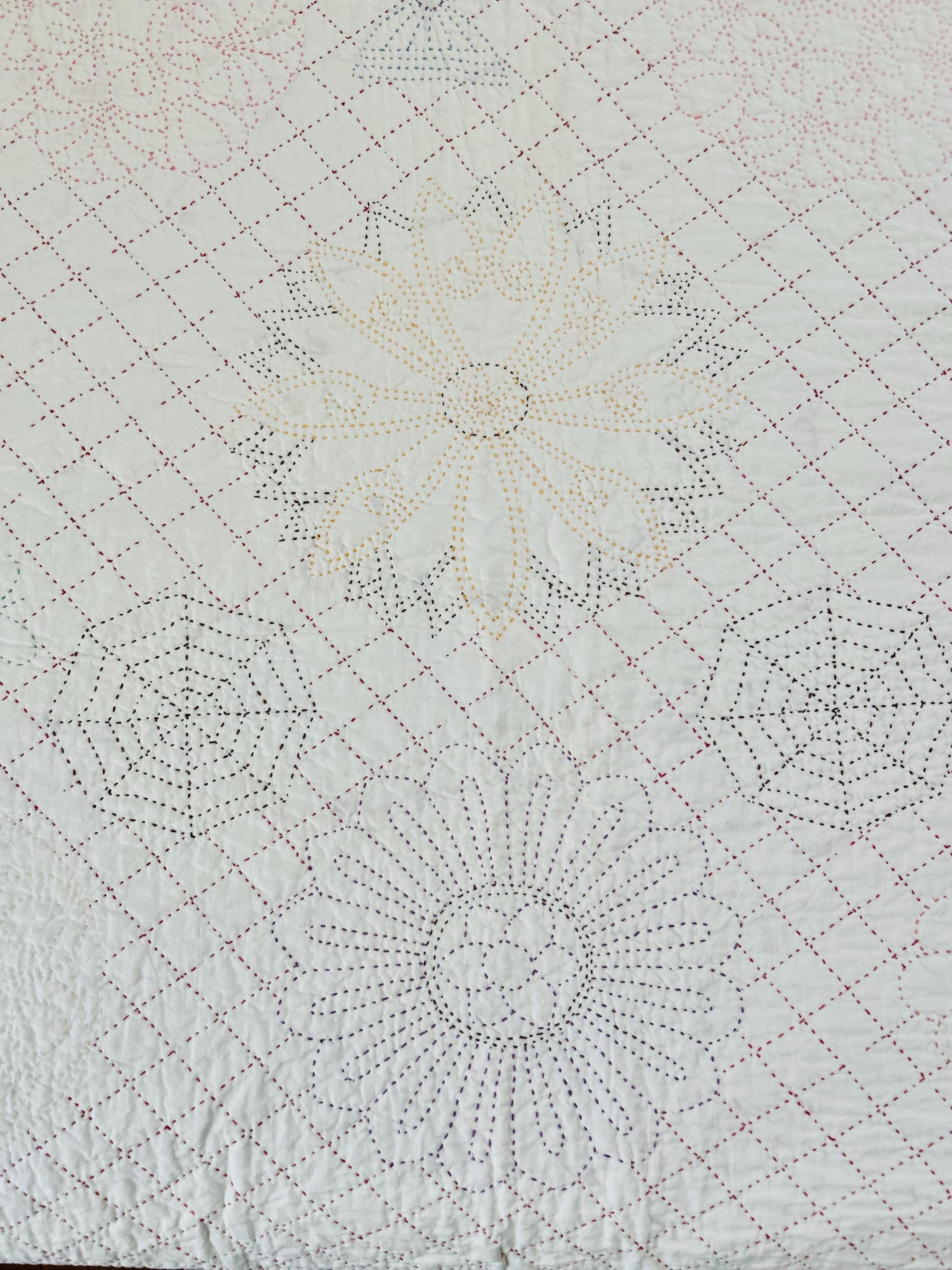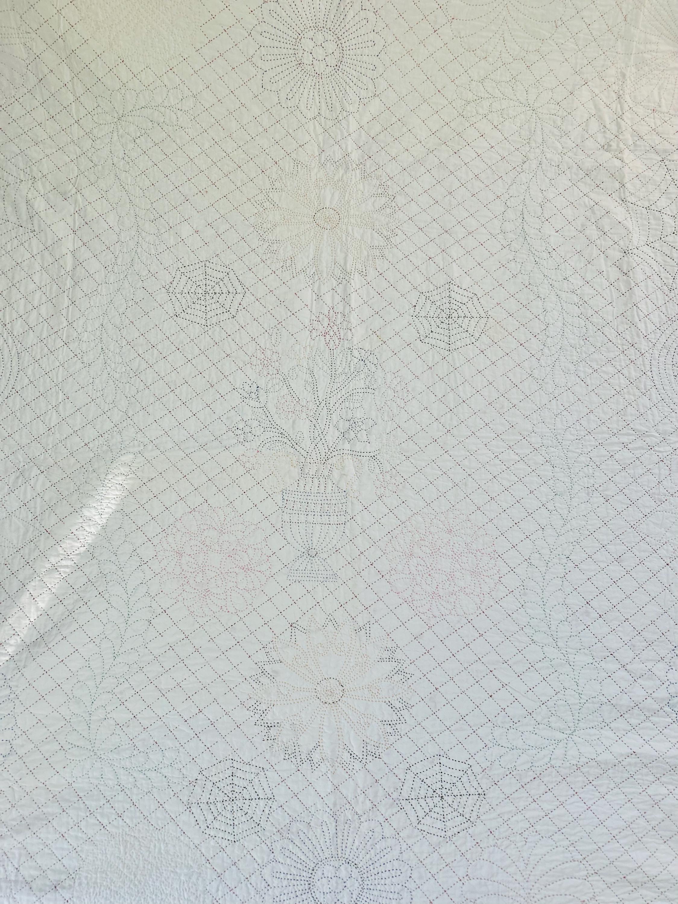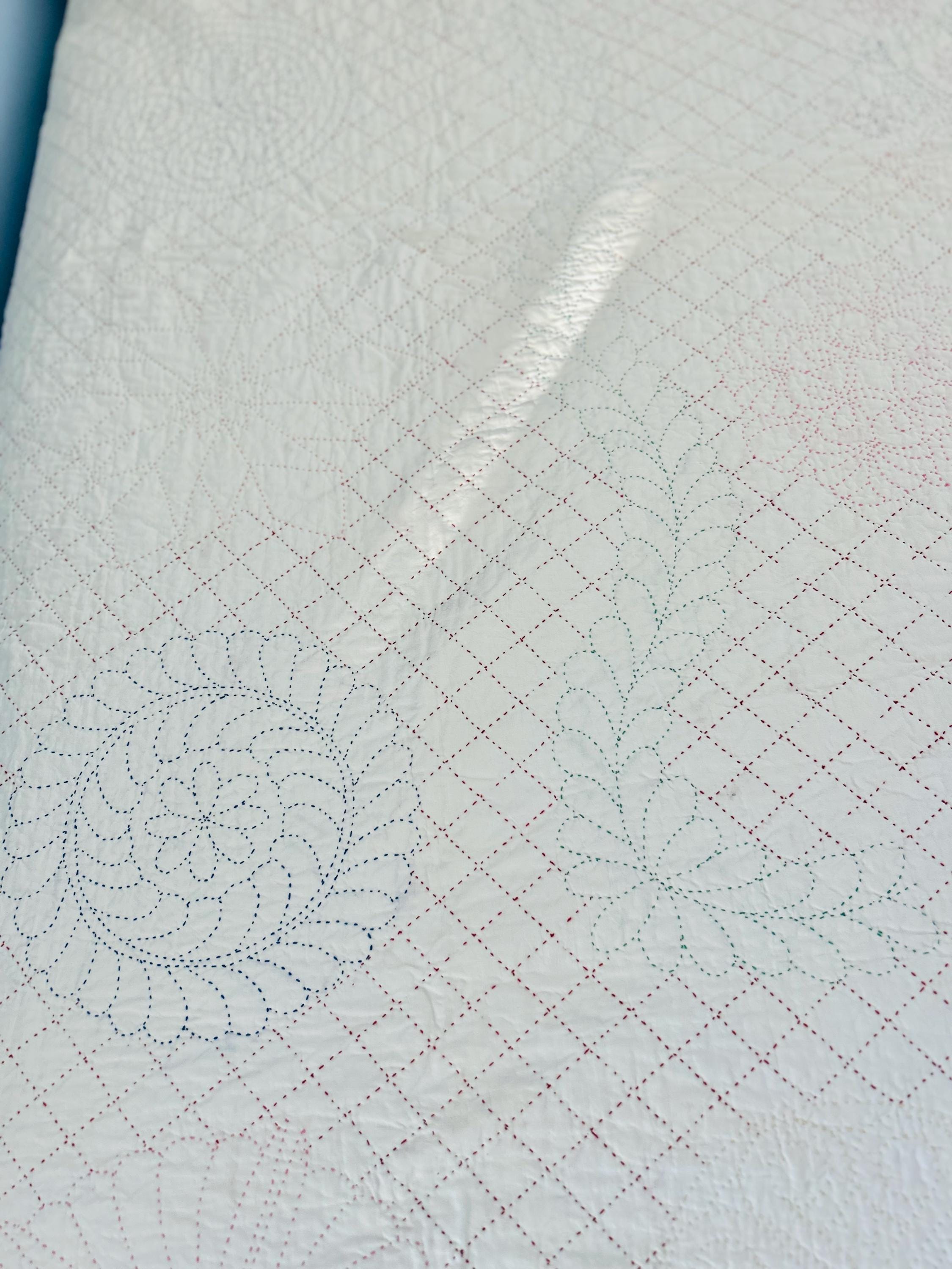 This Wholecloth Quilt, circa 1930s, is interchangeable between the blue and the white sides. The quilting threads are red, yellow, dark blue, green, cheddar/orange, brown and pink and all of them highlight the quilt patterns on both sides of the quilt. The hand quilting is in feathers, feather wreaths, flowers, modified feather/star wreaths, and a geometric cross-and-circle pattern along the borders.