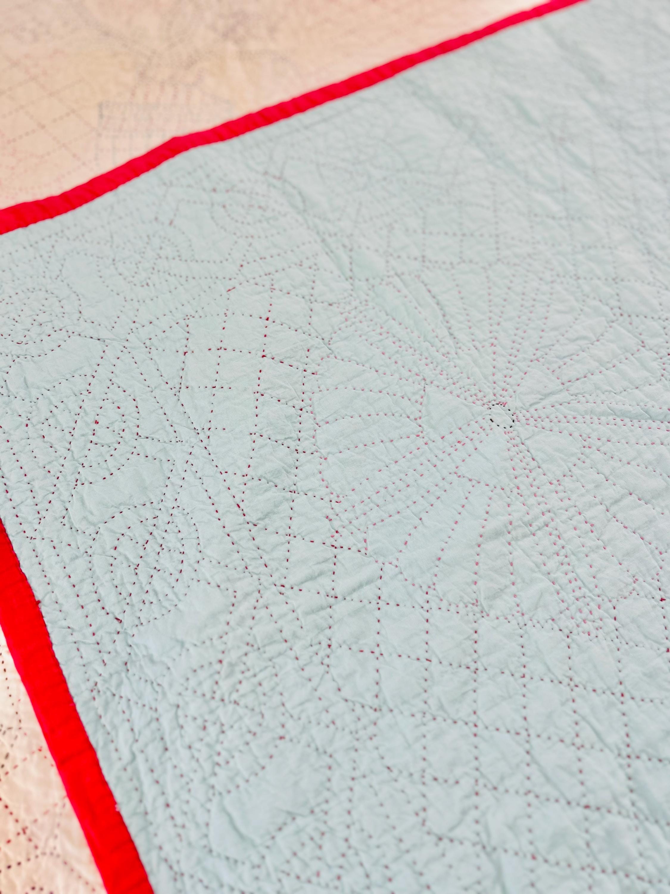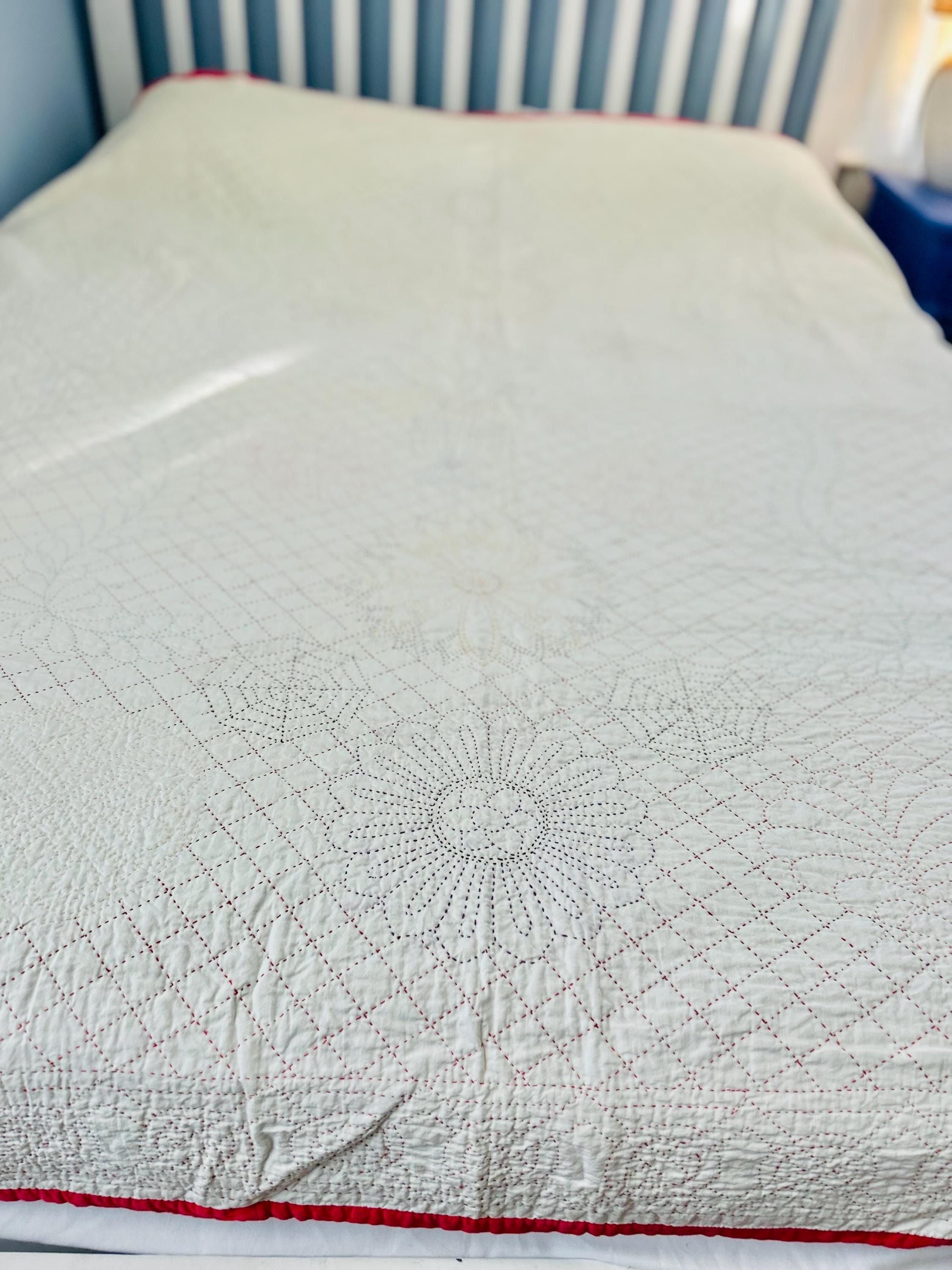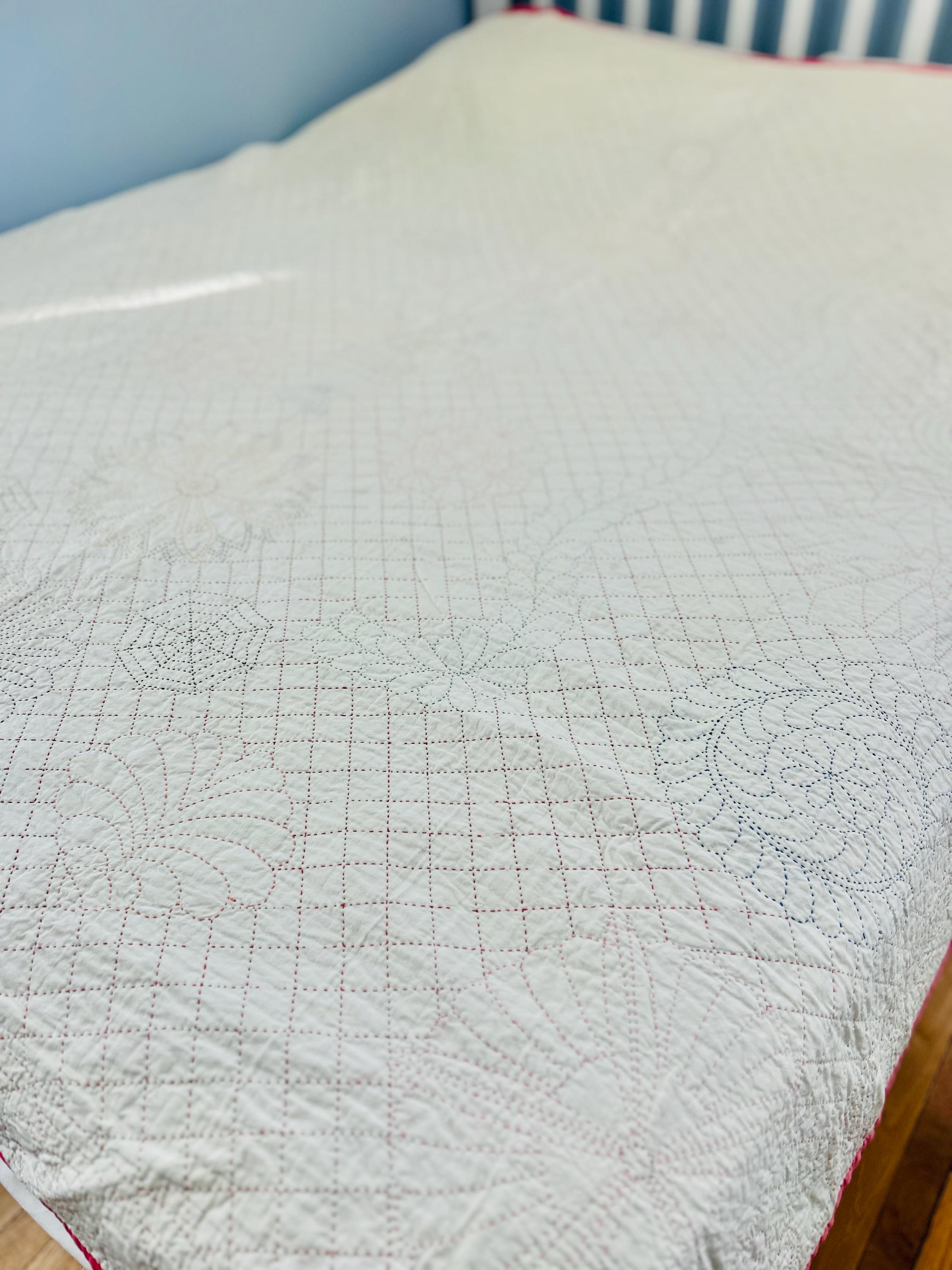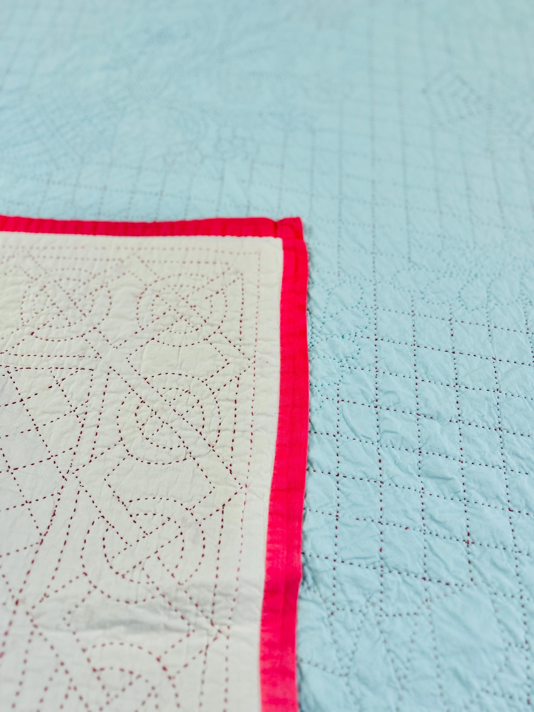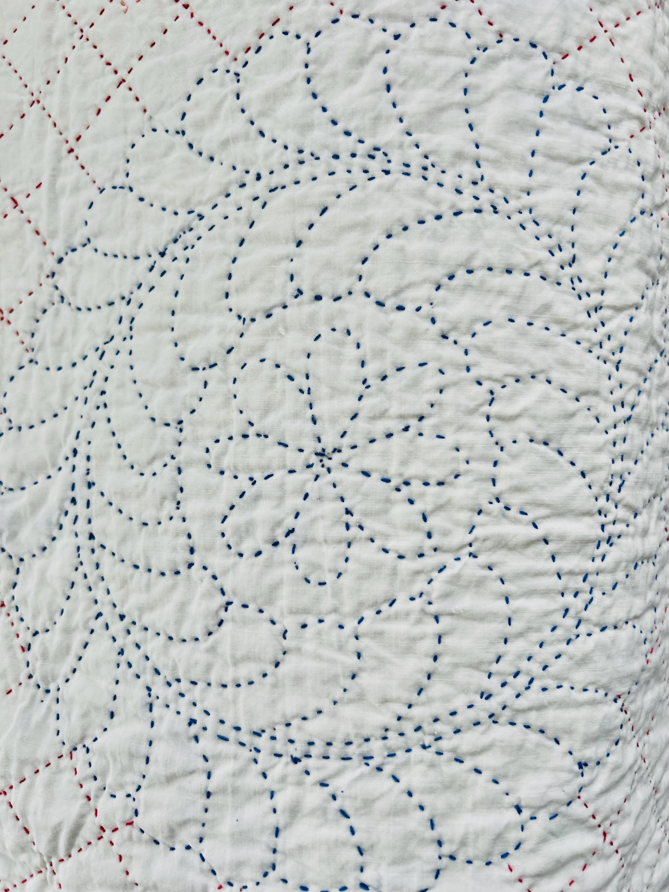 This Wholecloth Quilt, circa 1930s, is interchangeable between the blue and the white sides. The quilting threads are red, yellow, dark blue, green, cheddar/orange, brown and pink and all of them highlight the quilt patterns on both sides of the quilt. The hand quilting is in feathers, feather wreaths, flowers, modified feather/star wreaths, and a geometric cross-and-circle pattern along the borders.