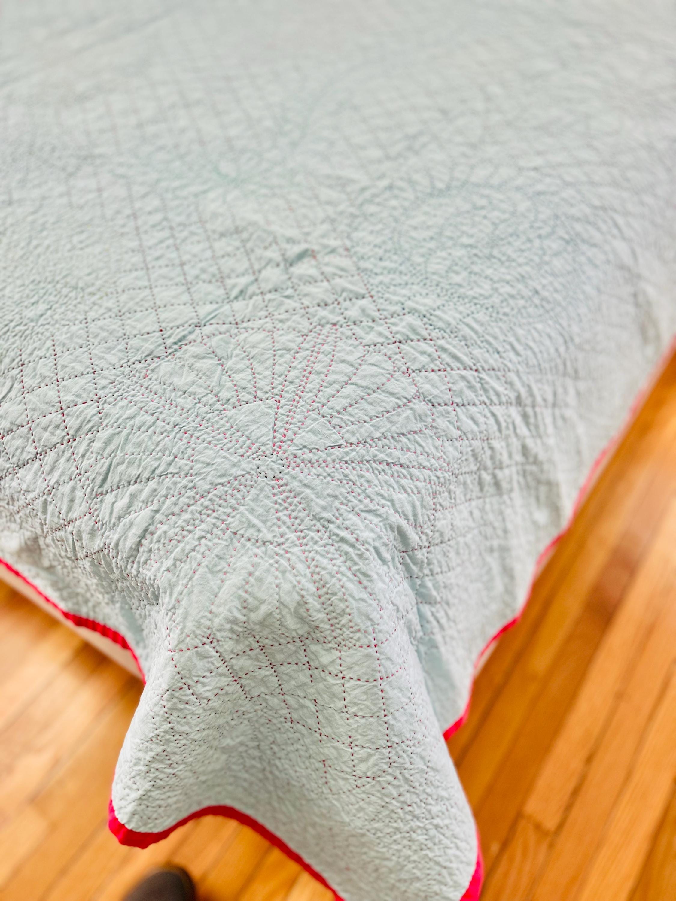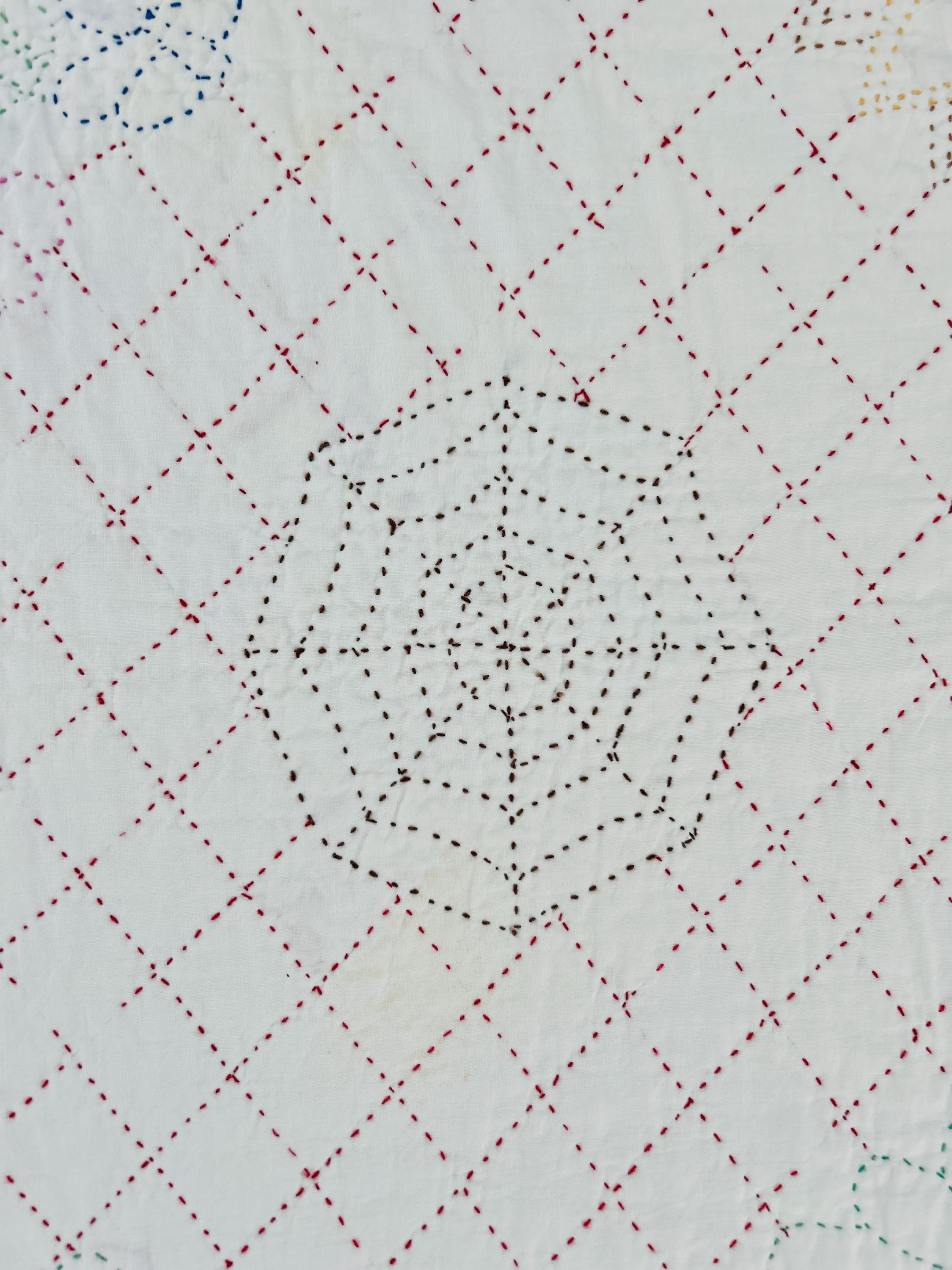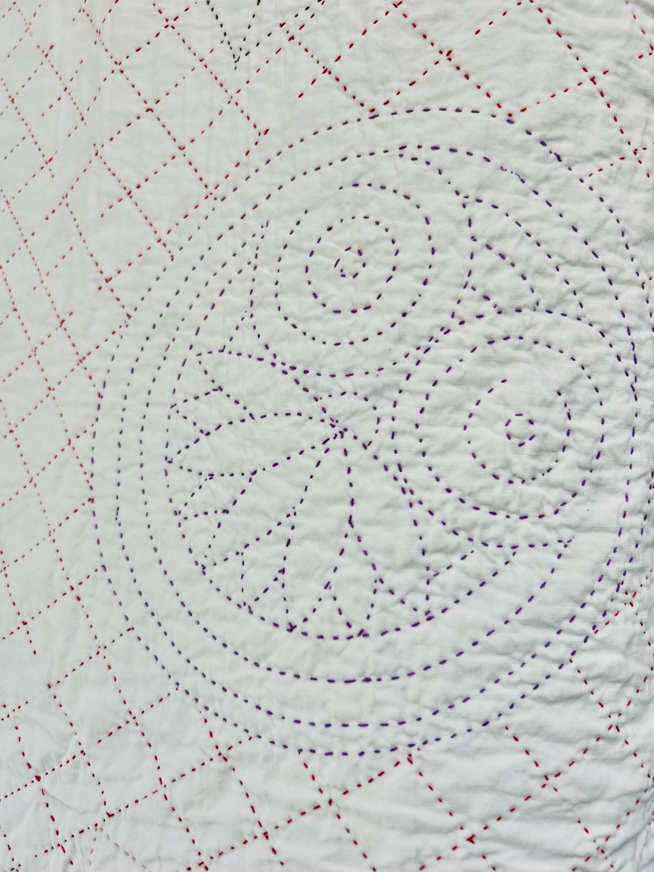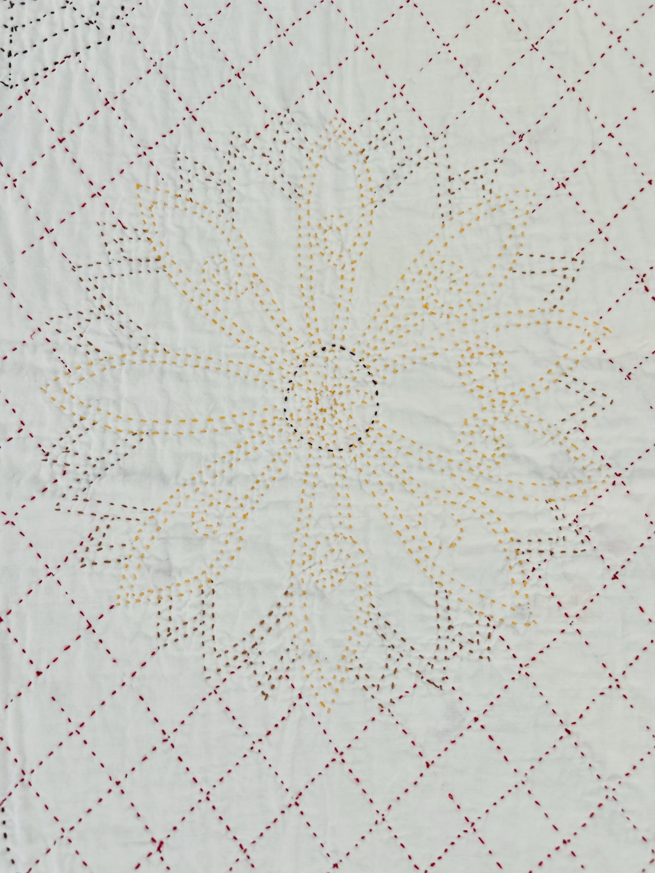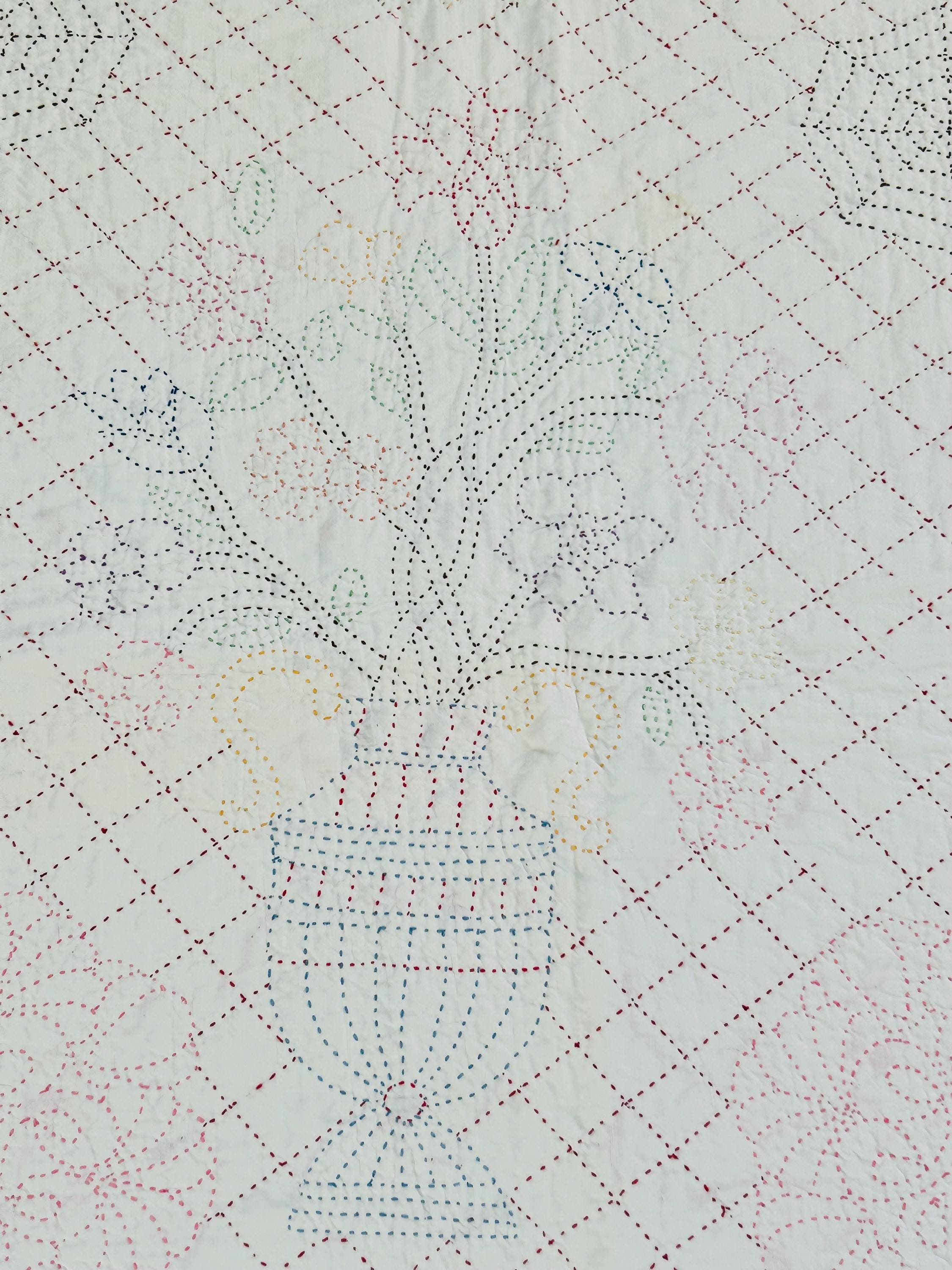 This Wholecloth Quilt, circa 1930s, is interchangeable between the blue and the white sides. The quilting threads are red, yellow, dark blue, green, cheddar/orange, brown and pink and all of them highlight the quilt patterns on both sides of the quilt. The hand quilting is in feathers, feather wreaths, flowers, modified feather/star wreaths, and a geometric cross-and-circle pattern along the borders.