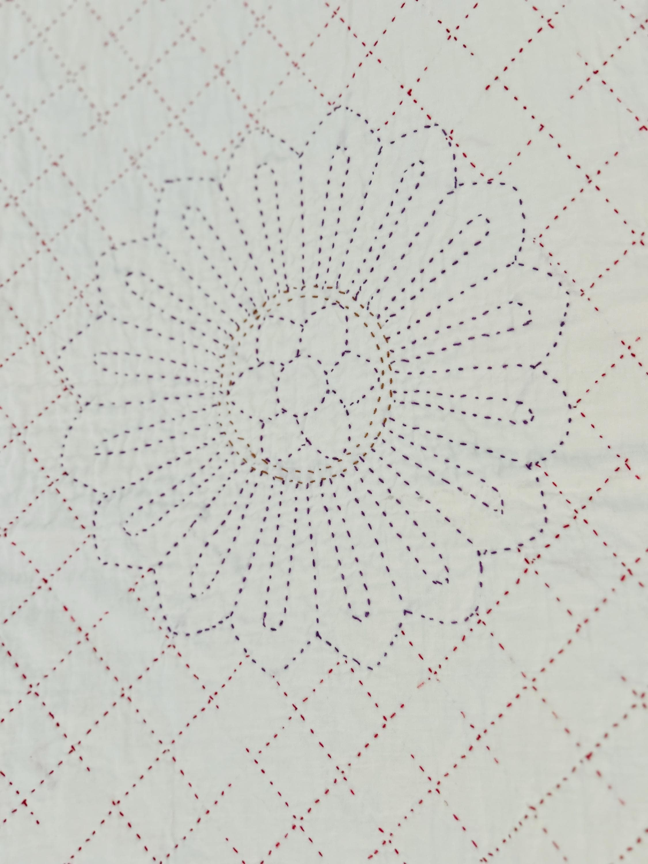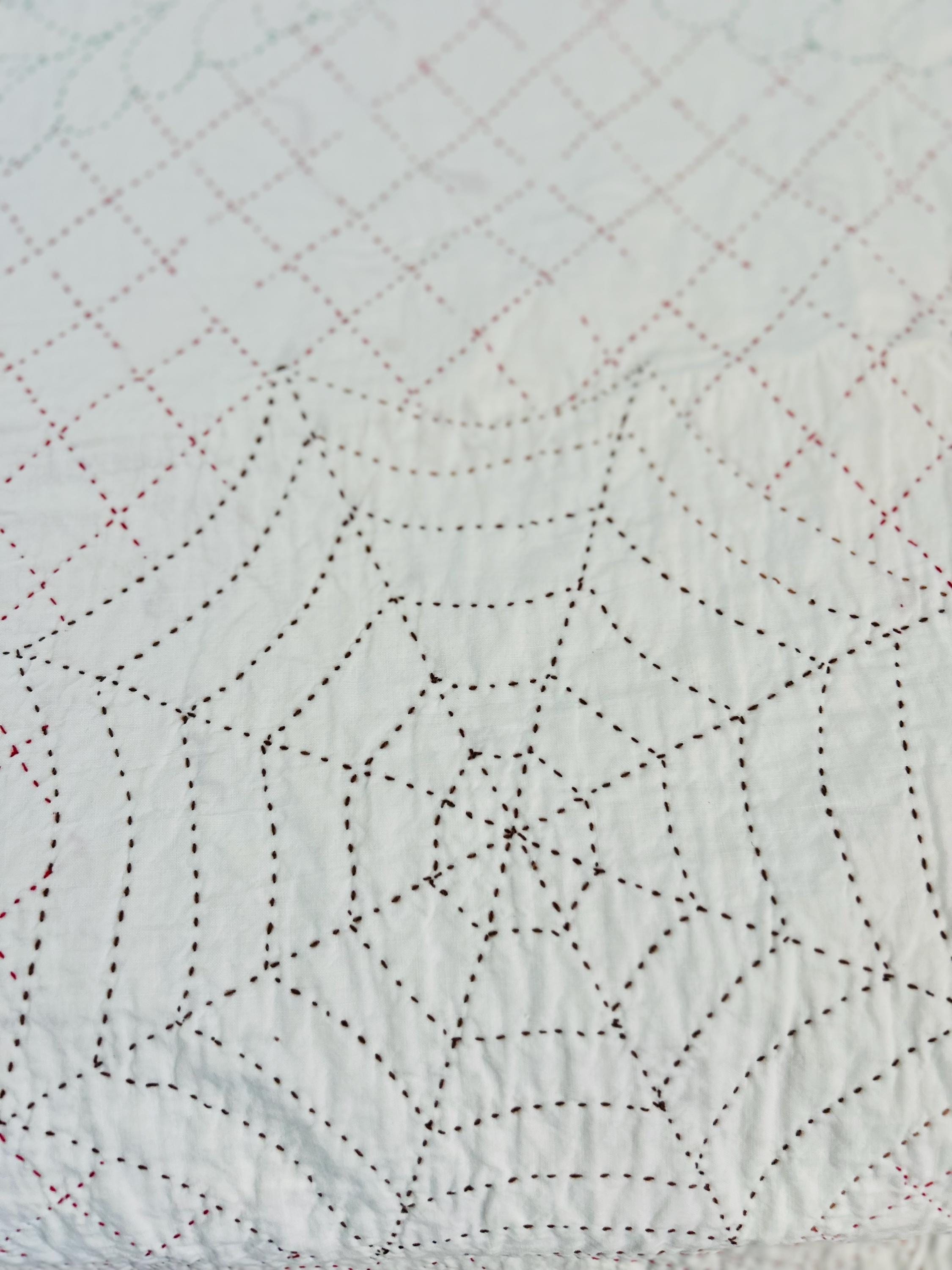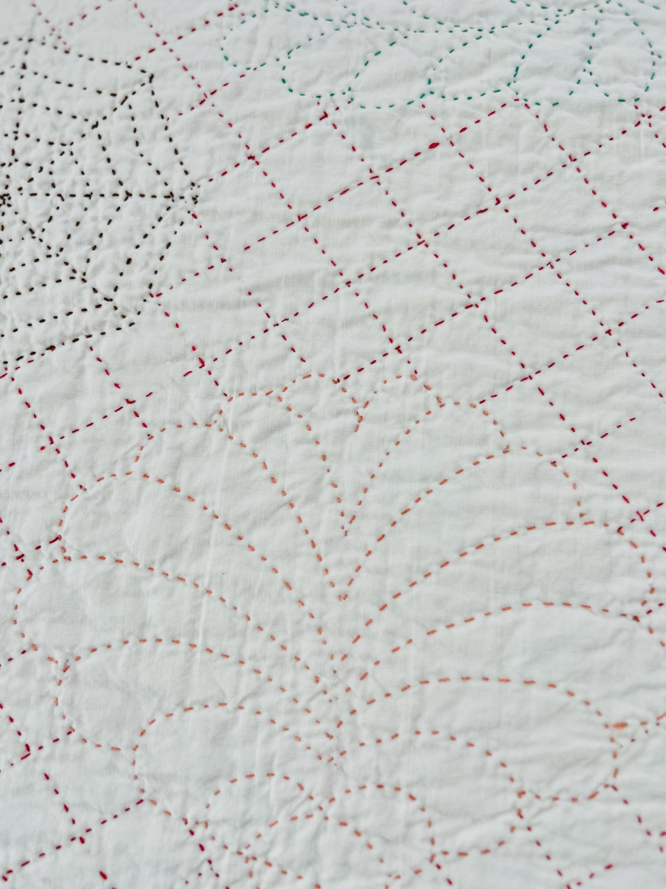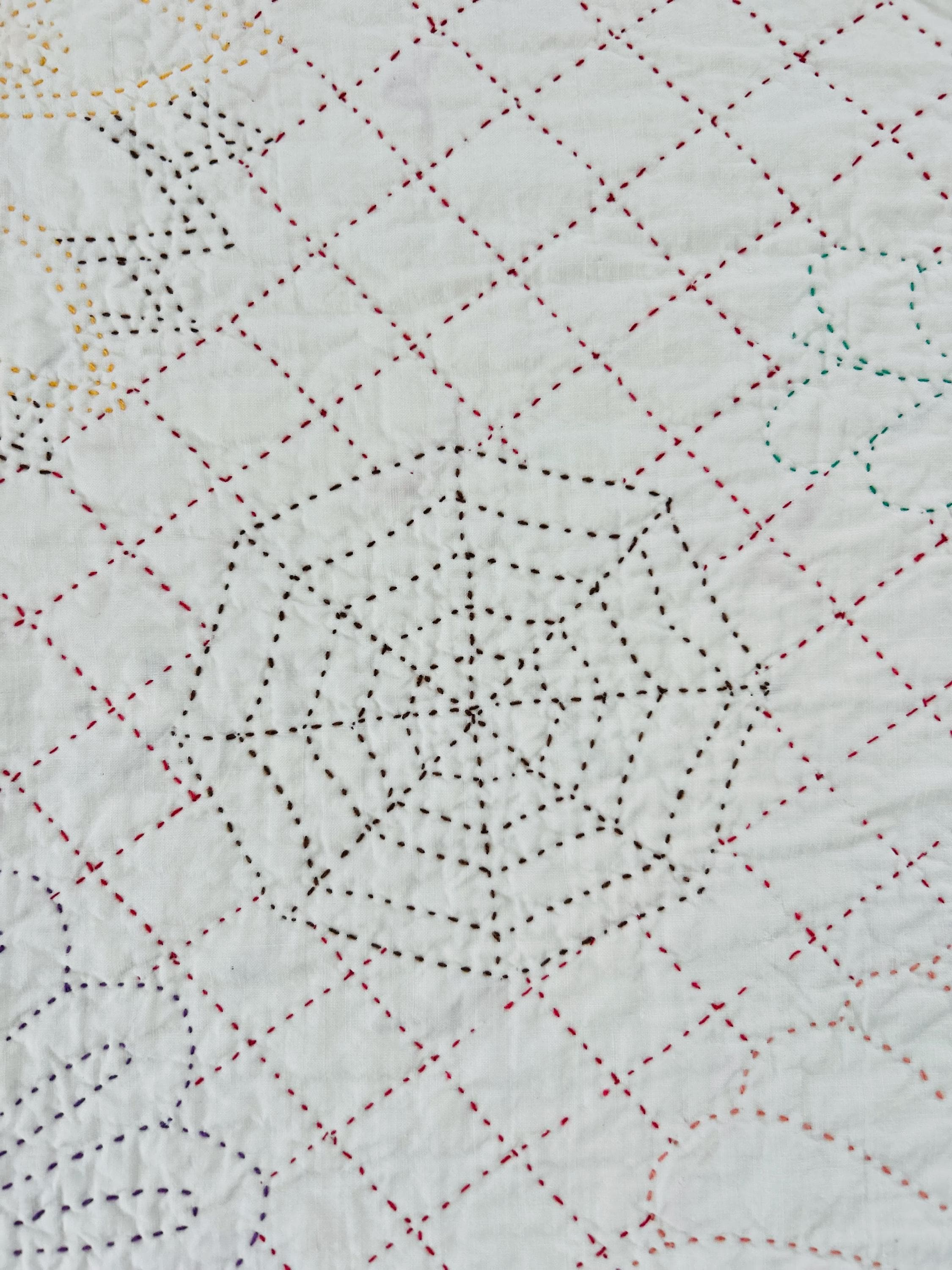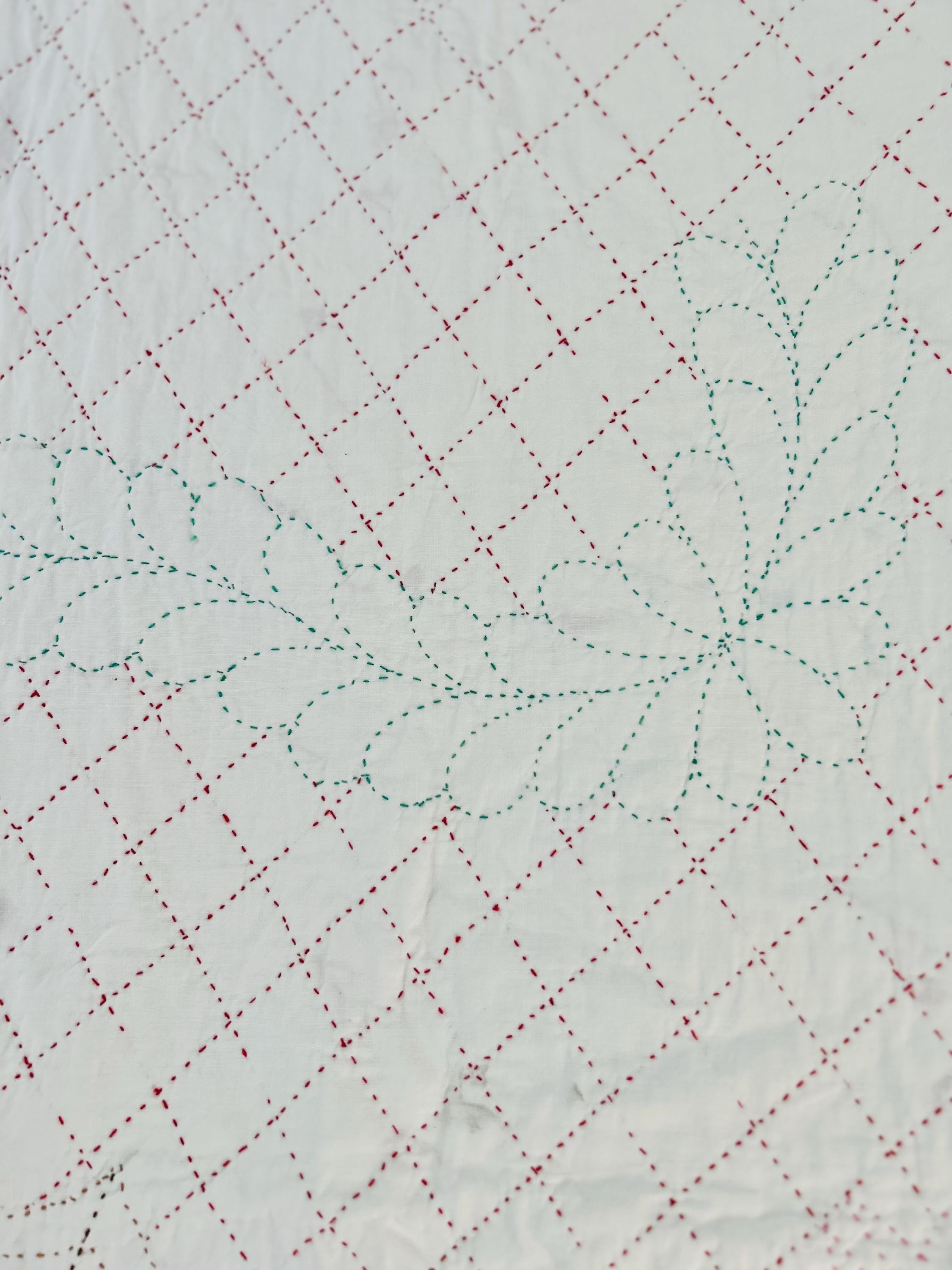 This Wholecloth Quilt, circa 1930s, is interchangeable between the blue and the white sides. The quilting threads are red, yellow, dark blue, green, cheddar/orange, brown and pink and all of them highlight the quilt patterns on both sides of the quilt. The hand quilting is in feathers, feather wreaths, flowers, modified feather/star wreaths, and a geometric cross-and-circle pattern along the borders.